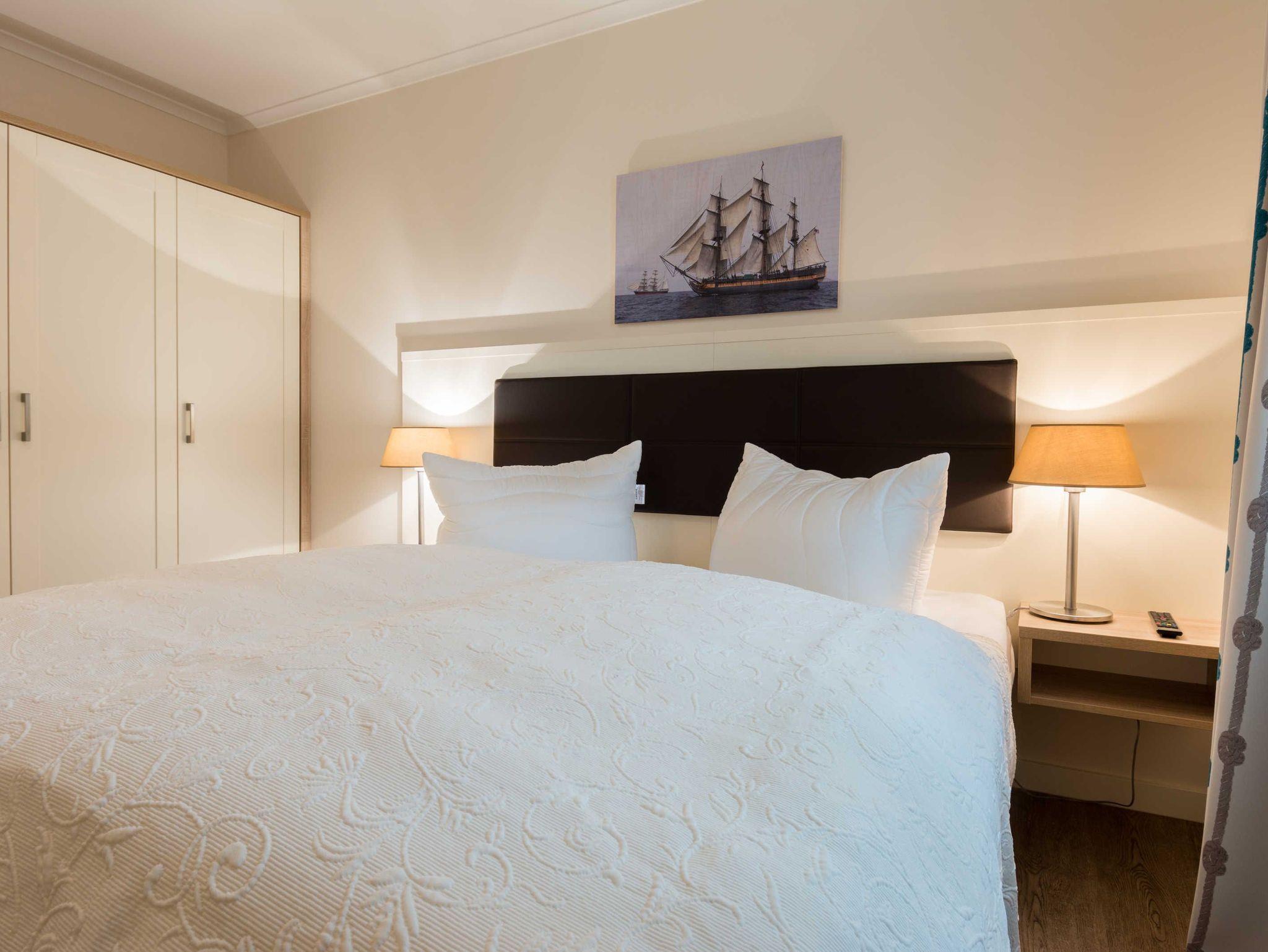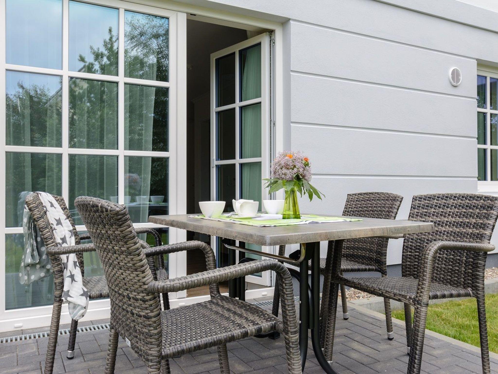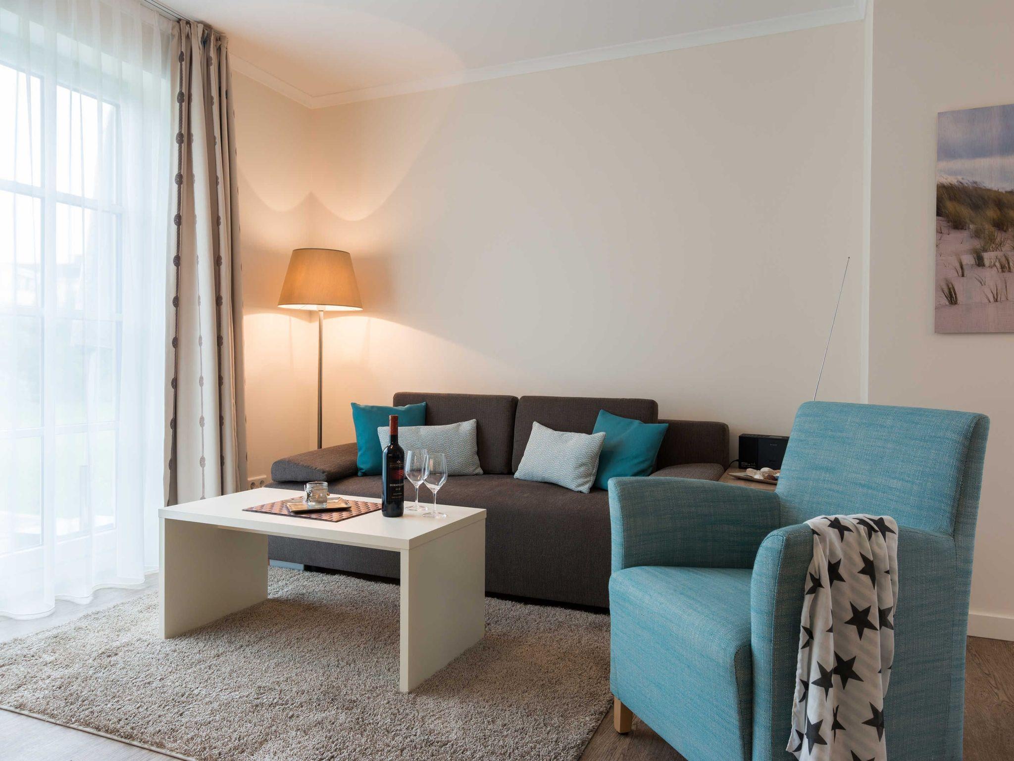 Die Wohnung verfügt über ein Wohn-Esszimmer inklusive offener Einbauküche, ein Schlafzimmer, ein Bad mit ebenerdiger Dusche, eine nach Norden ausgerichtete Terrasse sowie einen PKW-Stellplatz direkt am Haus. Vom Wohnbereich aus haben Sie Zugang zur Terrasse. Die Terrasse ist ausgestattet mit einem Tisch und vier Stühlen für gemütliche Stunden während Ihres Urlaubs. Der Wohnbereich mit Zugang zur Terrasse ist hell, lichtdurchflutet und geschmackvoll eingerichtet. Die bequeme Couchgarnitur mit Recamiere bietet eine weitere Schlafmöglichkeit (LF 150 x 200 cm). Ein Couchtisch sowie ein großer Esstisch mit vier Stühlen, ein Hocker, Flatscreen TV mit DVD-Player und eine kleine Musikanlage gehören ebenfalls zur Ausstattung. Die gut ausgestattete Küchenzeile beinhaltet einen Kühlschrank incl. integriertem 4*Tiefkühlfach, 2-Platten-Glaskeramikkochfeld mit Dunstabzugshaube , Mikrowelle mit Grillfunktion, Kaffeemaschine, Toaster sowie Wasserkocher. Geschirr und Gläser sind in ausreichender Zahl vorhanden. Im Schlafzimmer befindet sich ein komfortables Boxspringbett (180 x 200 cm) mit zwei Einzel- Bandscheiben-Federkernmatratzen, ein geräumiger Kleiderschrank und ein weiterer Flat-TV. An kühlen Herbst- und Wintertagen sorgt in allen Räumen eine Fußbodenheizung für Wärme und Gemütlichkeit.
