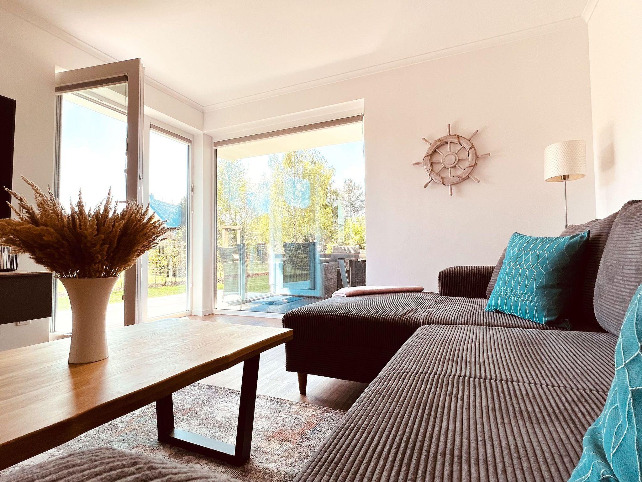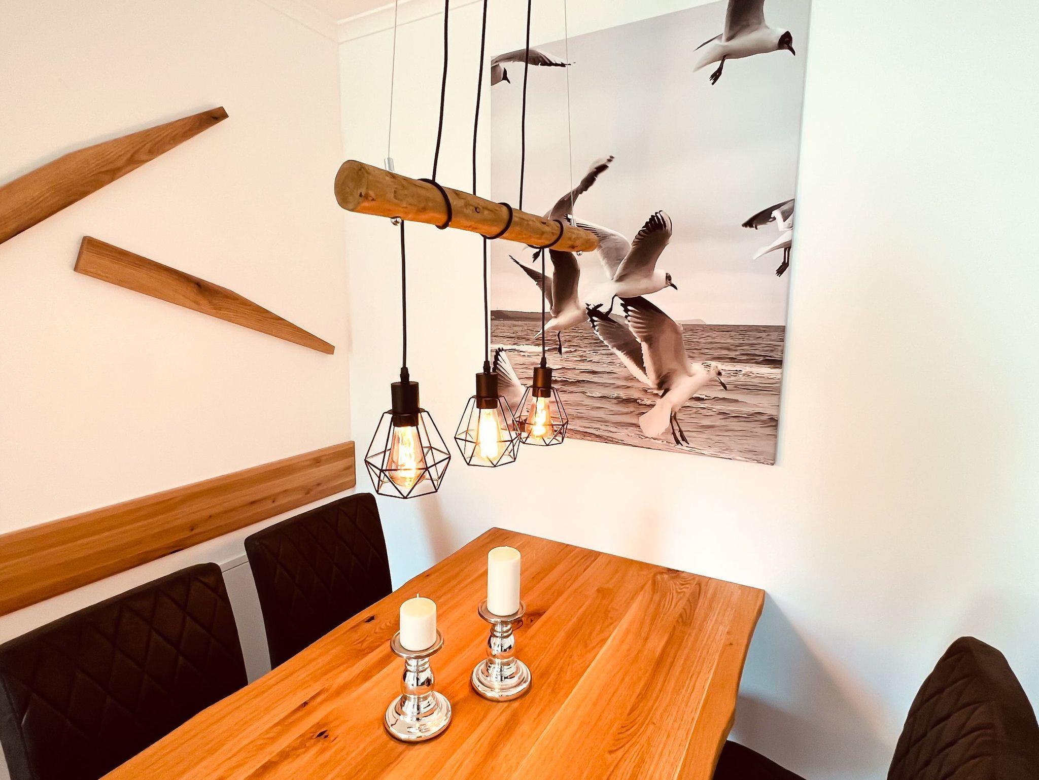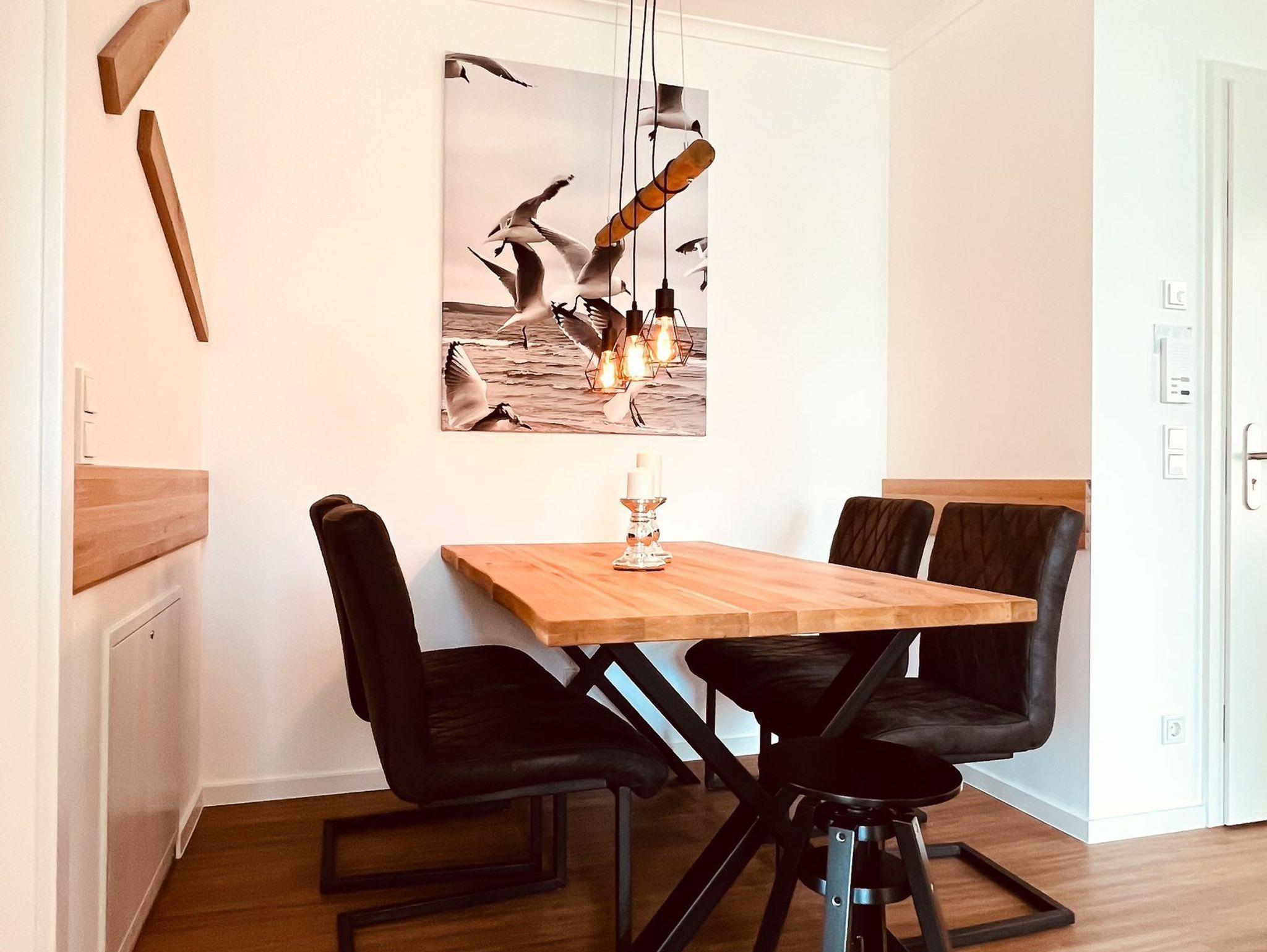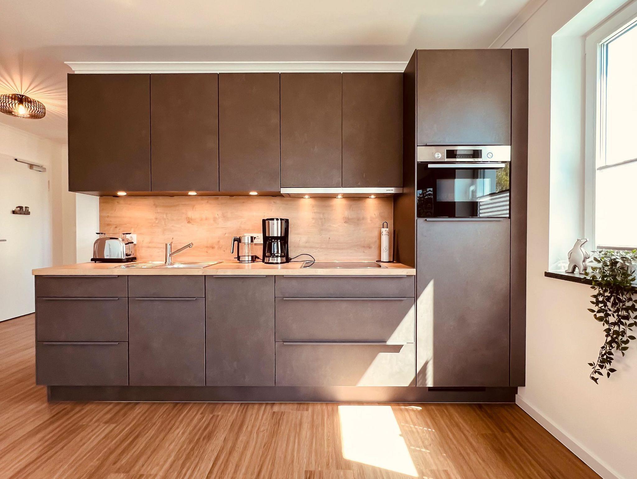 Die geräumige und lichtdurchflutete 3-Zimmer-Ferienwohnung verfügt über eine moderne Einbauküche mit allen Annehmlichkeiten. Neben einem Backofen mit integrierter Mikrowelle und einem Induktionskochfeld befinden sich in der Küche auch ein Geschirrspüler, eine Kühlschrank inklusive Gefrierfach, ein Toaster, eine Kaffeemaschine und ein Wasserkocher. Außerdem ist sie komplett mit Kochzubehör und Geschirr ausgestattet.