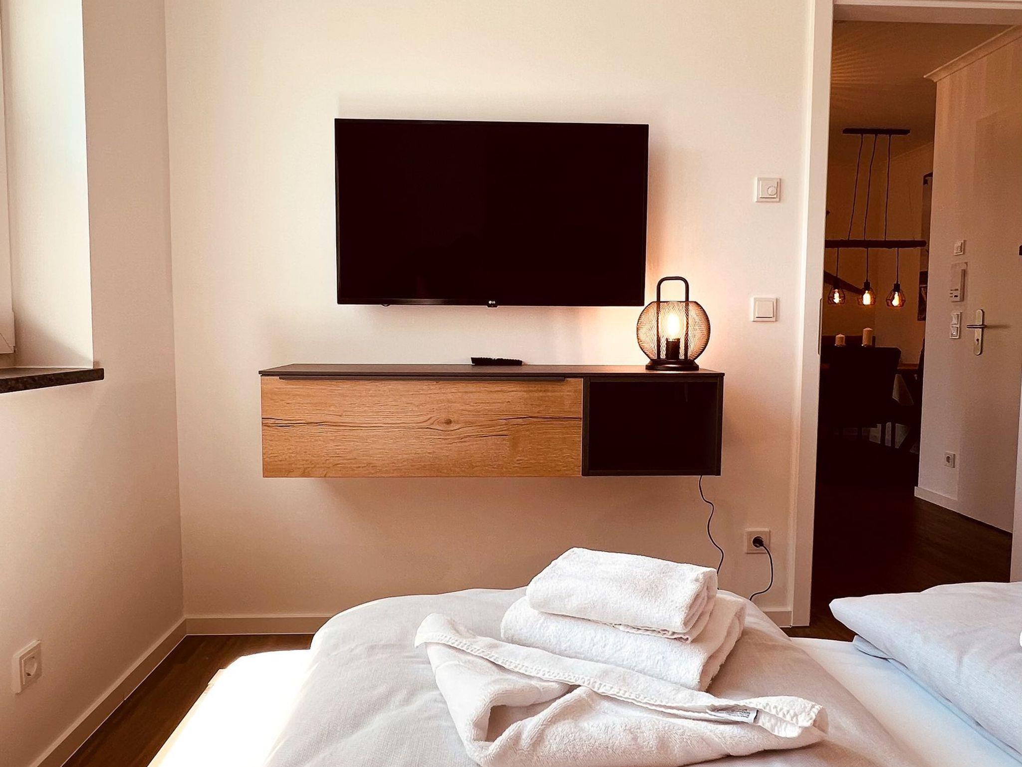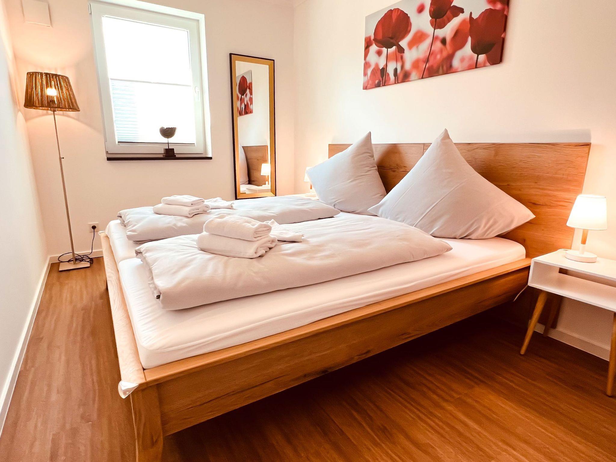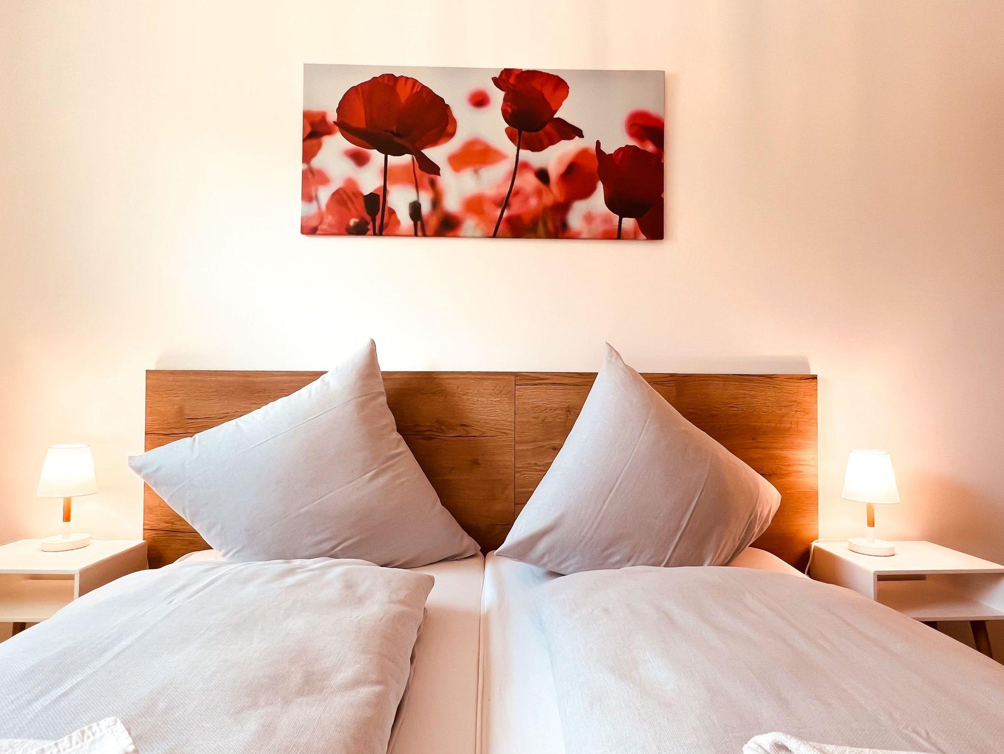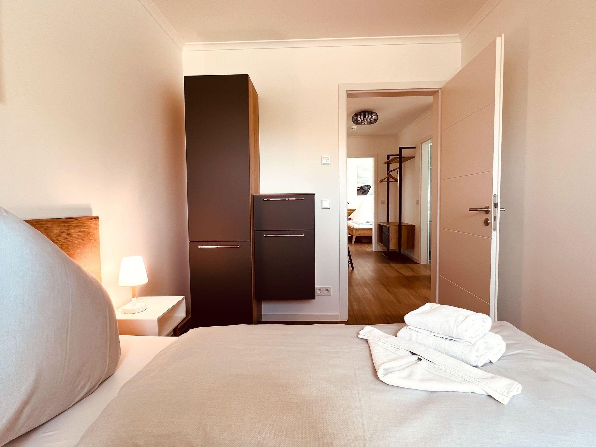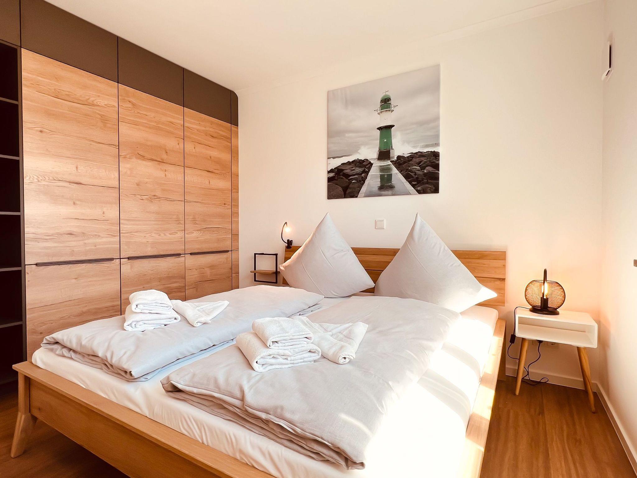 Die Wohnung verfügt insgesamt über zwei Schlafzimmer. Das erste ist mit einem gemütlichen Doppelbett (180 x 200 cm / getrennten Matratzen), einem großen Kleiderschrank und einem Fernseher ausgestattet. Im zweiten befinden sich ein Doppelbett (180 x 200 cm / getrennten Matratzen) und ein kleinerer Schrank für zusätzlichen Stauraum.