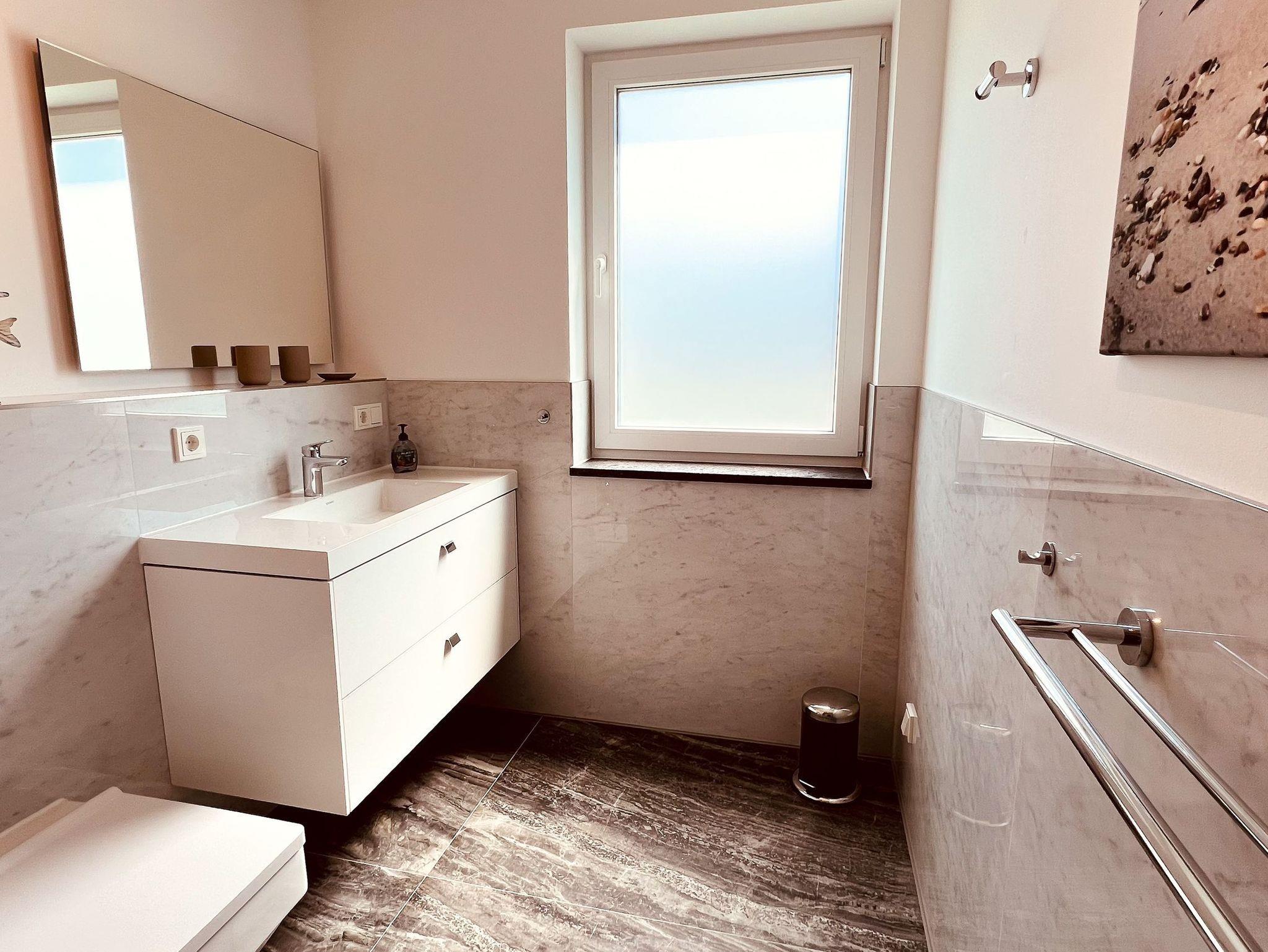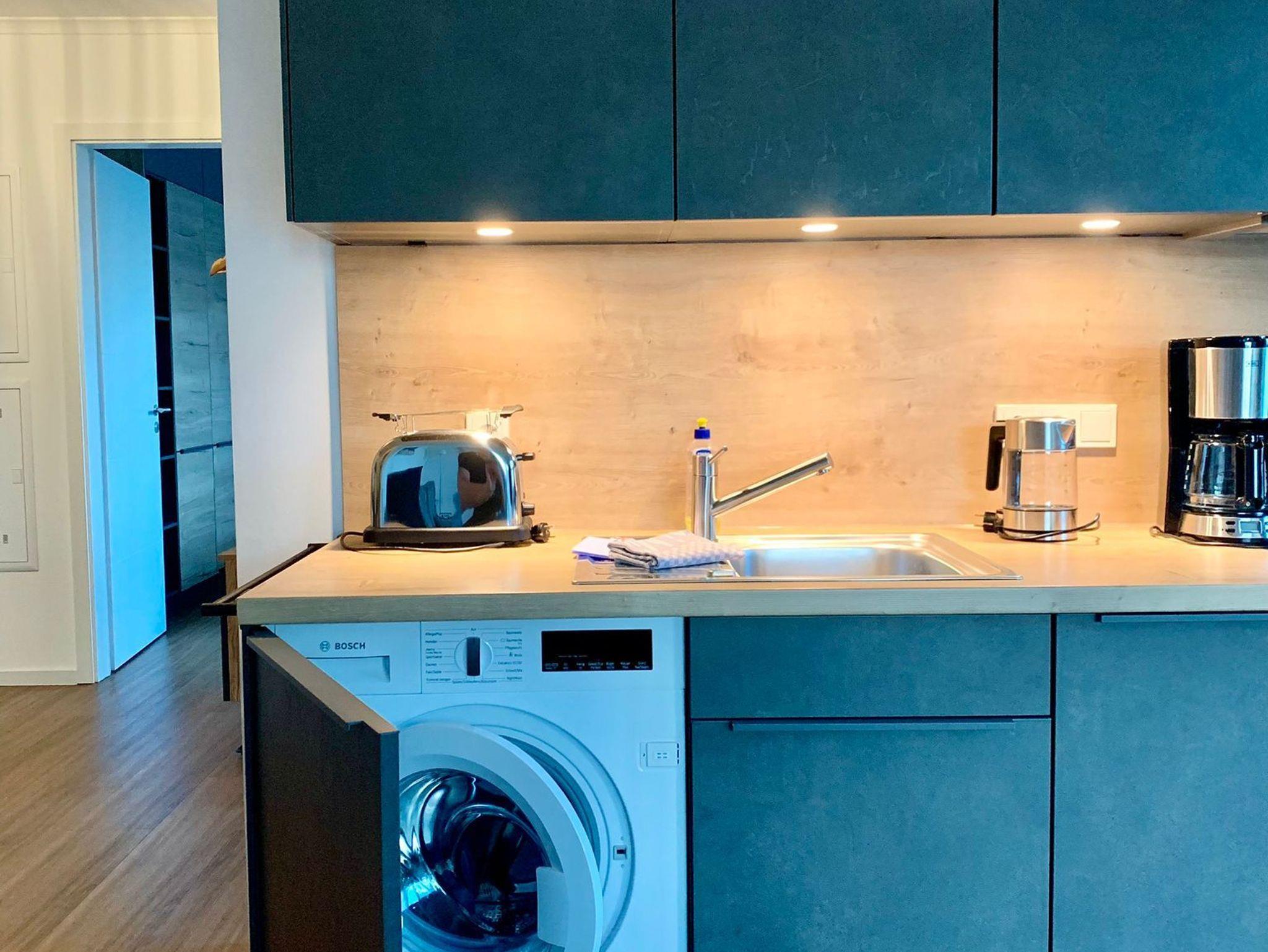 Das helle Badezimmer ist mit einem Waschtisch mit großem Spiegel und einem Haartrockner ausgestattet. Zusätzlich stehen ein Staubsauger und ein Wäscheständer zur Verfügung. Besonderheit der Wohnung ist zudem, die in der Küchenzeile integrierte Waschmaschine, welche besonders bei längeren Aufenthalten ein willkommener Helfer ist.