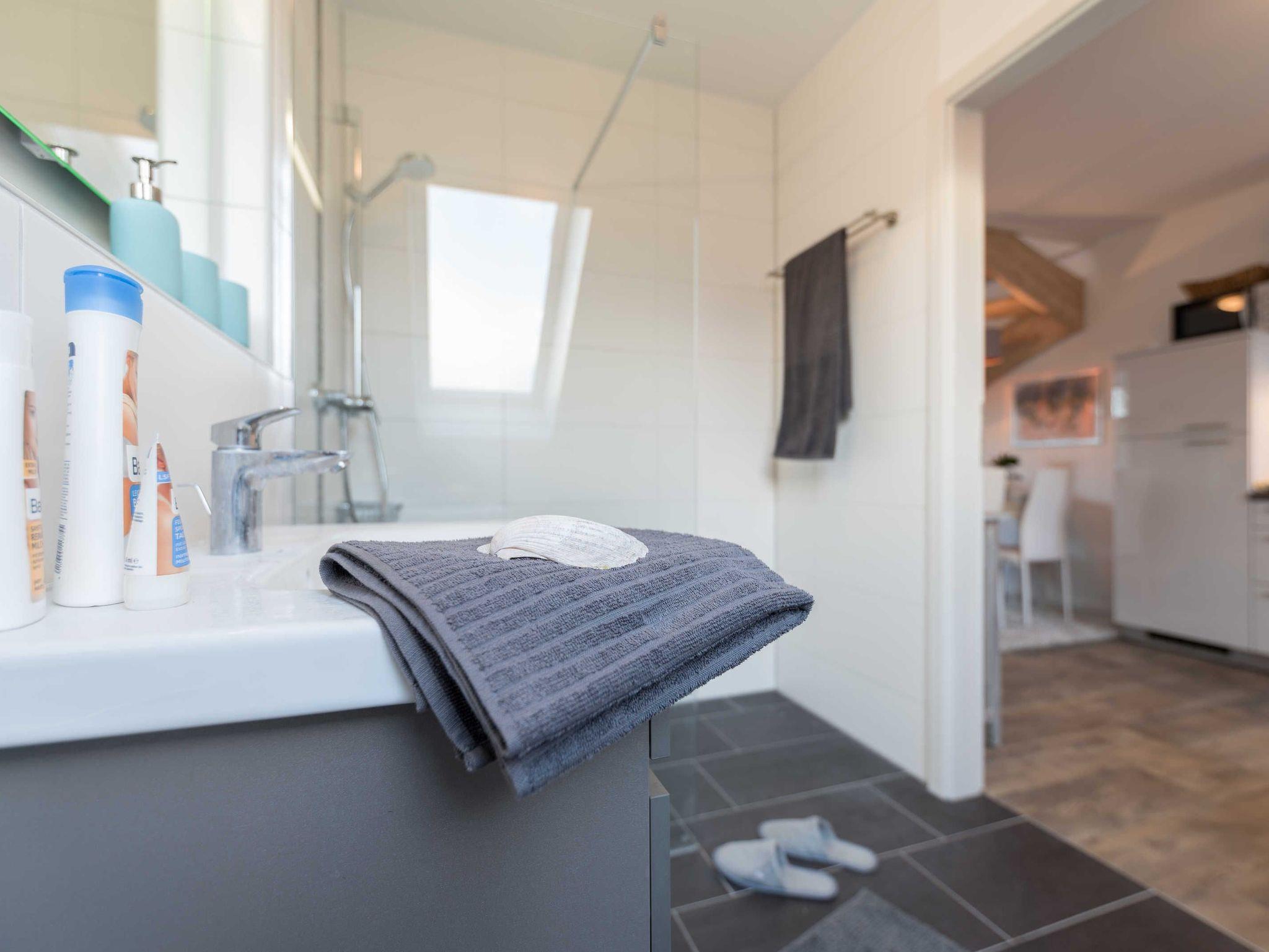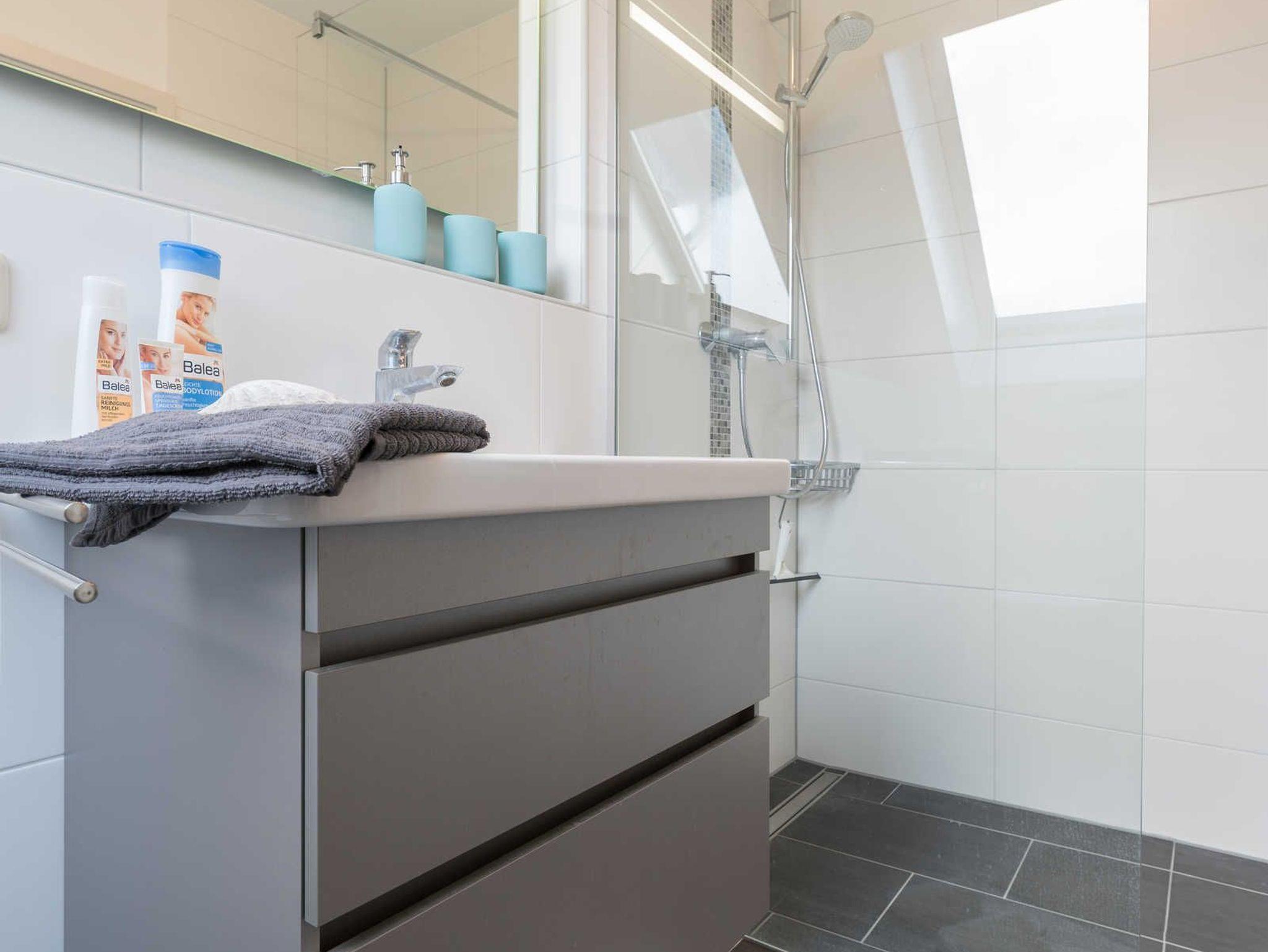 Das helle Badezimmer mit bodengleicher Dusche verfügt über ein großes Fenster mit Plissee, einen großen Waschtisch mit Unterschrank, eine Toilette, Ablage-Regale, einen Handtuchheizkörper, einen Vergrößerungsspiegel und einen Haartrockner.