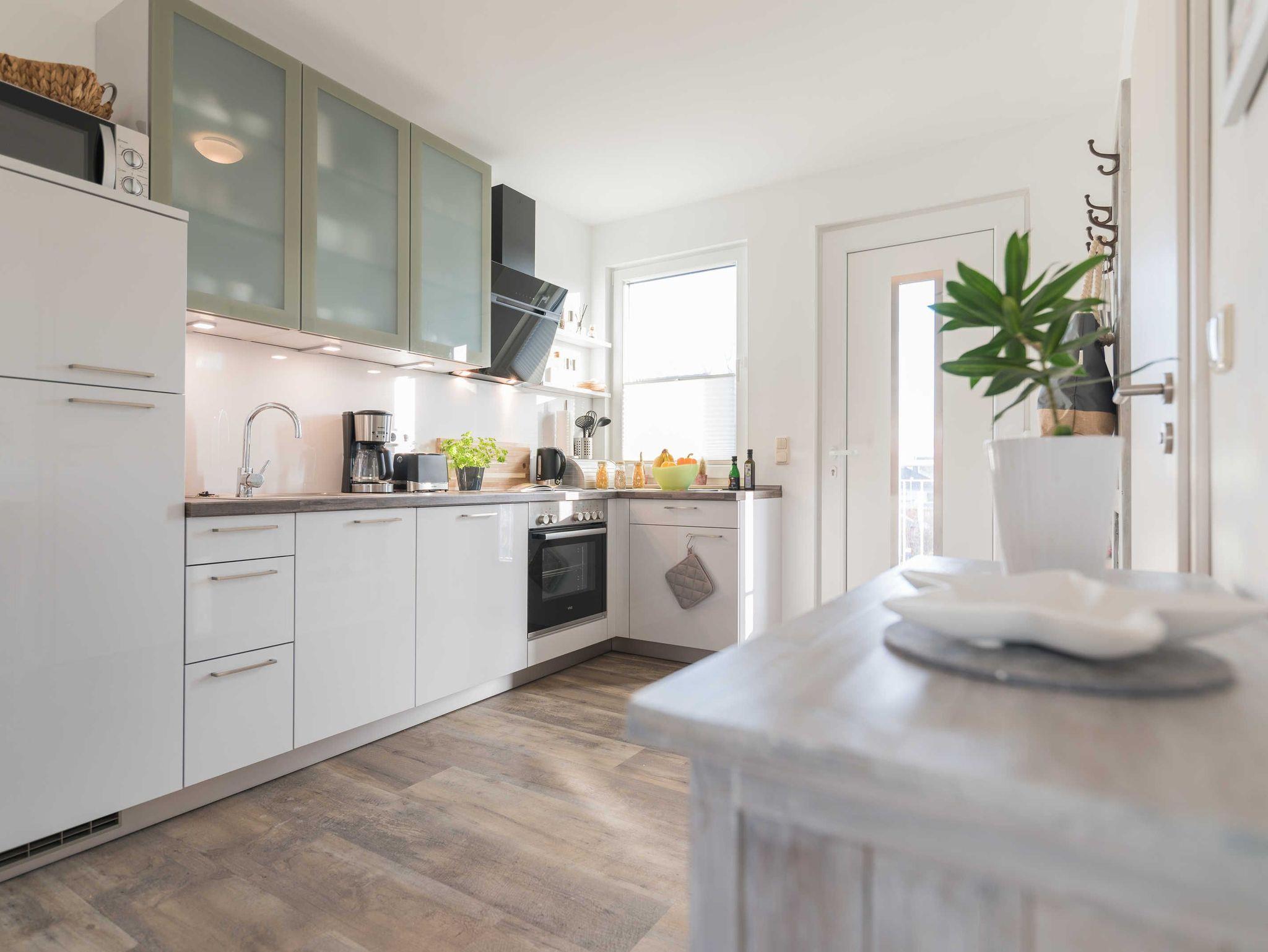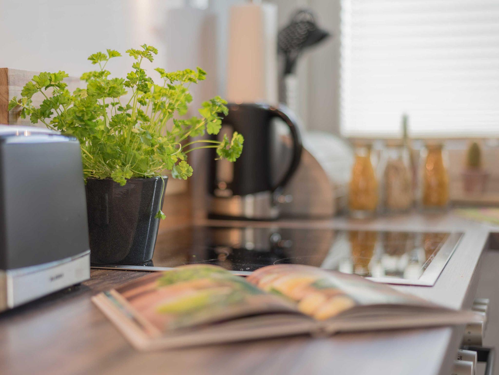 Die hochwertige Einbauküche verfügt über einen großen Kühlschrank mit Tiefkühlfach, Geschirrspüler, 4er-Ceranfeld, Einbau-Herd mit Grillfunktion, Dunstabzugshaube, Kaffeemaschine, Toaster, Wasserkocher sowie Mikrowelle mit Grillfunktion. Der Esstisch mit 4 bequemen Stühlen ist zudem bestens geeignet für gesellige Spieleabende.
