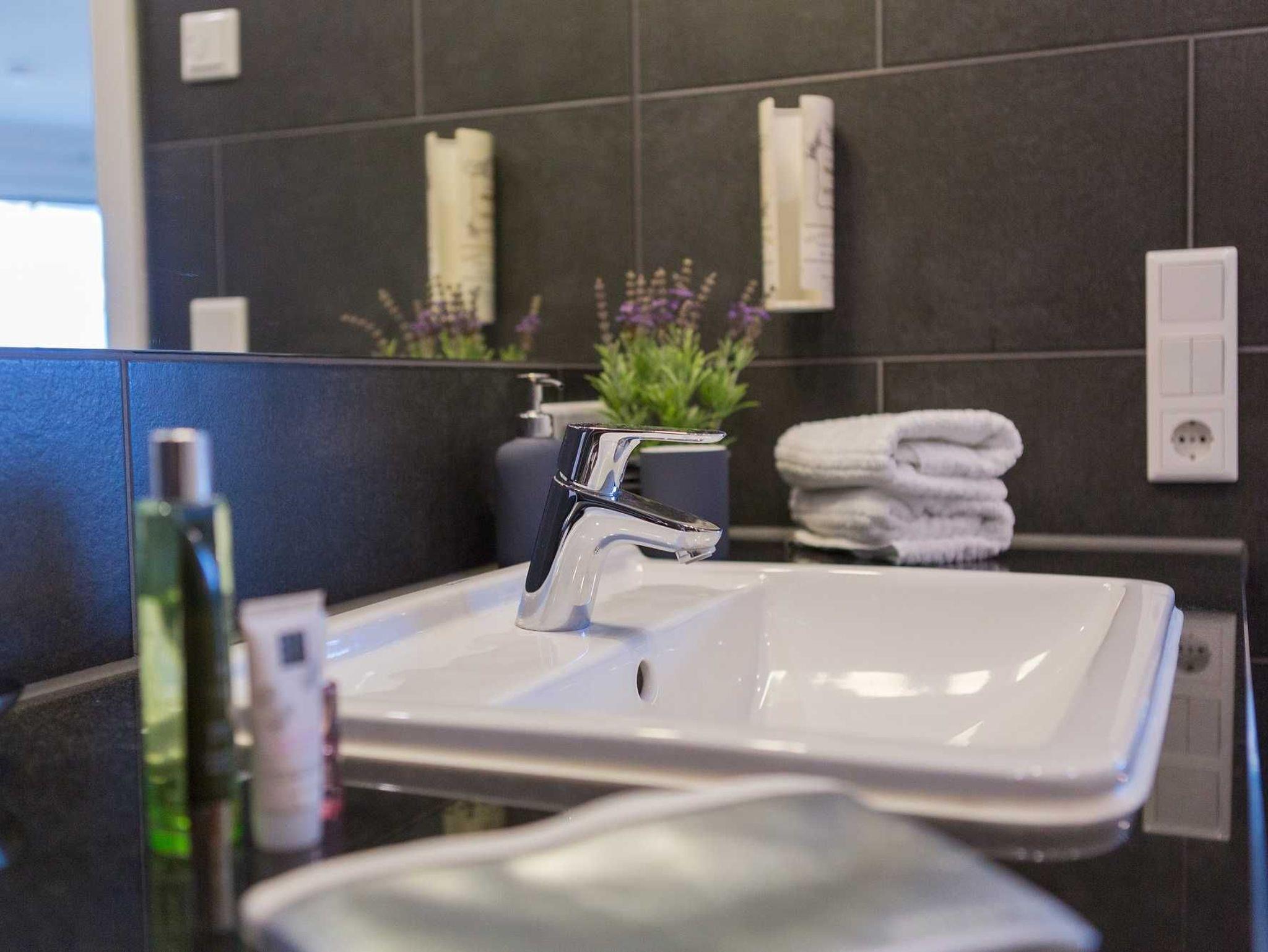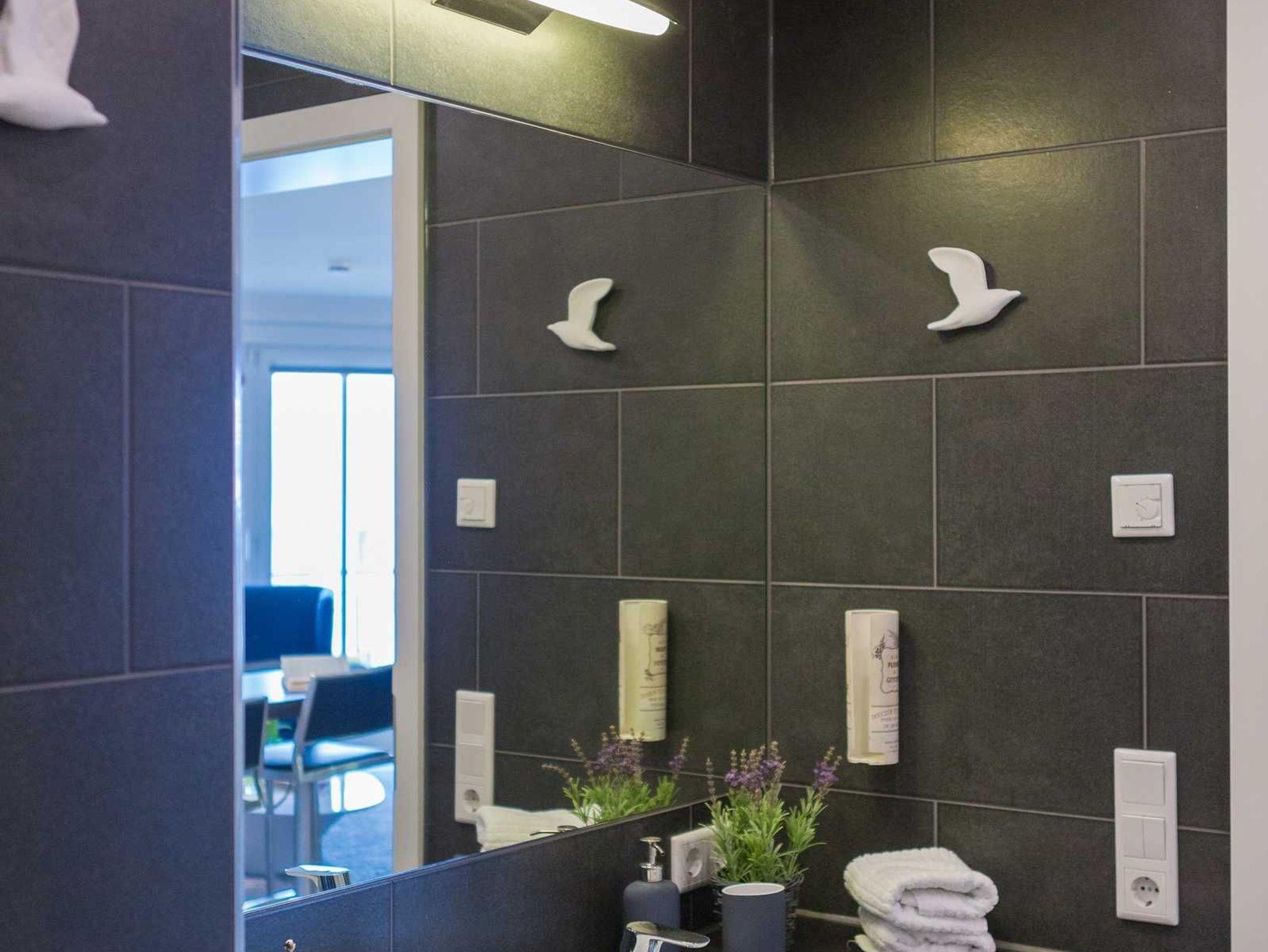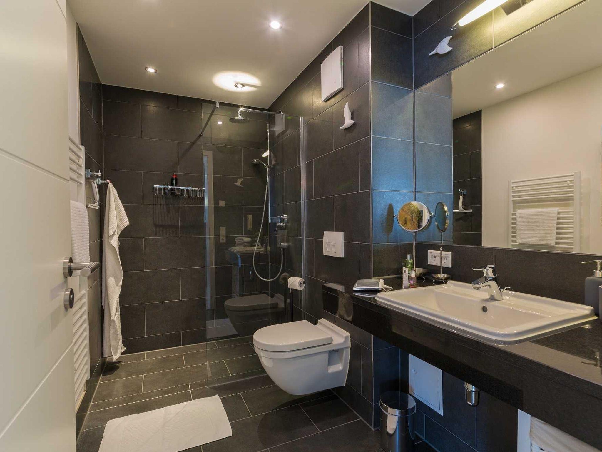 Das Bad ist deckenhoch mit Marmorfliesen gestaltet. Eine Glasabtrennung zum Duschbereich mit großer Kopfdusche sowie der definierte Waschtisch mit großem Spiegel vervollständigen das moderne Design.