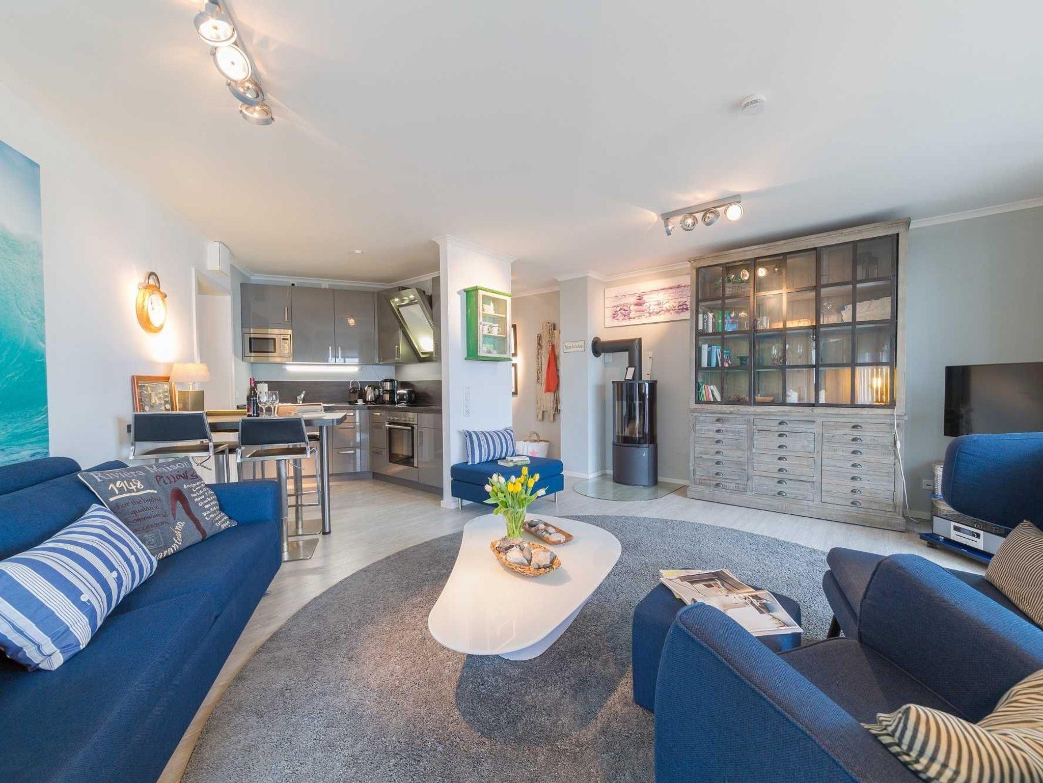 Das maritim eingerichtete Wohnzimmer verfügt über einen HD-Flatscreen-TV, einen Blu-ray/CD-Player sowie eine Bluetooth-Radioanlage. Zwei hochwertige Ohrensessel sowie ein mit wenigen Handgriffen aufklappbares Schlafsofa laden zum Kuscheln ein. Ein Kaminofen sorgt an kühleren Abenden für gemütliche Wärme (Kaminholz muss selbst organisiert werden.)