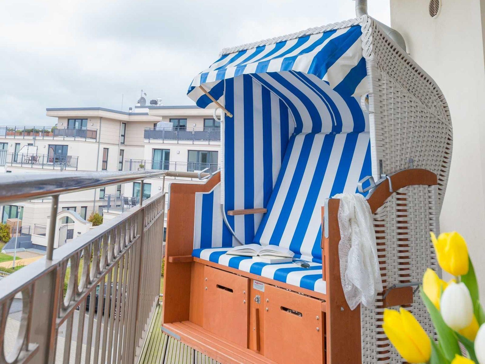 Der herrliche Balkon in Nord-Westausrichtung mit Blick auf die Ostsee ist mit einer kleinen Rattan-Sitzecke sowie einem Strandkorb ausgestattet. Bei Windlichtern und Kerzen kann man den Tag entspannt ausklingen lassen.