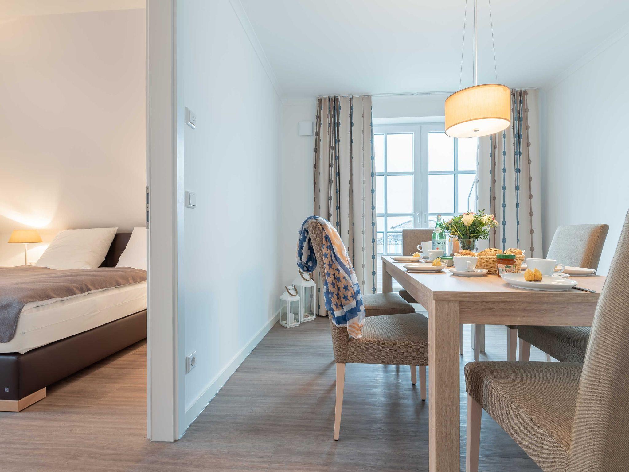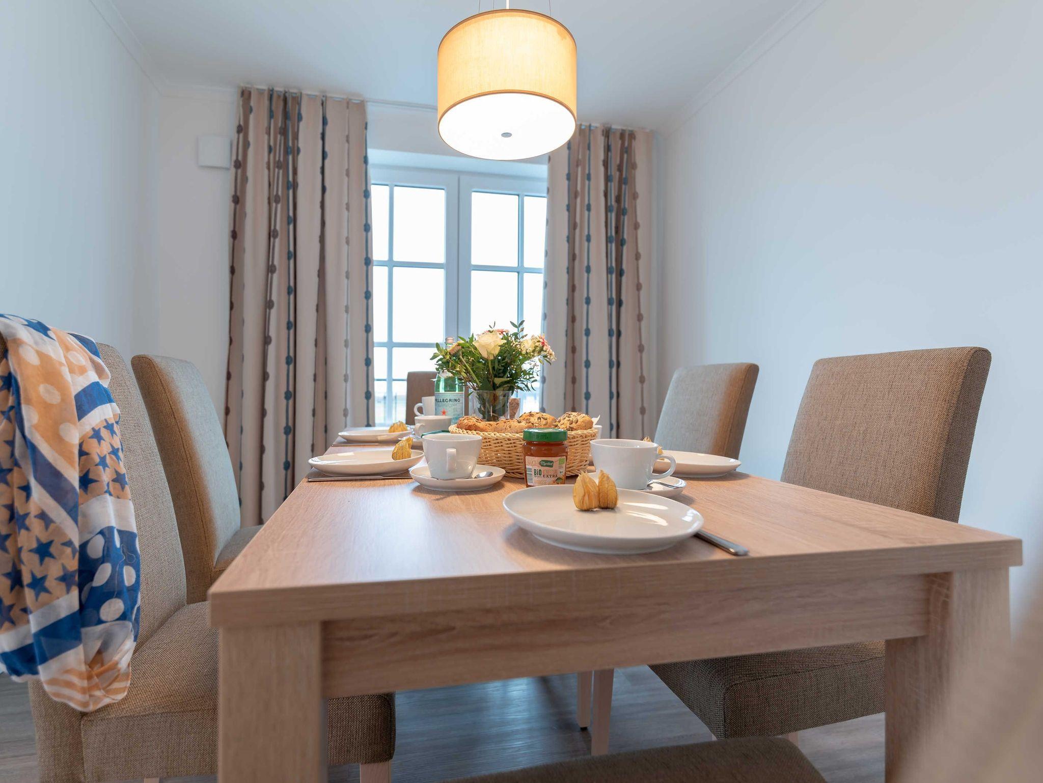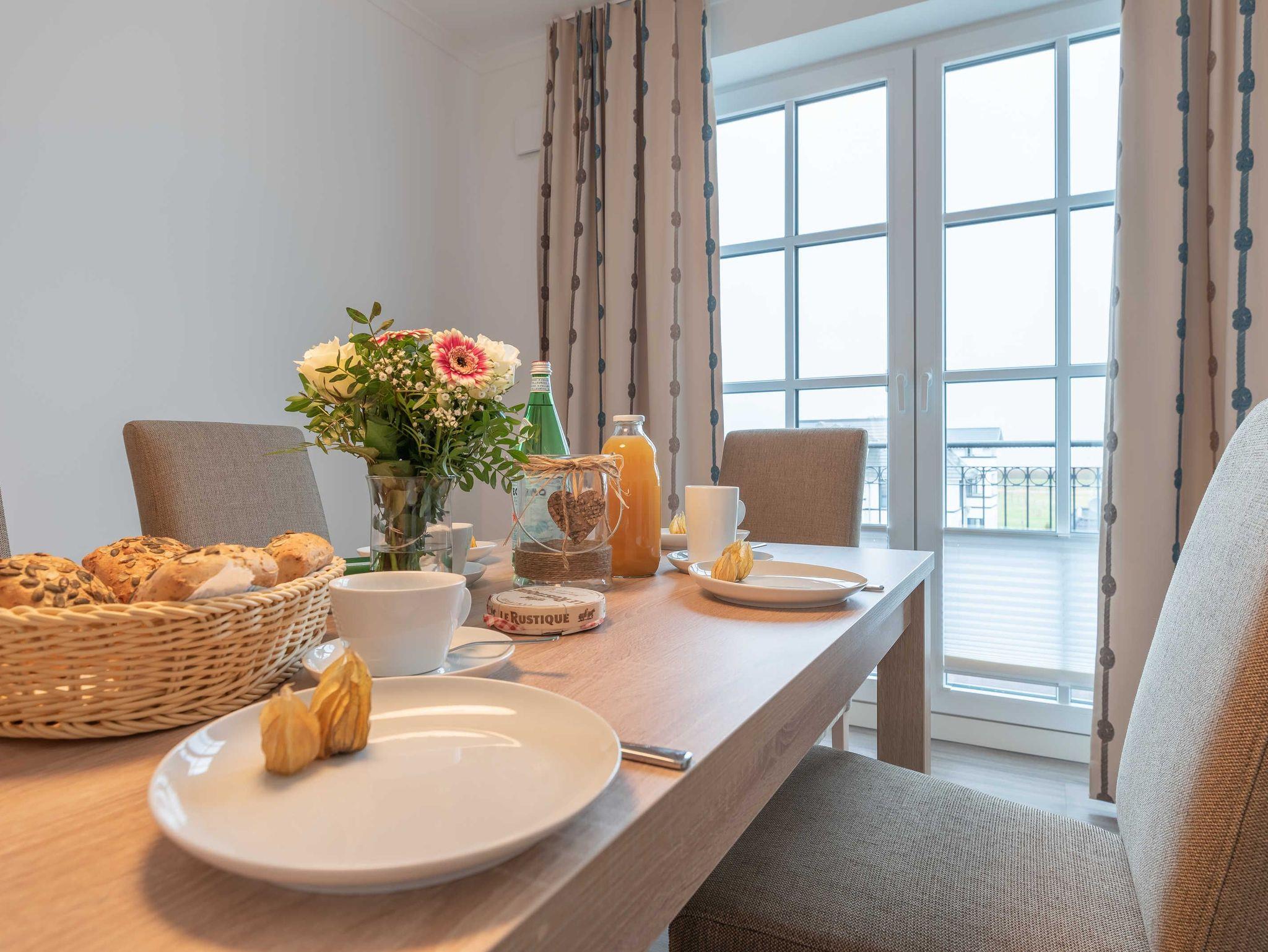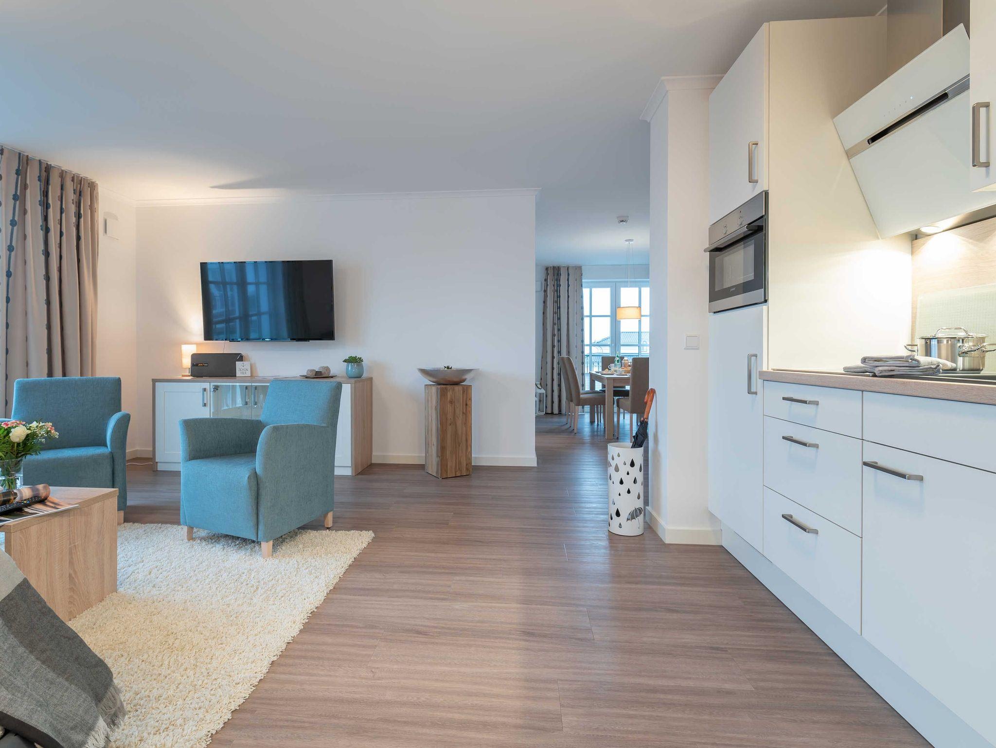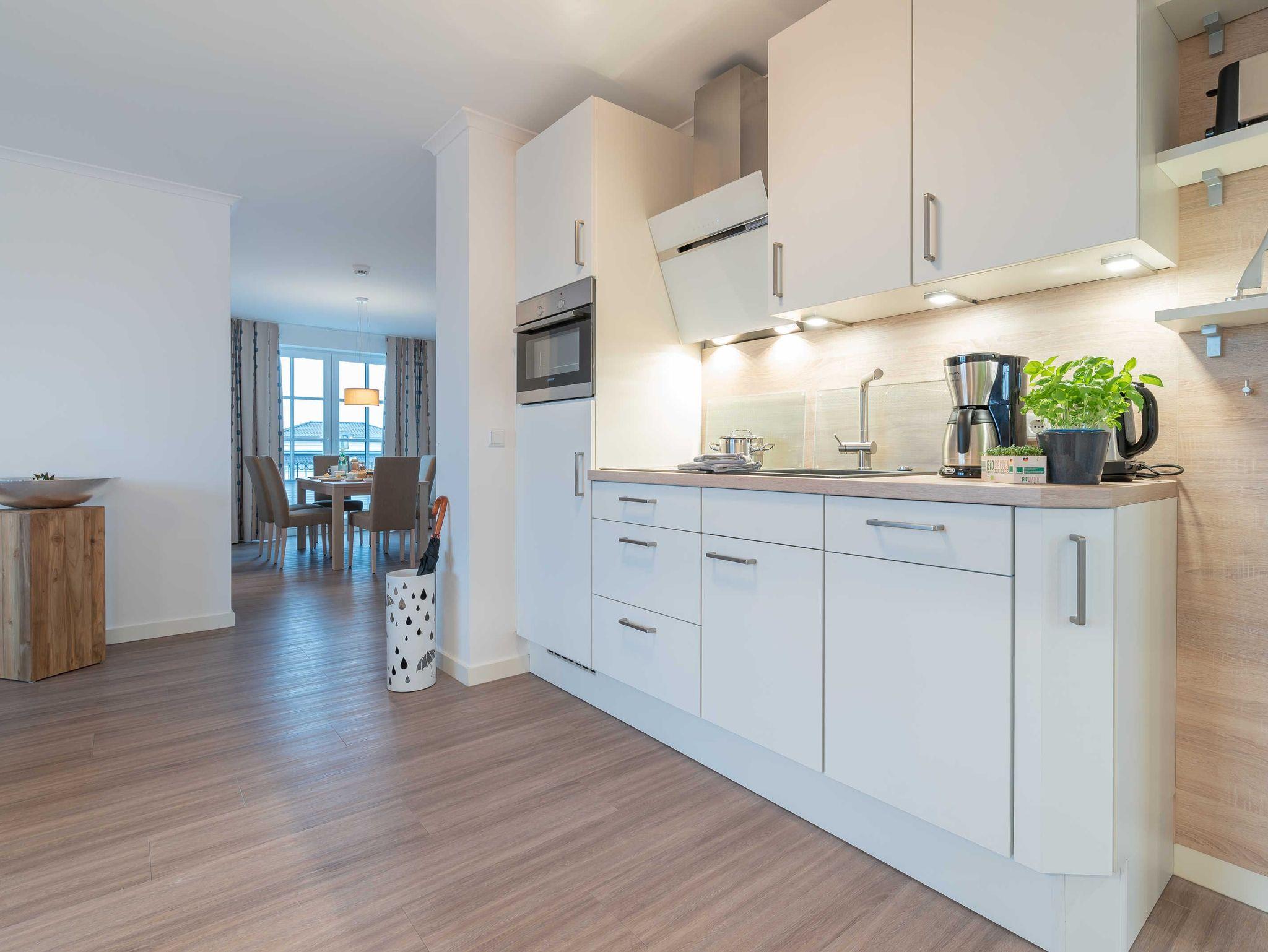 Das helle Wohnzimmer in direkter Süd-West-Ausrichtung besitzt einen gemütlichen Couch- und Fernsehbereich mit einem 55 Zoll-TV, einem DVD-Player und einer Musikanlage inklusive CD-Player und Radio. Die hochwertige Einbauküche verfügt über ein Vier-Feld-Cerankochfeld, einen Backofen, einen Geschirrspüler, einen Kühlschrank mit Tiefkühlfach sowie umfangreiches Zubehör. Im angrenzenden Esszimmer mit direktem Balkonzugang haben Sie die Möglichkeit bei genußvollen Mahlzeiten oder gemütlichen Spieleabenden direkt auf die Ostsee zu blicken.