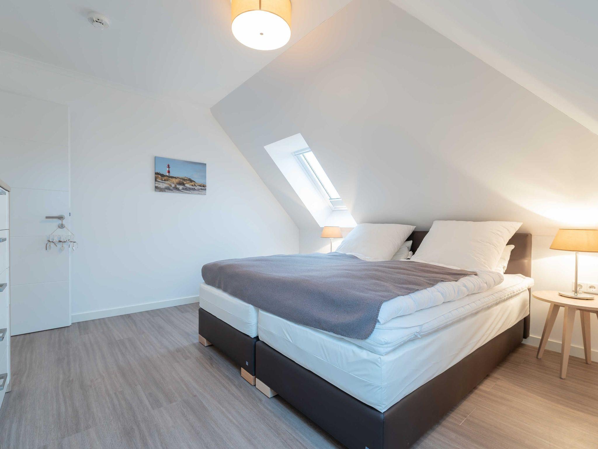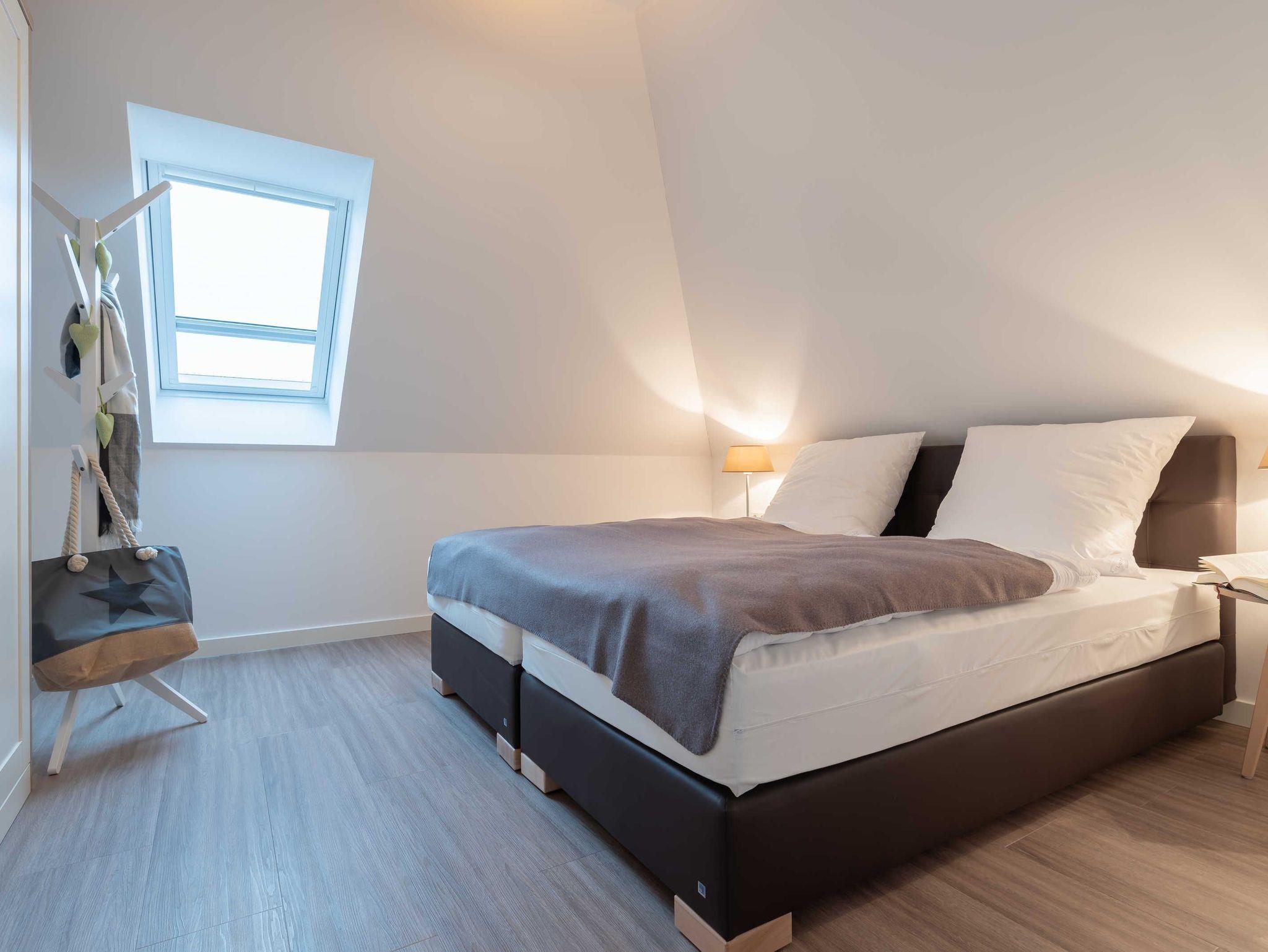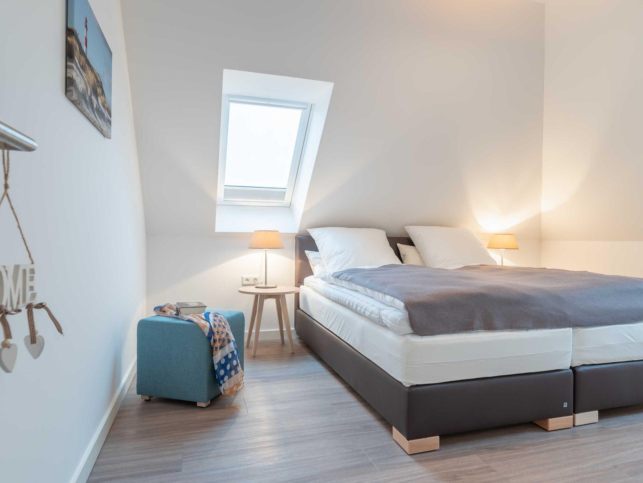 Die beiden Schlafzimmer sind jeweils mit hochwertigen Boxspringbetten als Doppelbetten (Matratzen je 90 x 200 cm) und geräumigen Schrankelementen ausgestattet. Zusätzlich enthält eines der Schlafzimmer einen zusätzlichen 43 Zoll-TV und einen Schranktresor.
