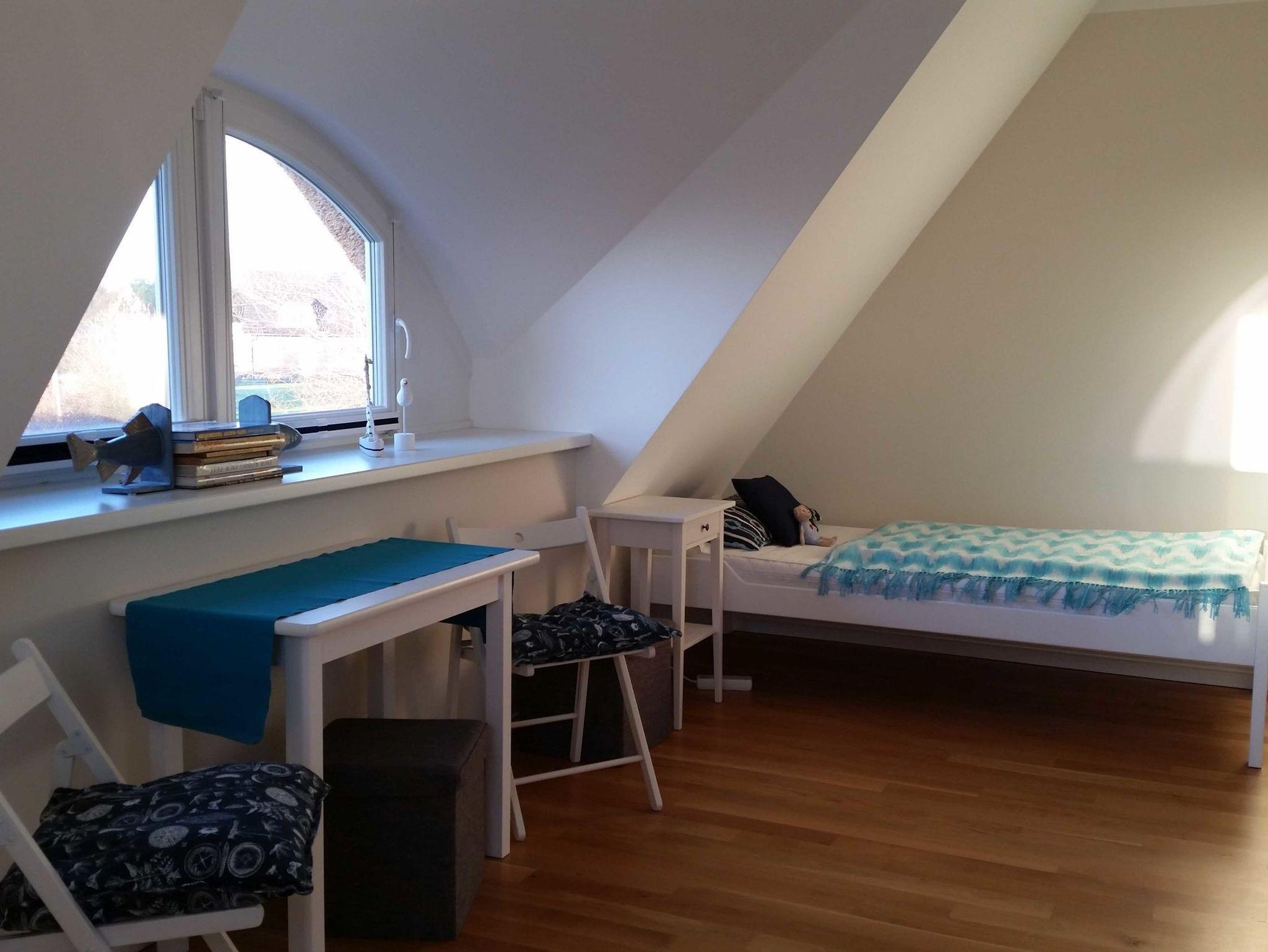 Beide Schlafzimmer liegen im Obergeschoss. Das erste besitzt ein 1,80 m breites Doppelbett und ein Smart-TV Gerät. In dem zweiten stehen zwei Einzelbetten. Eines davon hat ein untergeschobenes Rollbett. In den Kleiderschränken ist ausreichend Platz für die Urlaubsgarderobe.