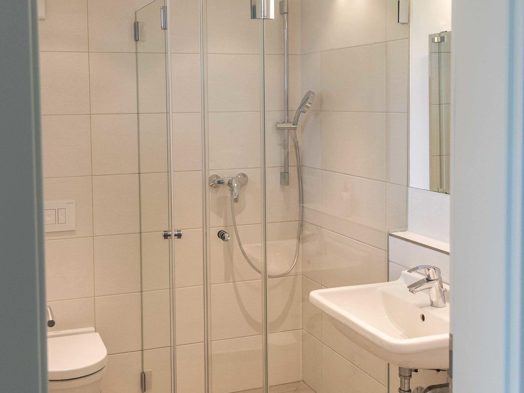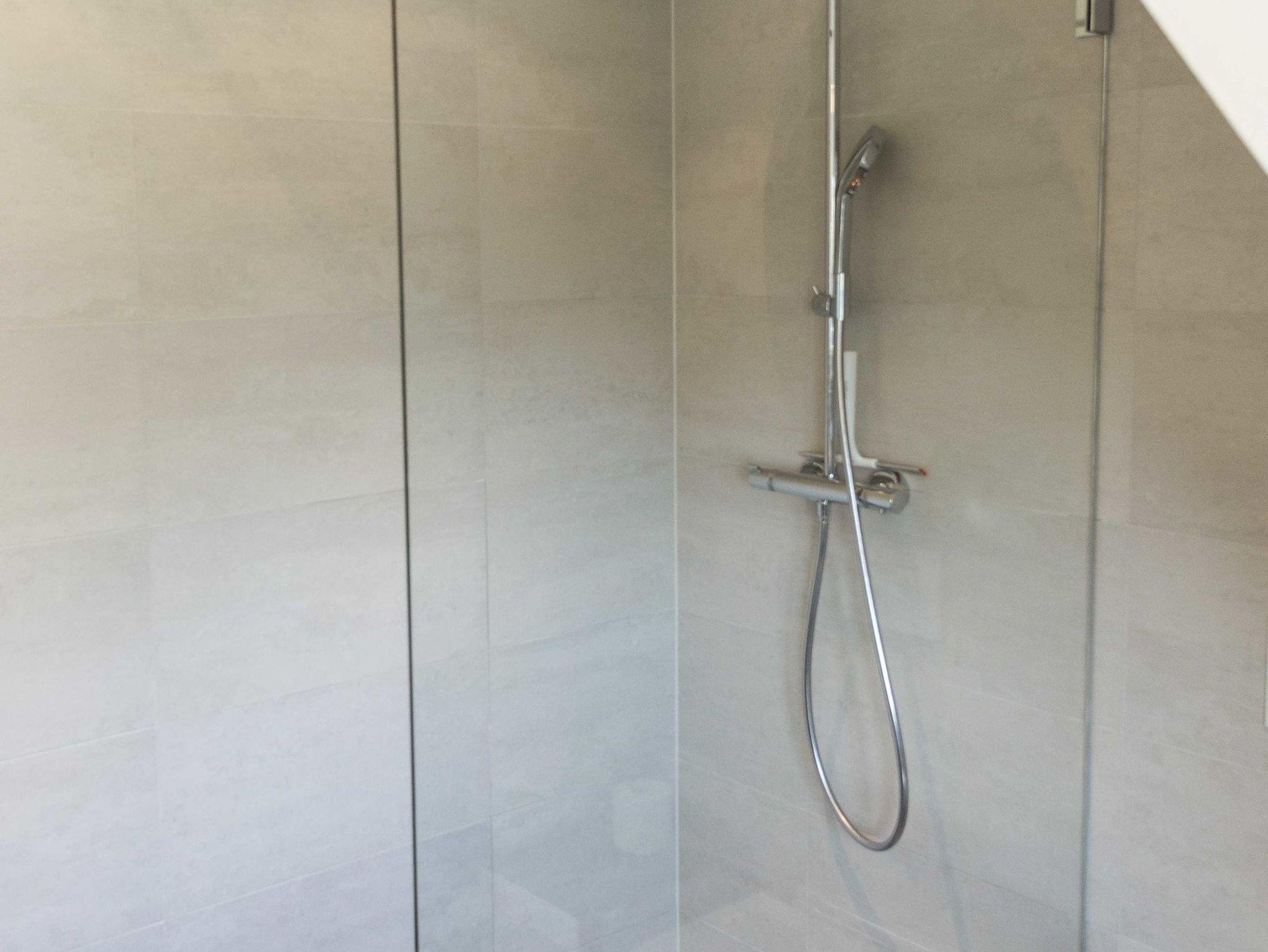 Das Ferienhaus verfügt über zwei Bäder mit einer jeweils verglasten Dusche, einer Handtuchheizung und einem WC. In dem sehr geräumigen Bad im Obergeschoss ist eine angenehme Regendusche installiert.