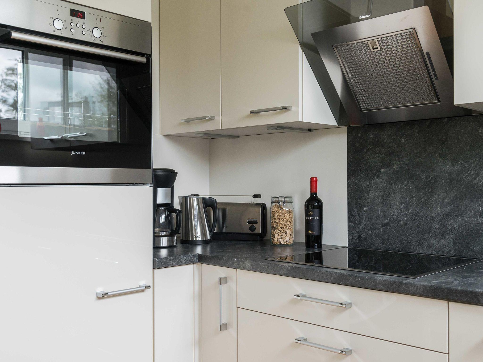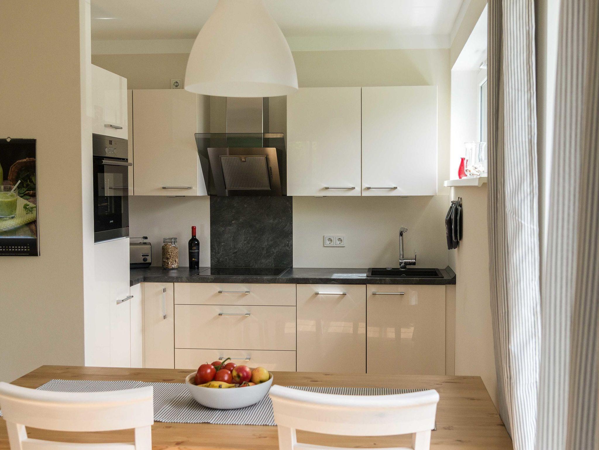An den großzügig konzipierten Eingangsbereich schließt sich der Wohnraum mit der offenen, modernen Einbauküche an, welche mit allen notwendigen Geräten (Cerankochfeld, Backofen, Kühlschrank mit Gefrierfach, Geschirrspülmaschine, Kaffeemaschine, Toaster, Wasserkocher) ausgestattet ist.