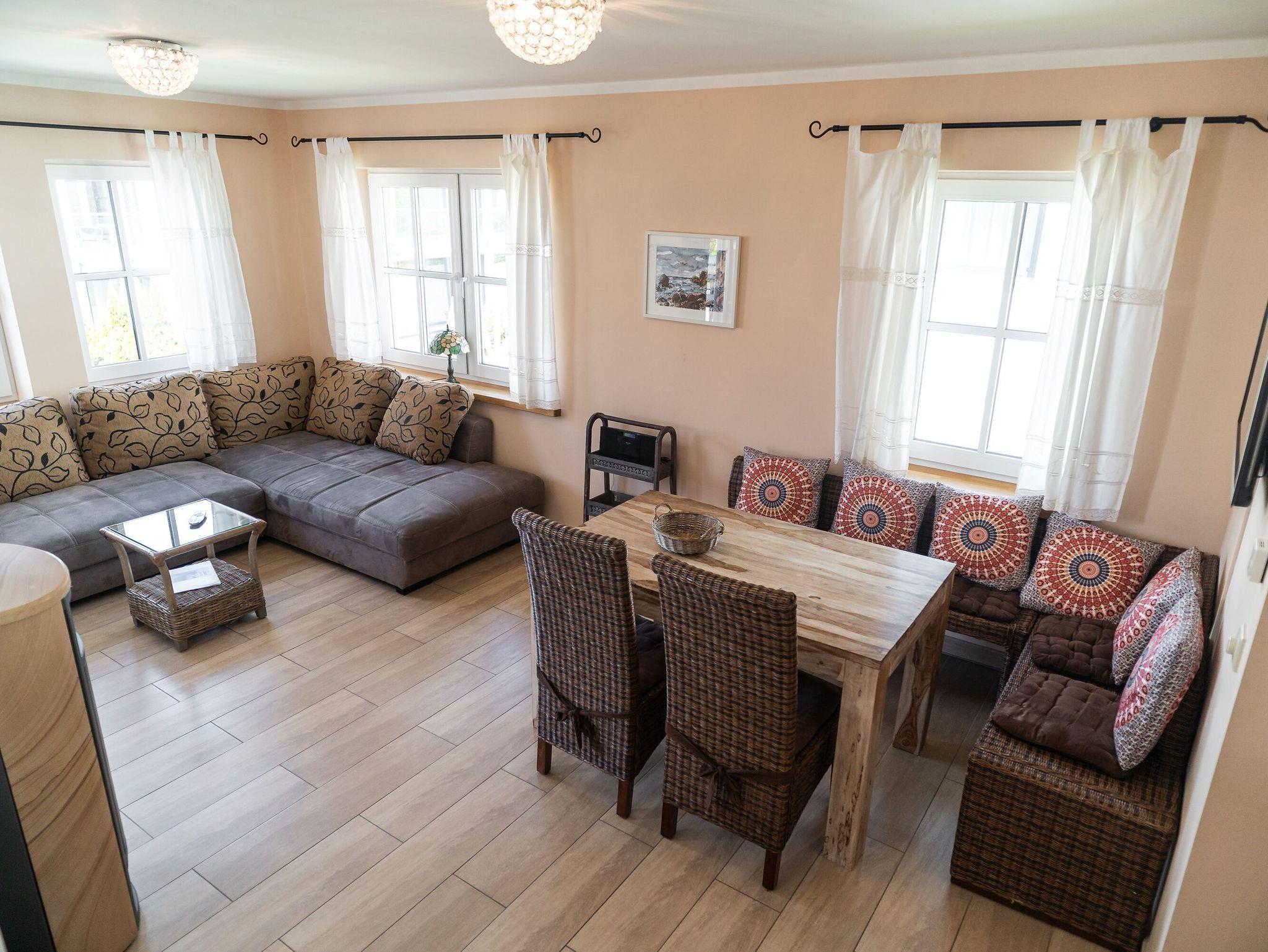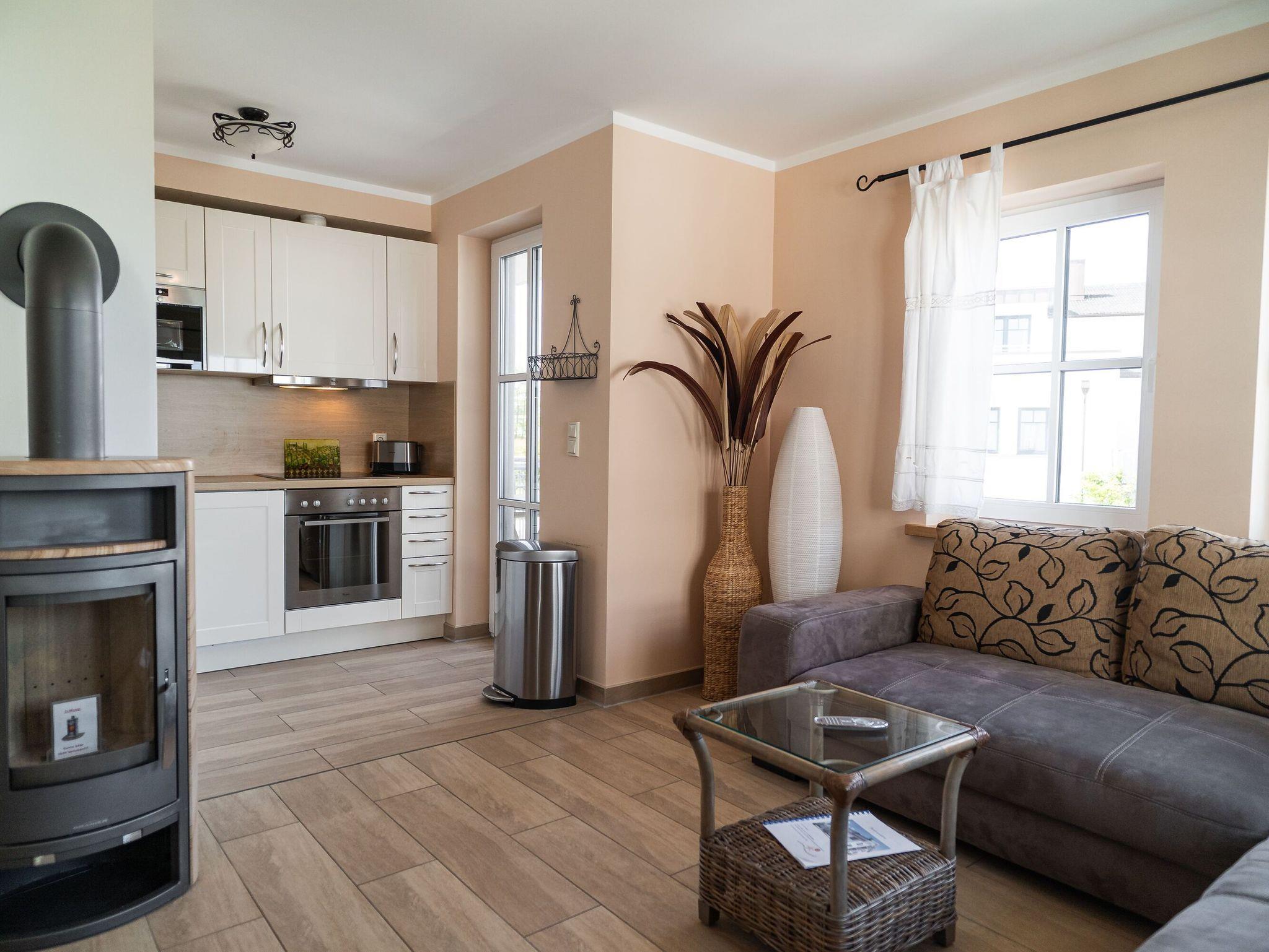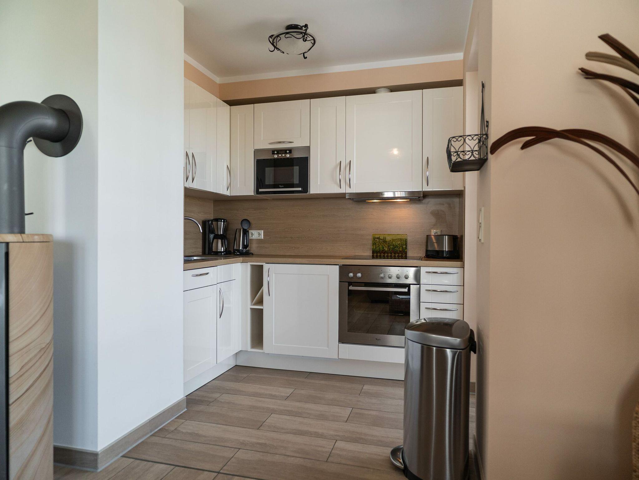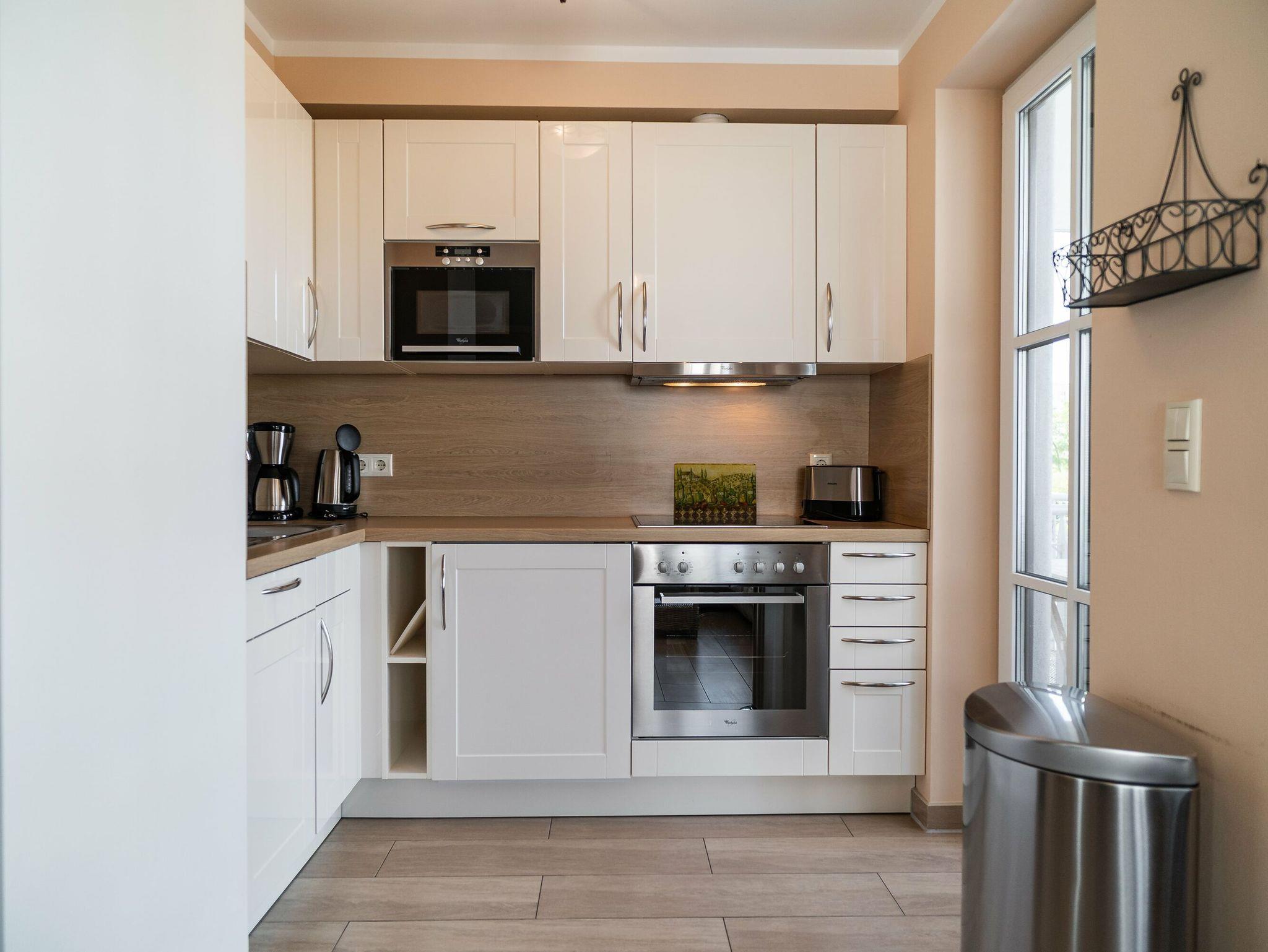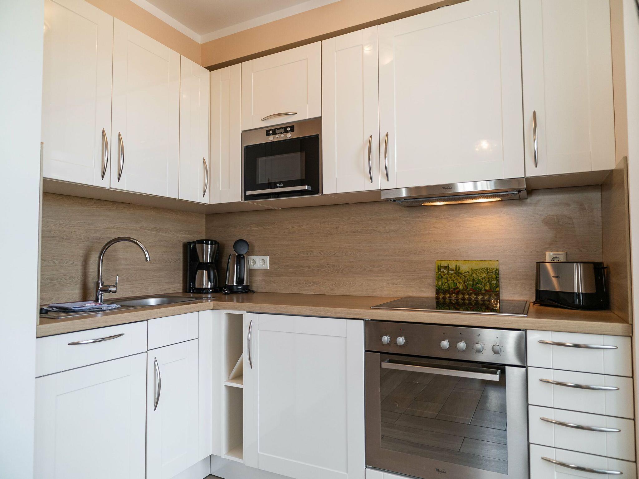 Die voll ausgestattete Einbauküche beinhaltet einen Kühlschrank mit Gefrierfach, einen Backofen und einen Geschirrspüler. Selbstverständlich stehen Ihnen auch eine Kaffeemaschine, ein Wasserkocher, ein Toaster und eine Mikrowelle zur Verfügung. Der Essbereich lädt mit einem großen Esstisch, zwei Stühlen und einer bequemen Sitzecke zu gemeinsamen Mahlzeiten und geselligen Spielabenden ein.