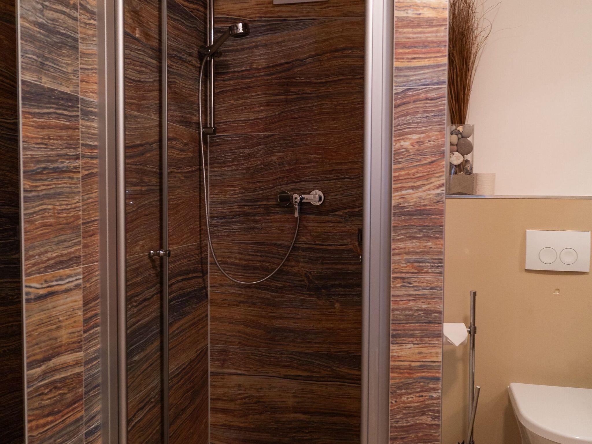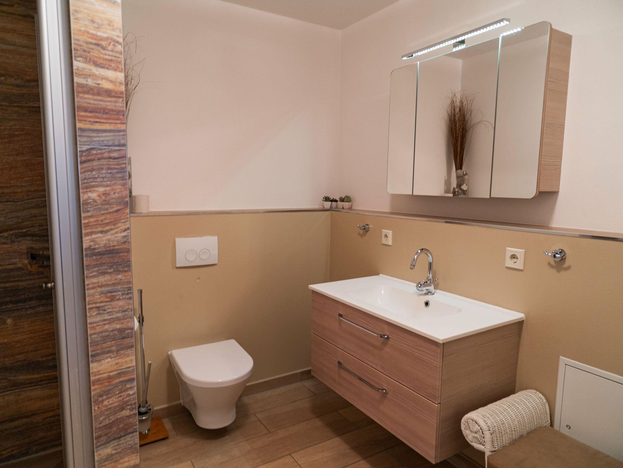 Das modern eingerichtete Badezimmer ist mit einer bodengleichen Dusche mit spannender Fliesenoptik, einem Waschtisch mit großem Spiegel und einem Haartrockner ausgestattet.