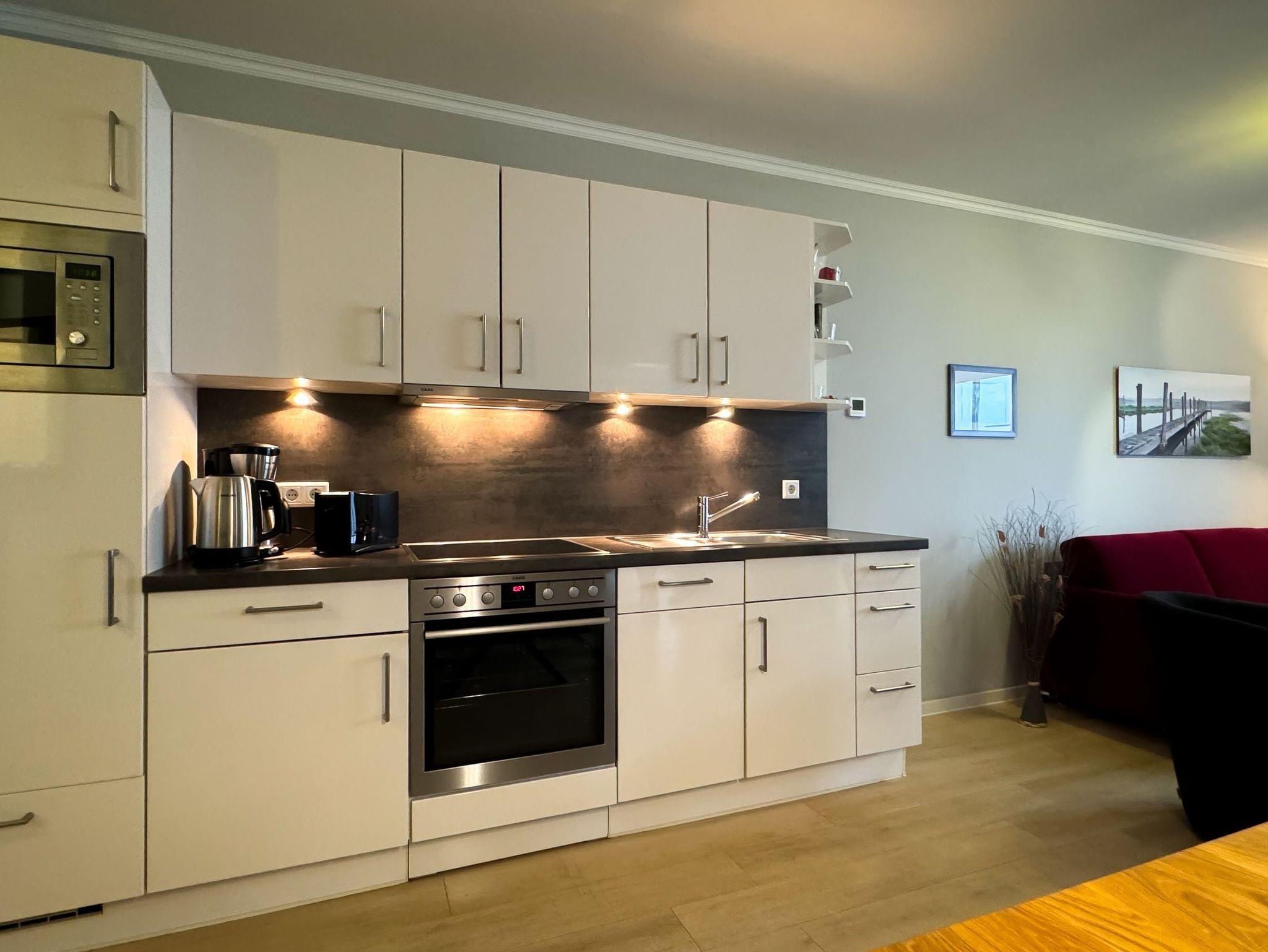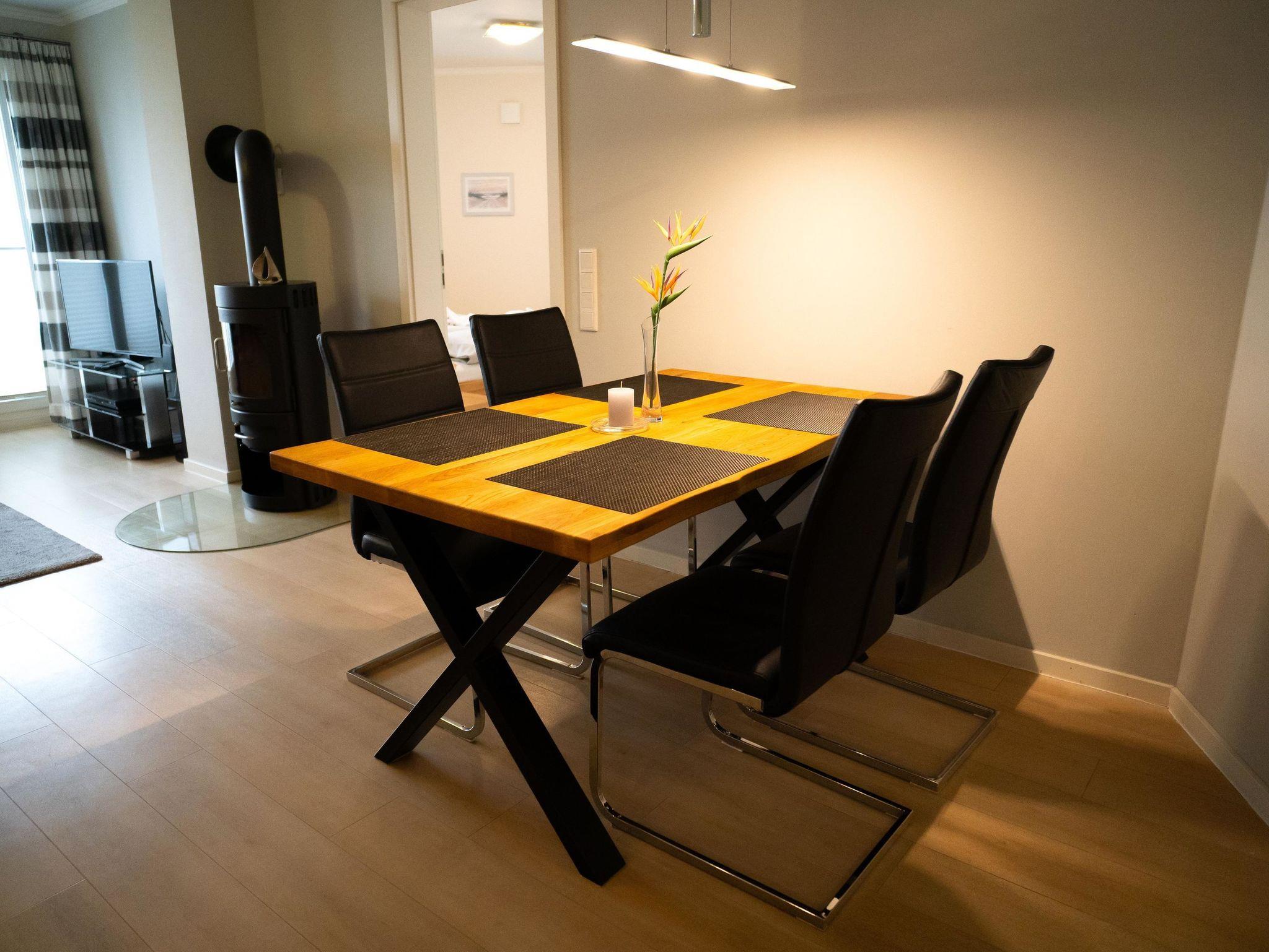 Der im Jahre 2023 neu möblierte große Wohn- und Essbereich bietet Ihnen ein bequemes Sofa mit Ottomanen, einen separaten Sessel sowie zwei kleine Beistelltische. Von hier blicken Sie direkt auf einen hyggeligen Kaminofen (Kaminholz wird nicht bereitgestellt). Die Couch kann schnell zum Schlafsofa für die dritte Person ausgeklappt werden. Außerdem ist ein Samsung Smart TV mit Blu-ray-/CD-/DVD-Player und integriertem Radio vorhanden. Zu Ihrer Unterhaltung finden Sie zudem eine Spielesammlung und einige Bücher. In der offenen Küche finden Sie, unter anderem, ein Cerankochfeld, Backofen, Kühlschrank, Gefrierfach, Mikrowelle, Kaffeemaschine, Wasserkocher, Toaster sowie Handmixer und Pürierstab. An einem großen Holztisch mit Freischwingern aus Leder, können Sie Ihre zubereiteten Mahlzeiten genießen. Oder, bei gutem Wetter, auch auf dem Balkon. Das Schlafzimmer ist mit hochwertigen Möbeln von HÜLSTA eingerichtet und besticht mit einem Doppelbett (180 x 200 cm/ getrennte Matratzen)) mit höhenverstellbarem Kopf- und Fußteil sowie einem geräumigen Kleiderschrank. Von hier aus können Sie ebenfalls den Balkon betreten und einen Blick auf die Ostsee werfen. Im eleganten Duschbad erwartet Sie eine bodengleiche Dusche mit Glaswand. Ein Handtuchtrockner, ein geräumiger Waschtisch mit großem Spiegel und ein Fön, gehören zur Badausstattung. Den möblierten Balkon dieser Wohnung können Sie entweder aus dem Wohnbereich oder auch aus dem Schlafzimmer betreten. Dieser ist nach Osten ausgerichtet und ideal für ein Frühstück bei Sonnenschein. Im Abstellraum finden Sie ausreichend Platz, um Ihre Koffer unterzubringen. Dort finden Sie auch Auflagen für die Balkonmöbel sowie ein Bügeleisen und Bügelbrett. Alle Räume der Unterkunft sind mit einer Fußbodenheizung ausgestattet worden. Ein PKW-Stellplatz steht Ihnen kostenfrei direkt am Objekt zur Verfügung. Außerdem erleichtert der im Gebäude installierte Aufzug den Transport der mitgebrachten Urlaubssachen in Ihr Domizil. Auf dieser Ebene gibt es zudem eine Abstellmöglichkeit für Ihre Fahrräder. Hier noch einige Hinweise: Es handelt sich um eine Nichtraucherwohnung. Haustiere sind nicht erlaubt. Das kostenfreie WLAN in der Unterkunft ist ausschließlich für die Verwendung von Social Media und den Austausch von Bildern mit Familie und Freunden gedacht. Die Nutzung zum Streamen von Filmen ist nicht vorgesehen. Wäscheset, Kinderreisebett und Kinderhochstuhl können kostenpflichtig zugebucht werden. Eine Waschmaschine und ein Trockner stehen im separaten Hauswirtschaftsraum im Untergeschoss der Villa zu Ihrer Verfügung (gegen Gebühr / 1,00 Euro Münzen). Sichern Sie sich einen der begehrten Strandkörbe nur ein paar Meter entfernt von den rauschenden Wellen der Ostsee (Anfang Mai - Ende August) und buchen Sie jetzt zu besonderen Konditionen (12,00 Euro pro Tag oder 75,00 Euro pro Woche). Anmerkung: Auch im Frühling, Herbst und Winter können Sie hier wunderbar entspannen und schöne Ausflüge oder Fahrradtouren zum Gespensterwald in Nienhagen, nach Warnemünde oder nach Heiligendamm, Kühlungsborn und Bad Doberan unternehmen. Dort können Sie das Doberaner Münster besichtigen sowie mit der historischen Bäderbahn ?Molli? fahren.