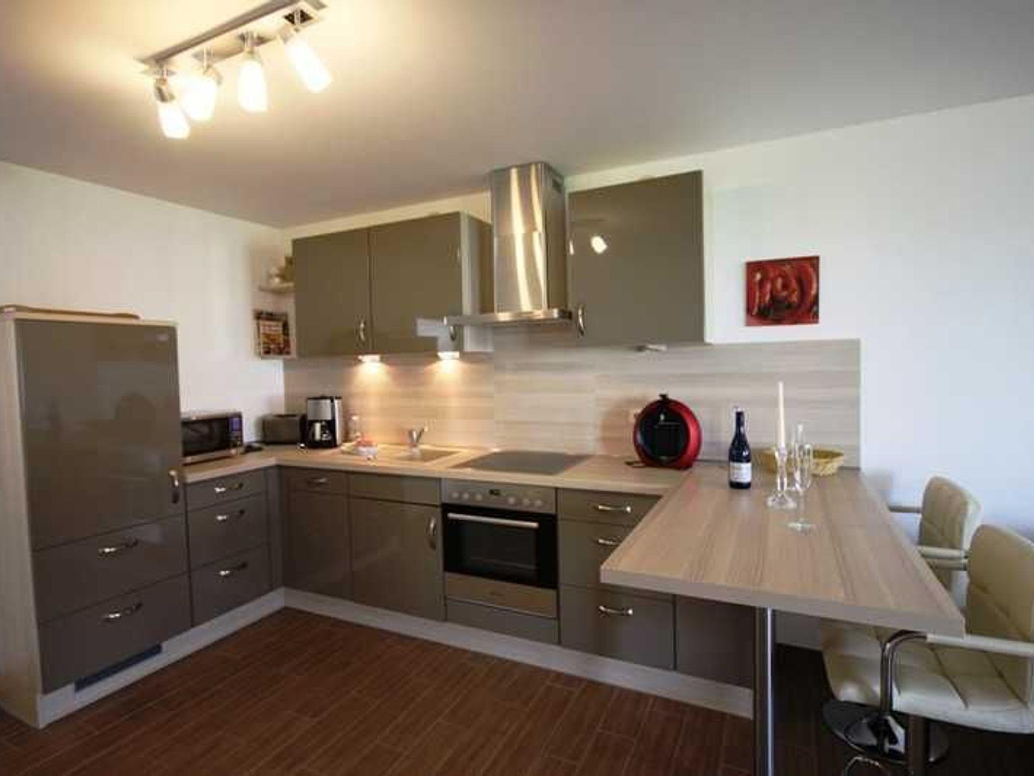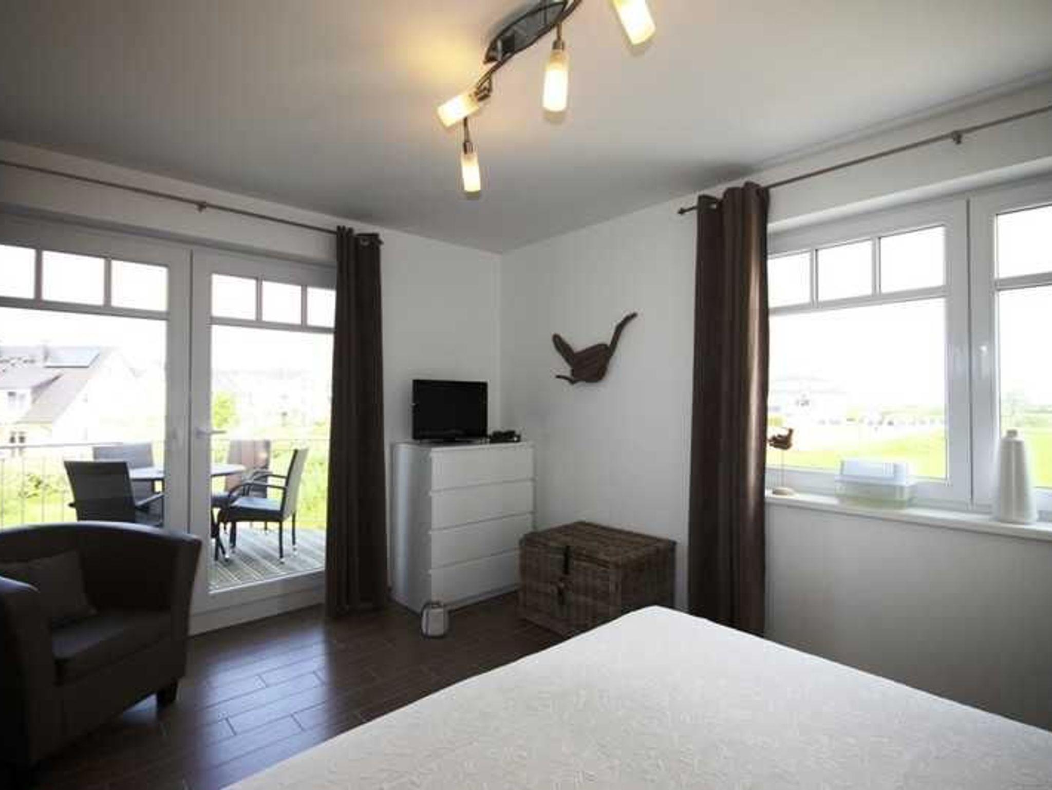 Im Wohn-/ Esszimmer empfangen Sie eine lederne Eckcouch, ein Flatscreen-TV, ein großer moderner Esstresen mit zwei Stühlen und ein weiterer Esstisch mit vier Stühlen. Die offene Einbauküche ist voll ausgestattet mit Geschirrspüler, Kühlschrank, Backofen, Mikrowelle mit Grillfunktion, Kaffeemaschine,[nbsp] Wasserkocher und Toaster. Im ersten Schlafzimmer befinden sich ein gemütliches Doppelbett und ein geräumiger Kleiderschrank. Im zweiten Schlafzimmer sorgt ein Boxspringbett mit Topper und einer durchgehenden Matratze für süße Träume. Ein Sideboard und ein Flatscreen-TV runden den Komfort ab. Das Badezimmer besticht mit ebenerdiger Dusche, zwei Waschbecken und Fön. Eine Fußbodenheizung sorgt in allen Räumen für wohlige Wärme. Über Wohn- und Schlafzimmer haben Sie Zugang zum herrlichen Balkon mit Meerblick.