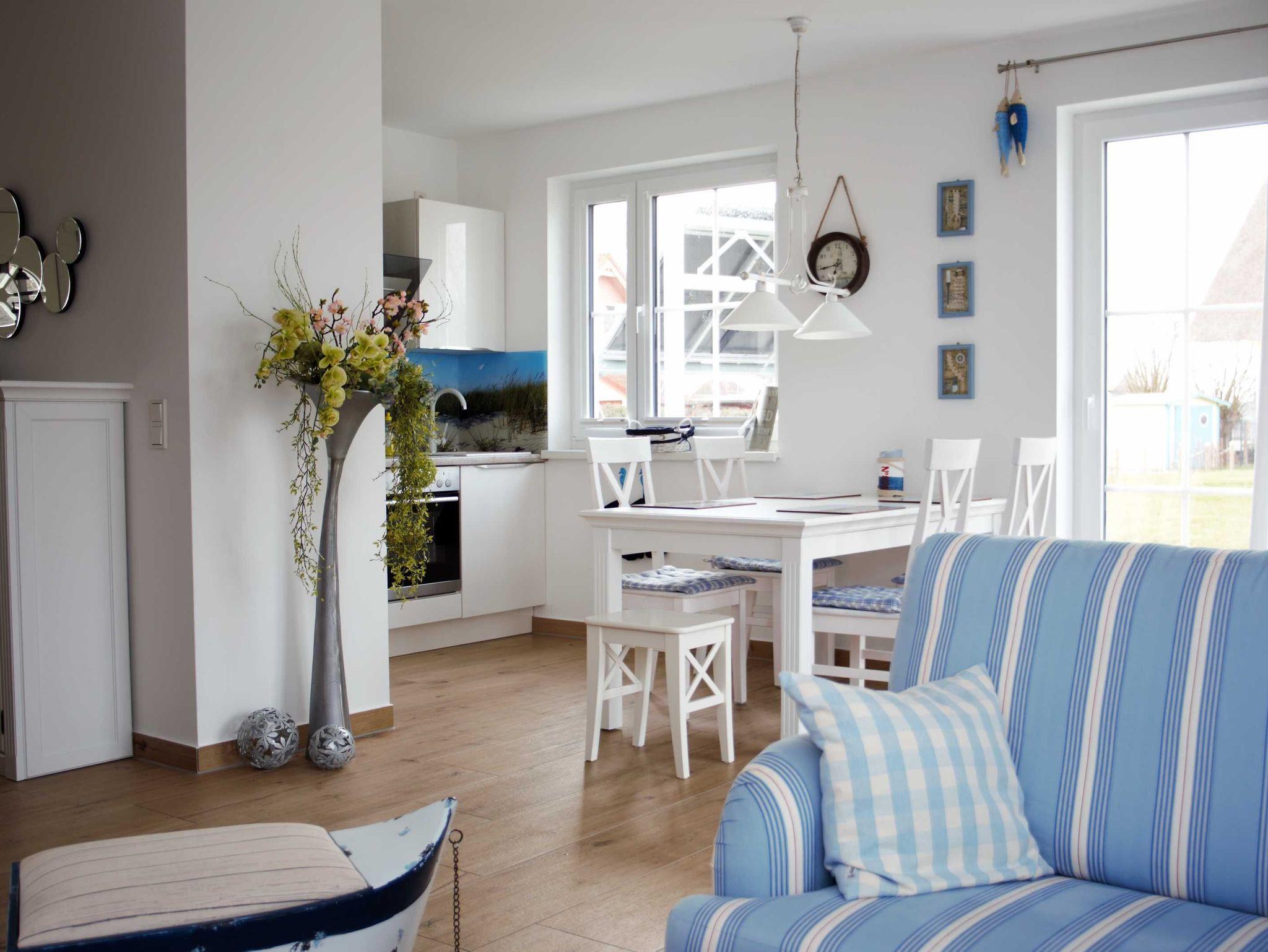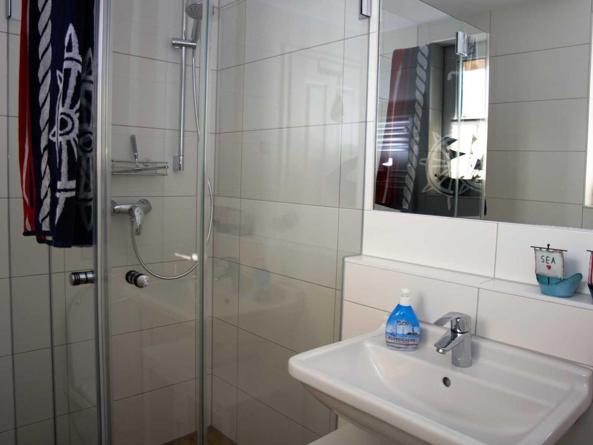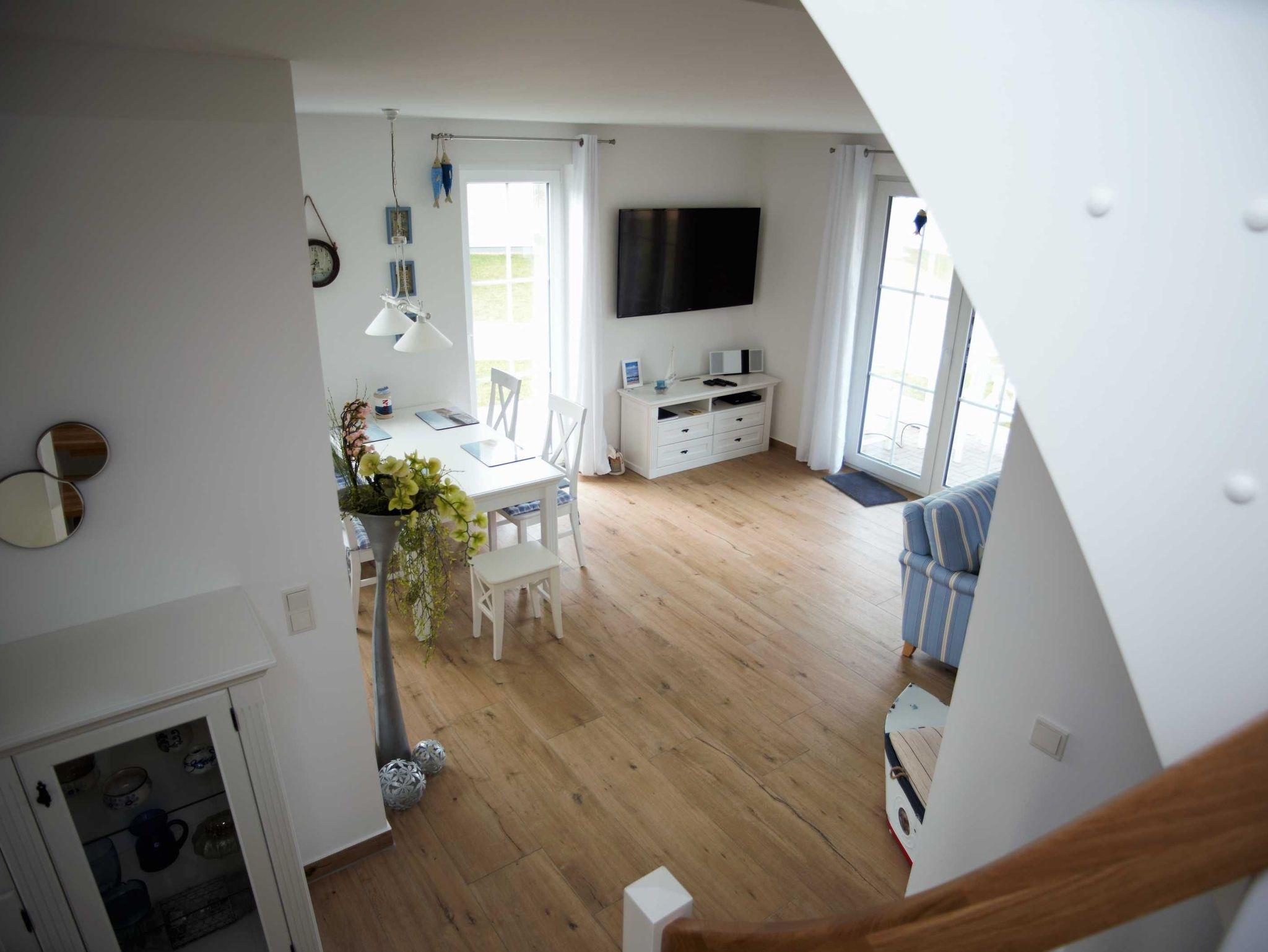 Im Erdgeschoss befindet sich der großzügig gestaltete Wohnbereich mit integrierter Küche und ein Duschbad. Der maritim eingerichtete Wohnbereich eignet sich ideal zum Entspannen nach einem ausgedehnten Strandspaziergang. Die modernen Elektronikgeräte wie wandhängender ein 60-Zoll-Flat-TV, ein Blu-ray-Player, ein DAB-Radio oder ein Spieleabend mit der Familie lassen die Zeit spaßig verfliegen. Die moderne Einbauküche sowie diverse Küchengeräte wie Geschirrspüler, Toaster, Kaffeemaschine, Wasserkocher, Mikrowelle, Herd mit Cerankochfeld, Backofen und Kühl-Gefrierkombination bieten ambitionierten Hobbyköchen auch im Urlaub die Möglichkeit Essen nach eigenen Wünschen zu kochen. Die Küche ist großzügig mit Ess- und Kochgeschirr, Besteck und Gläsern ausgestattet. Im hell gefliesten Duschbad mit Echtglasdusche, großem Waschtisch mit Unterschrank, darüber eingefliestem Wandspiegel, WC, Föhn und Handtuchtrockner wird Hygiene zum Spaß.