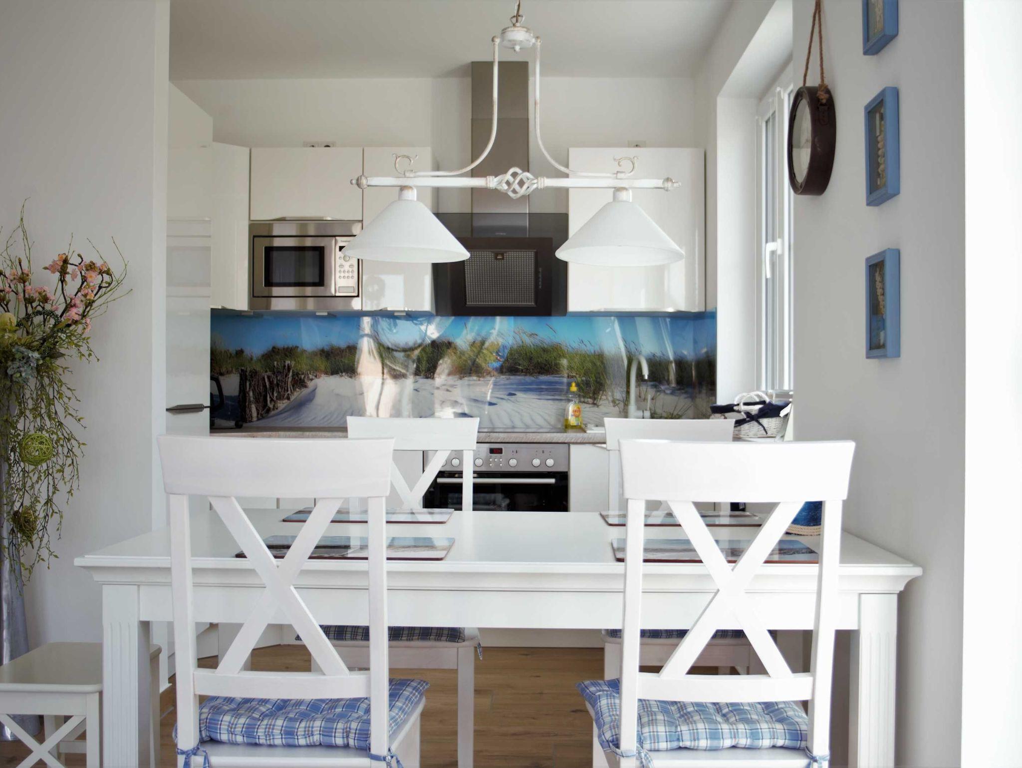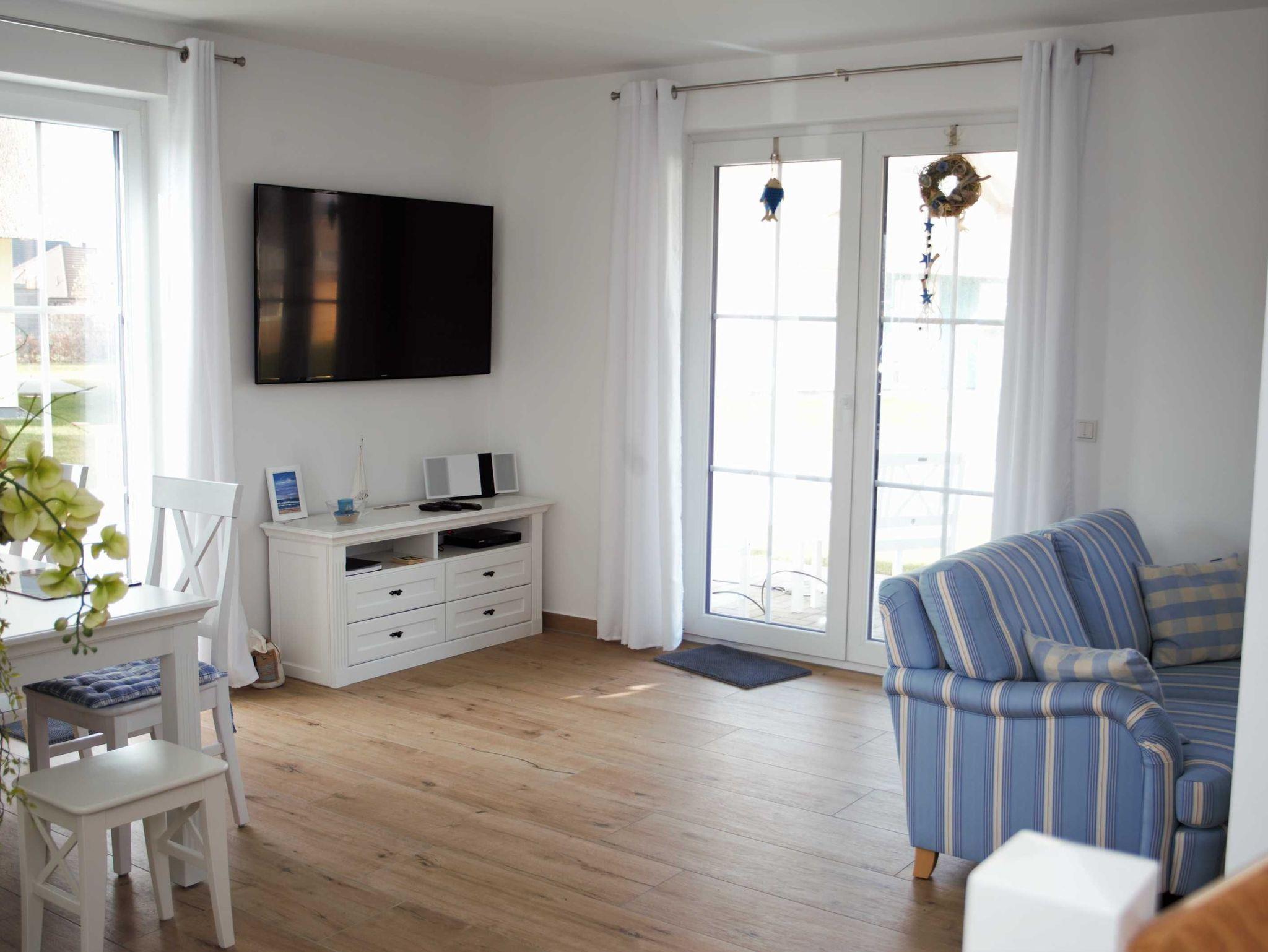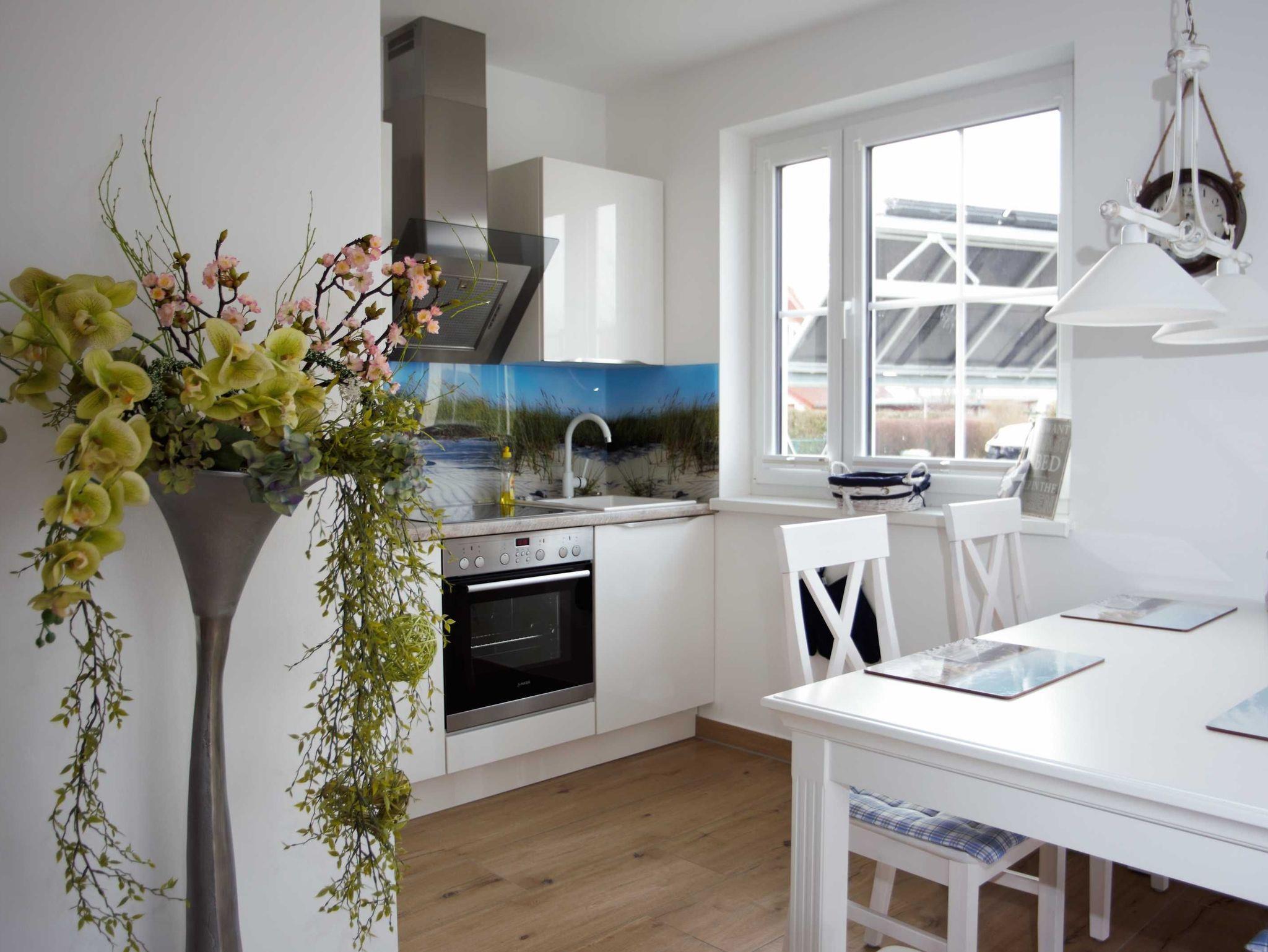 Im Erdgeschoss befindet sich der großzügig gestaltete Wohnbereich mit integrierter Küche und ein Duschbad. Der maritim eingerichtete Wohnbereich eignet sich ideal zum Entspannen nach einem ausgedehnten Strandspaziergang. Die modernen Elektronikgeräte wie wandhängender ein 60-Zoll-Flat-TV, ein Blu-ray-Player, ein DAB-Radio oder ein Spieleabend mit der Familie lassen die Zeit spaßig verfliegen. Die moderne Einbauküche sowie diverse Küchengeräte wie Geschirrspüler, Toaster, Kaffeemaschine, Wasserkocher, Mikrowelle, Herd mit Cerankochfeld, Backofen und Kühl-Gefrierkombination bieten ambitionierten Hobbyköchen auch im Urlaub die Möglichkeit Essen nach eigenen Wünschen zu kochen. Die Küche ist großzügig mit Ess- und Kochgeschirr, Besteck und Gläsern ausgestattet. Im hell gefliesten Duschbad mit Echtglasdusche, großem Waschtisch mit Unterschrank, darüber eingefliestem Wandspiegel, WC, Föhn und Handtuchtrockner wird Hygiene zum Spaß.