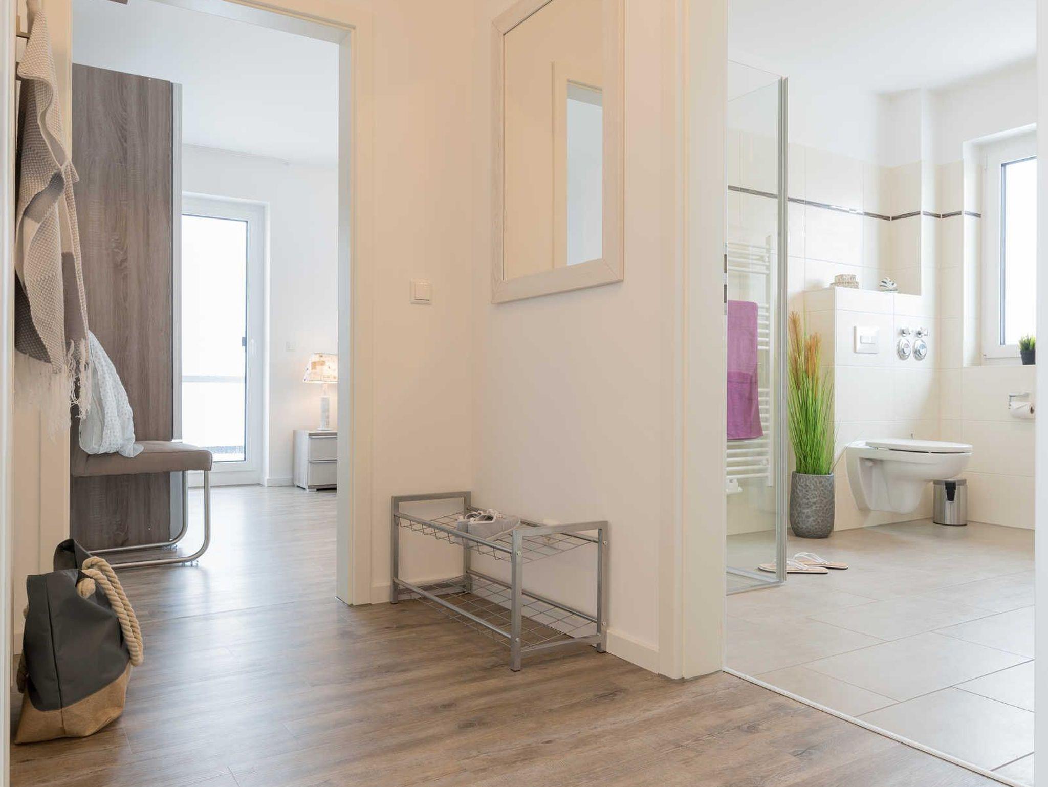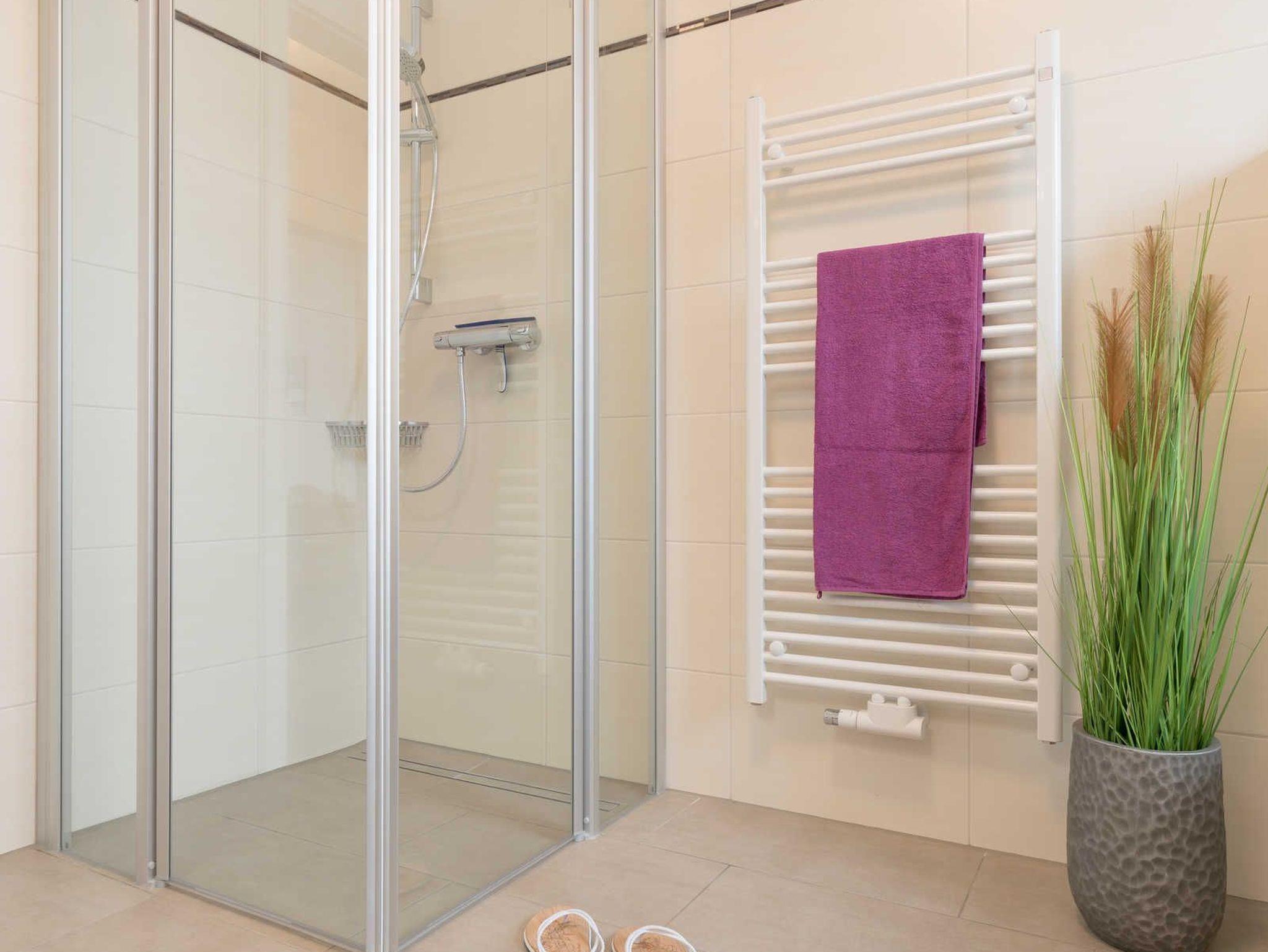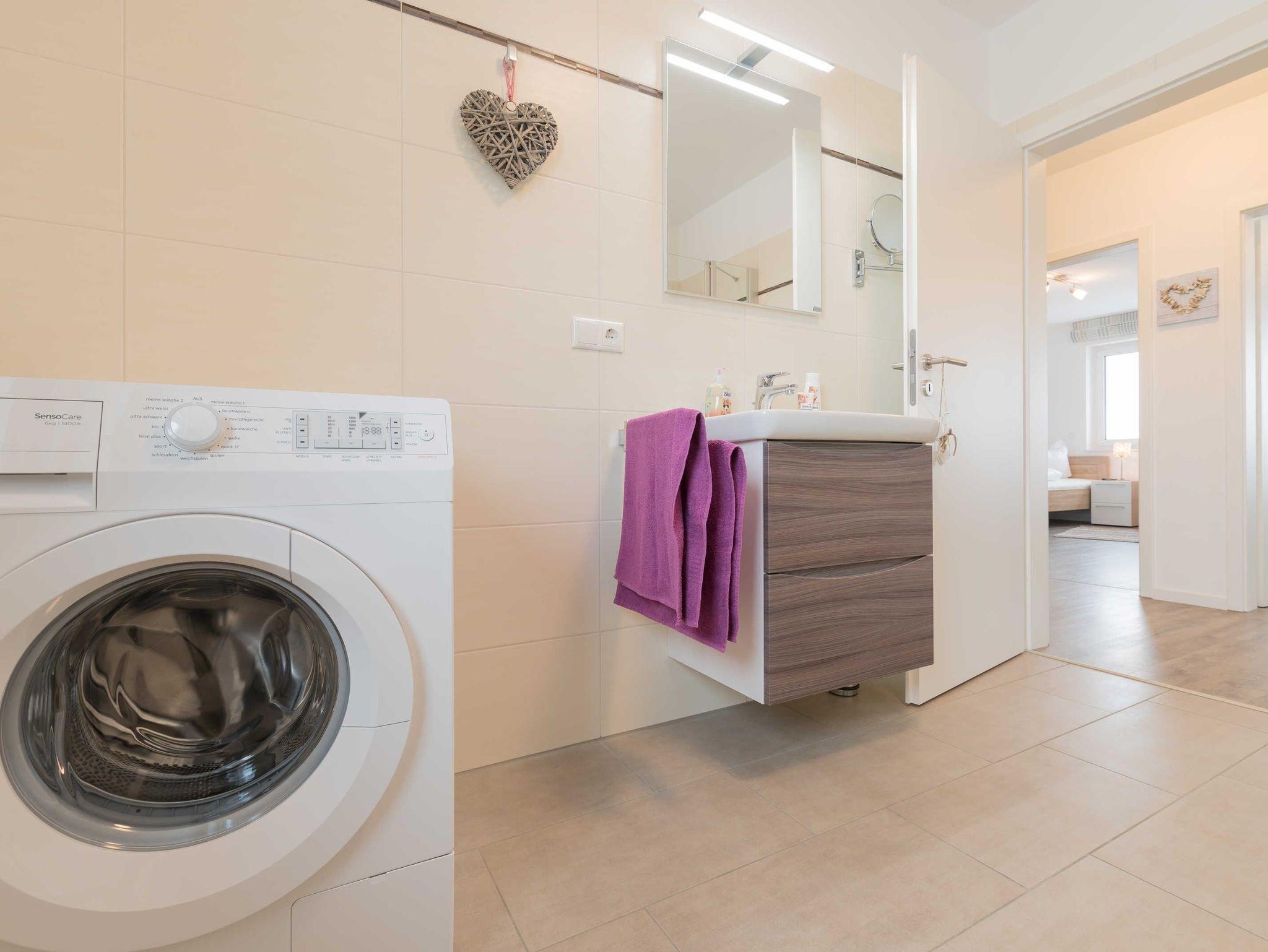 Das helle Badezimmer mit Fenster und bodengleicher Dusche besticht mit einem Waschtisch inklusive großem Spiegel, einen Waschtischunterschrank, einem Haartrockner und einem Handtuchheizkörper. Eine Waschmaschine steht ebenso zur Verfügung. Zudem befinden sich Bügelbrett und Bügeleisen im Abstellraum der Wohnung. So können Sie den Heimweg bereits mit schrankfertiger Wäsche antreten.