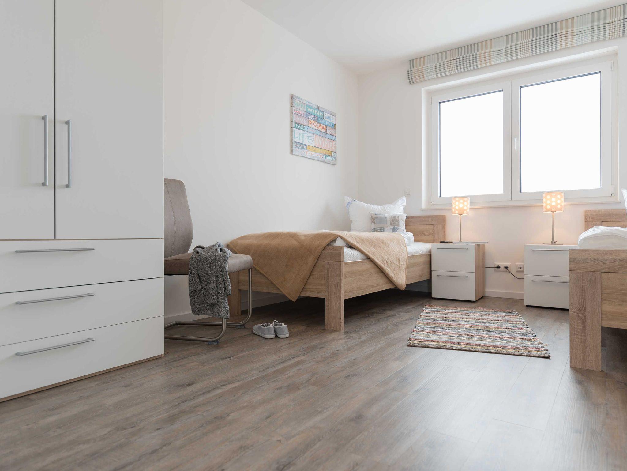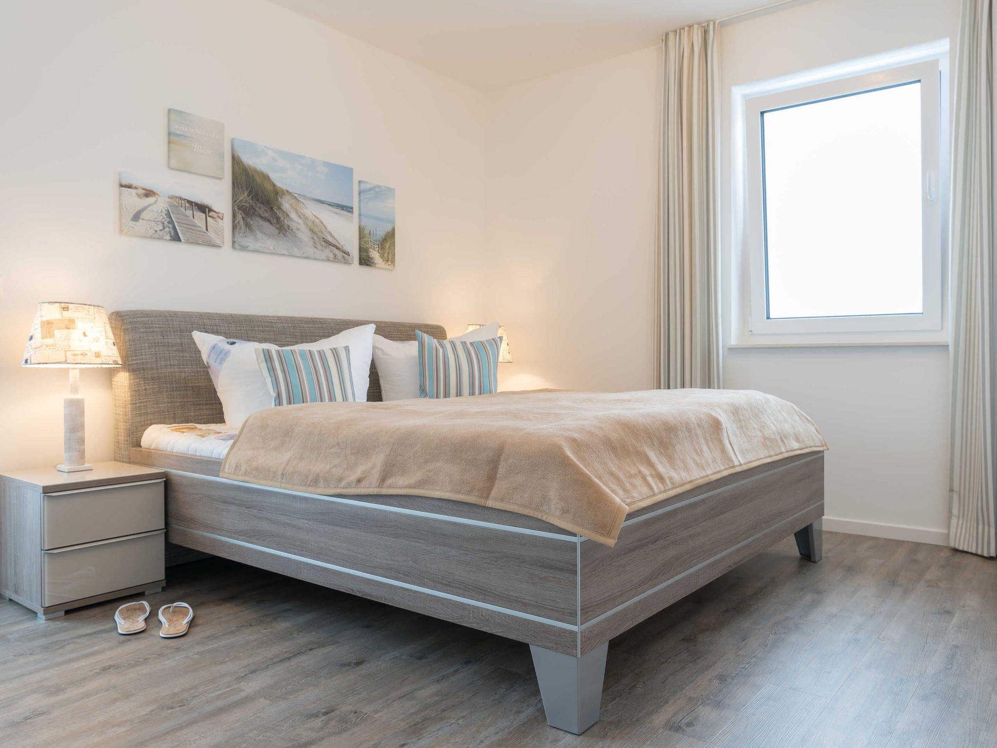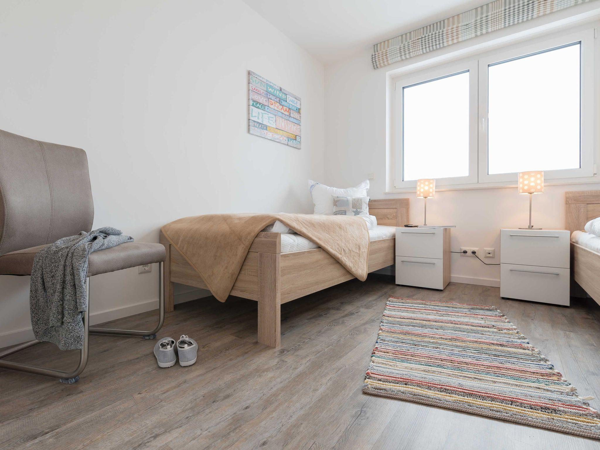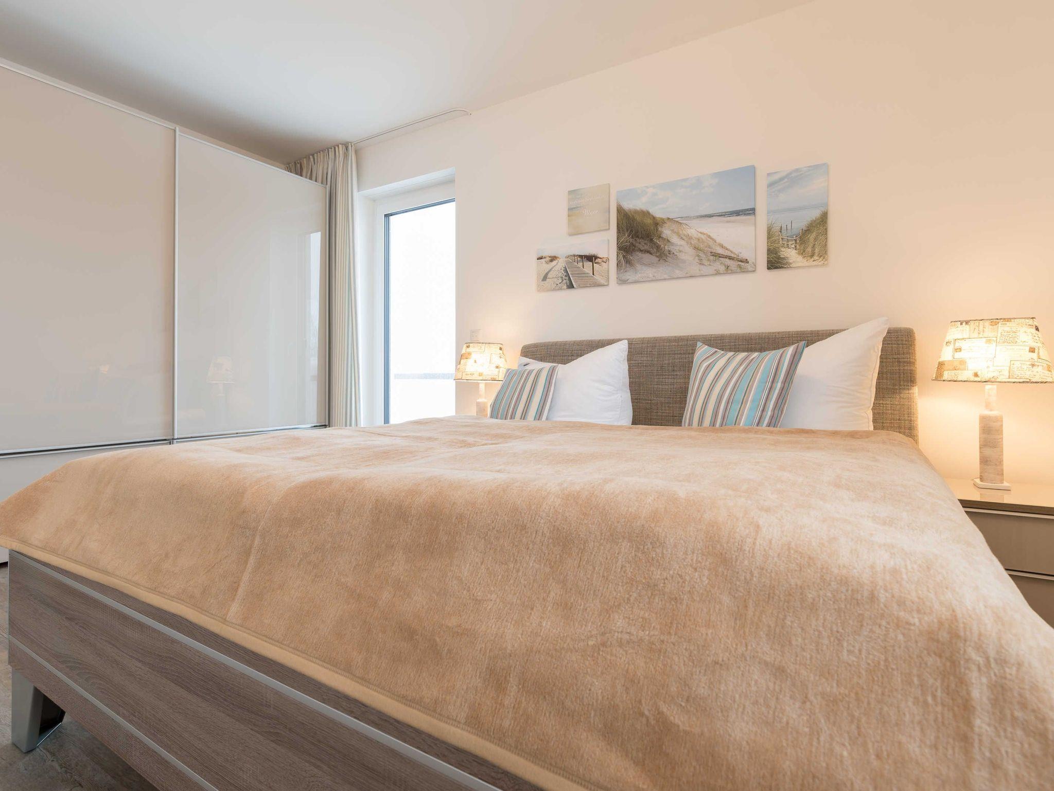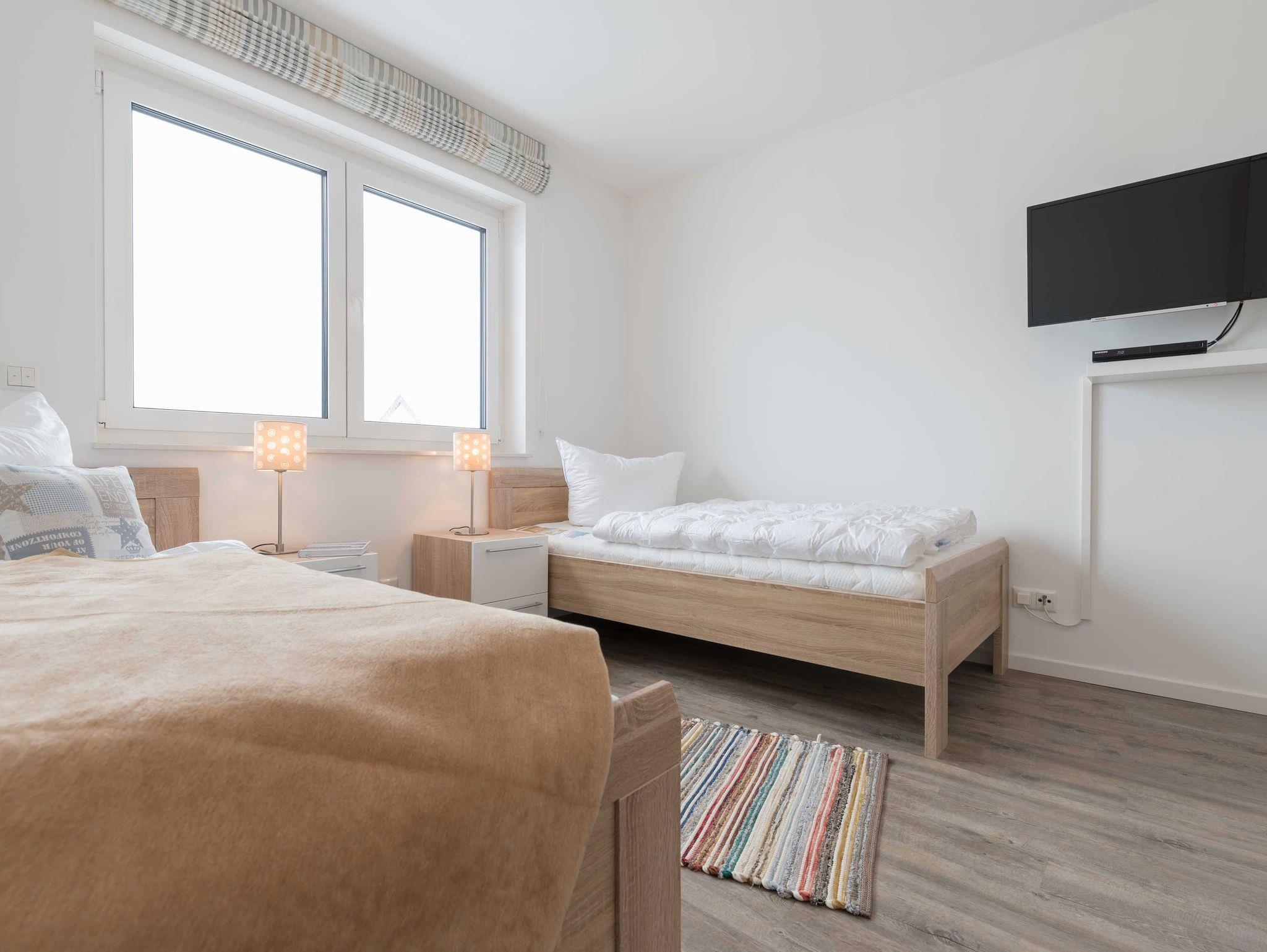 Die Ferienwohnung verfügt über zwei separate Schlafräume. Im Schlafzimmer mit Zugang zur Dachterrasse befindet sich ein großzügiges Doppelbett mit zwei einzelnen Matratzen (je 0,90 x 2,00 m) und ein geräumiger Kleiderschrank. Im zweiten Schlafzimmer erwarten Sie zwei Einzelbetten (je 1,00 x 2,00 m), ein TV mit Blu-Ray-Player und ein weiterer Kleiderschrank. Alle Terrassen- und Fensterelemente verfügen über Rollläden mit Motoren, welche neben dem sommerlichen Sonnenschutz gerade für Kleinkinder und Babys für hohen Schlafkomfort sorgen.