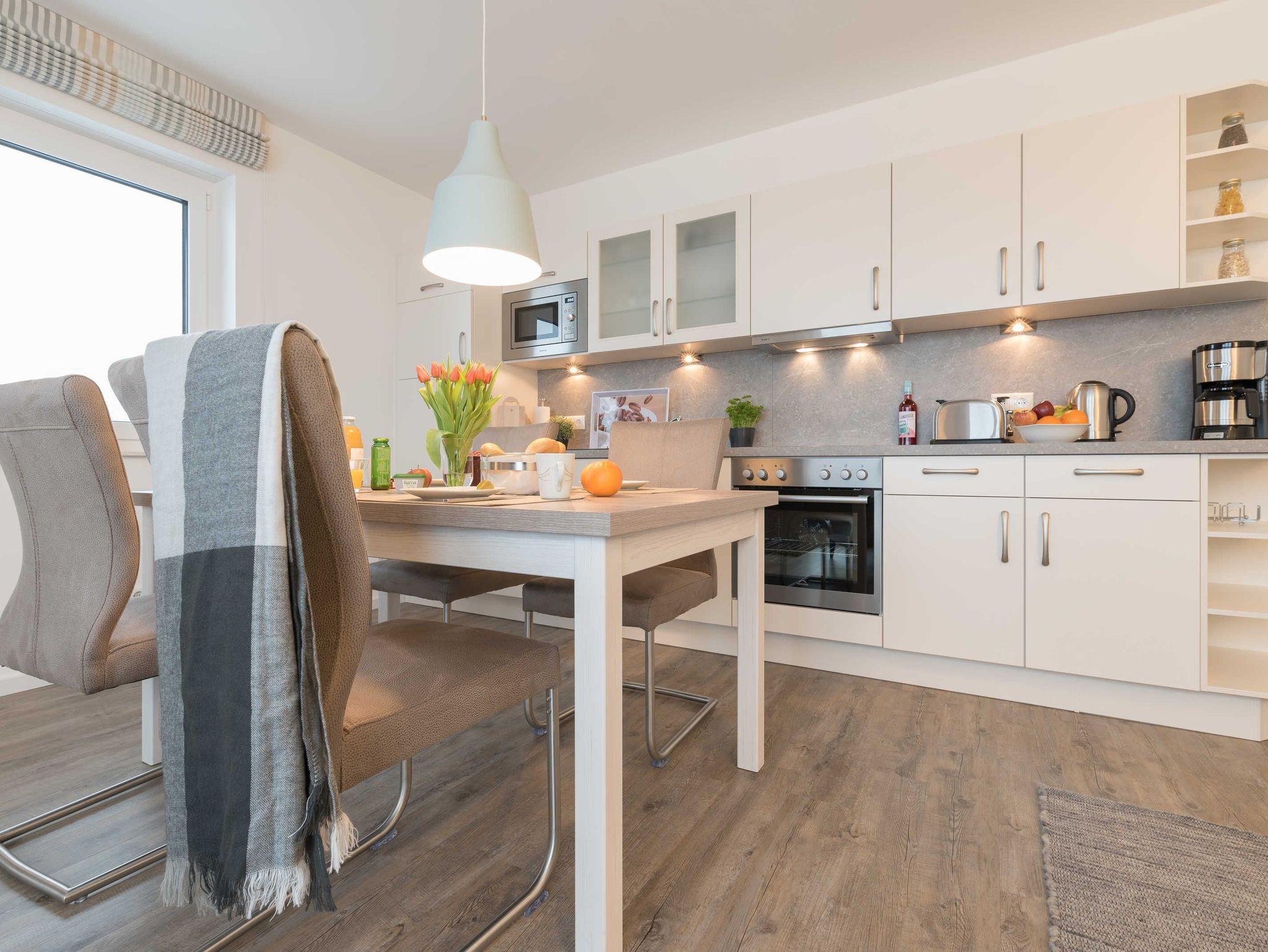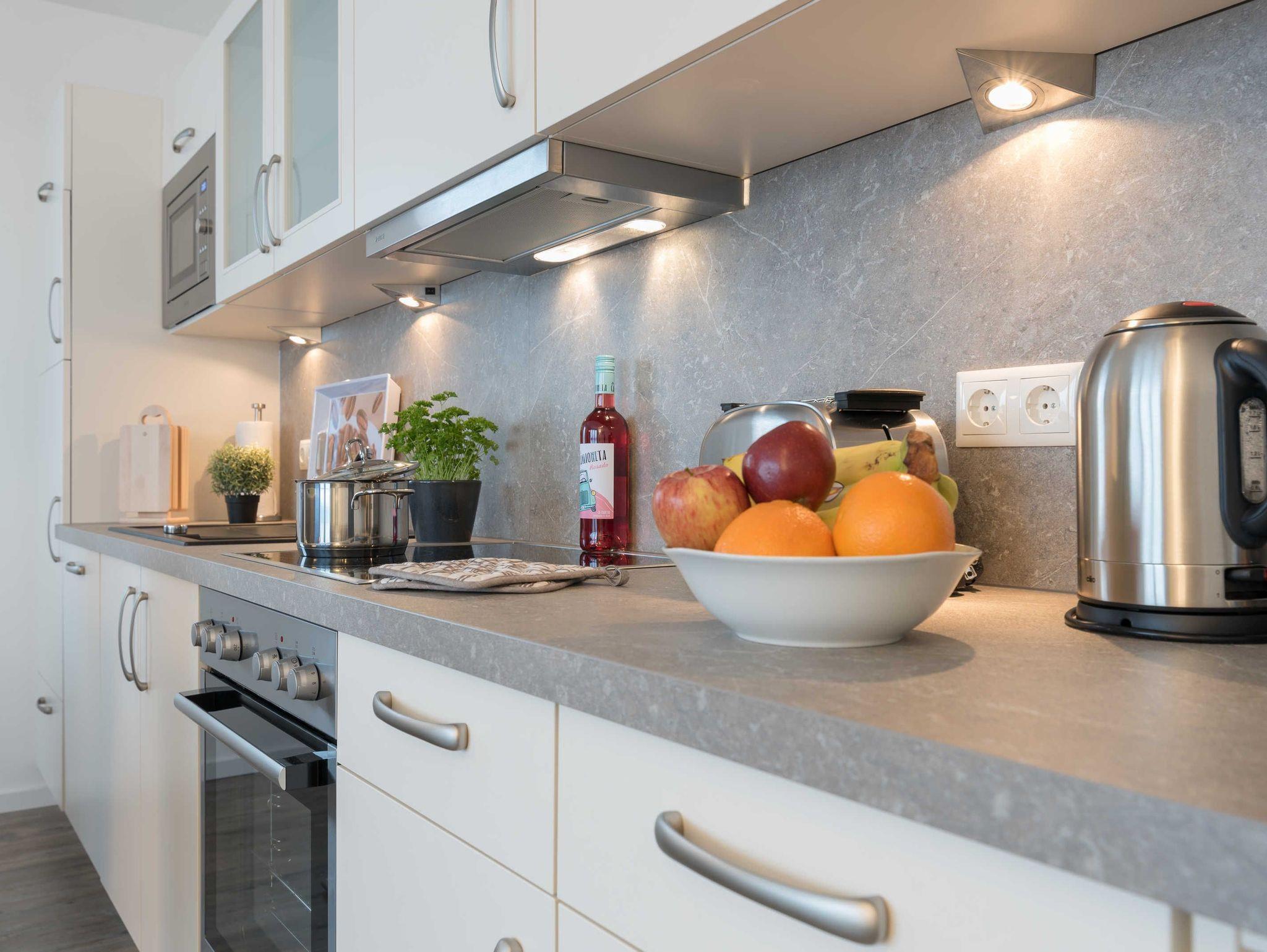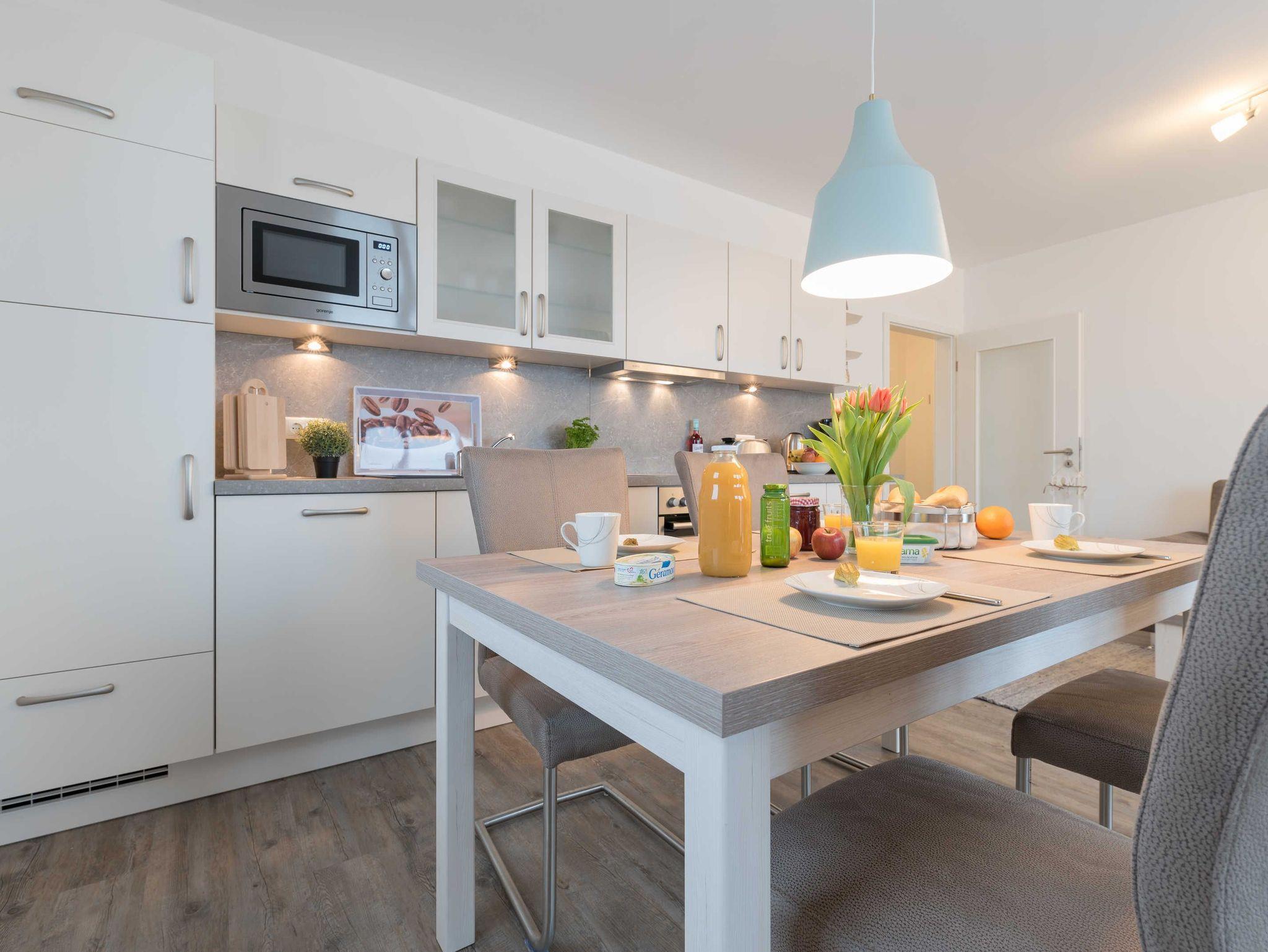 Die hochwertige, moderne Einbauküche verfügt über einen Geschirrspüler, einen Kühl- und Gefrierschrank, einen Backofen, ein Cerankochfeld, eine Mikrowelle, einen Toaster, eine Kaffeemaschine und einen Wasserkocher. Eine Geschirr-, Koch- und Zubehörausstattung - vom Mixer bis zum Eierbecher - ist vorhanden.