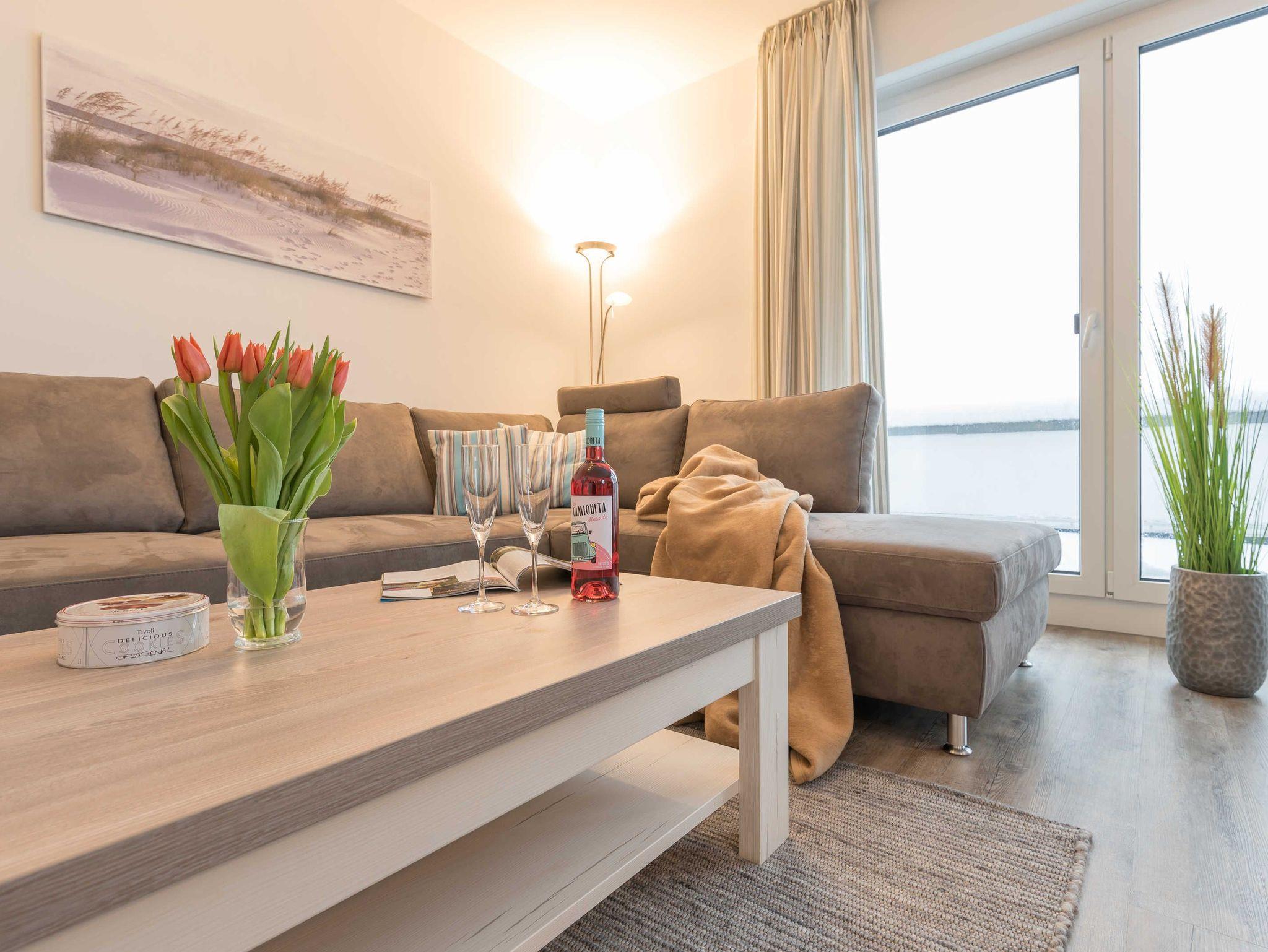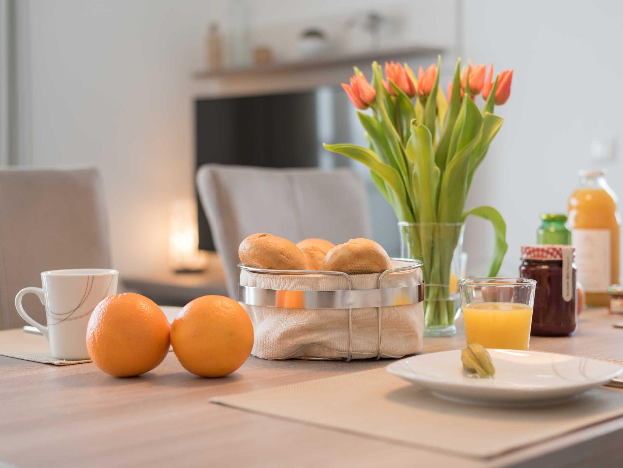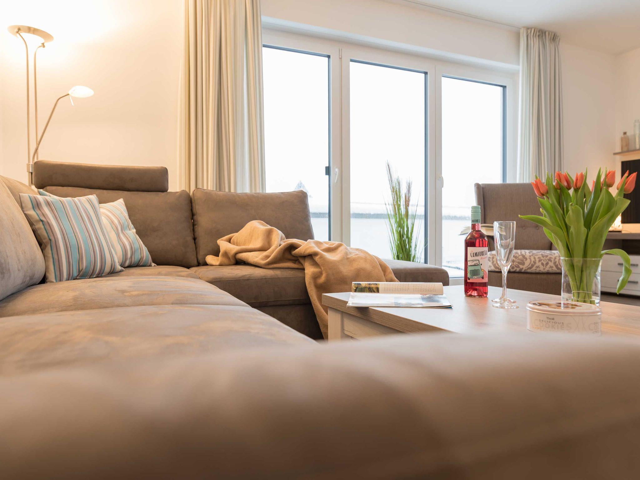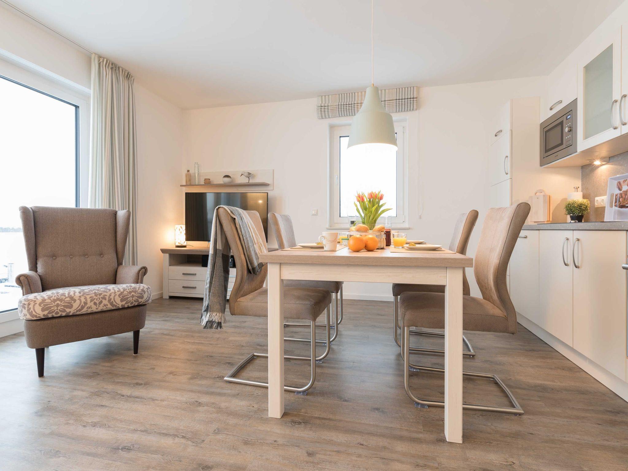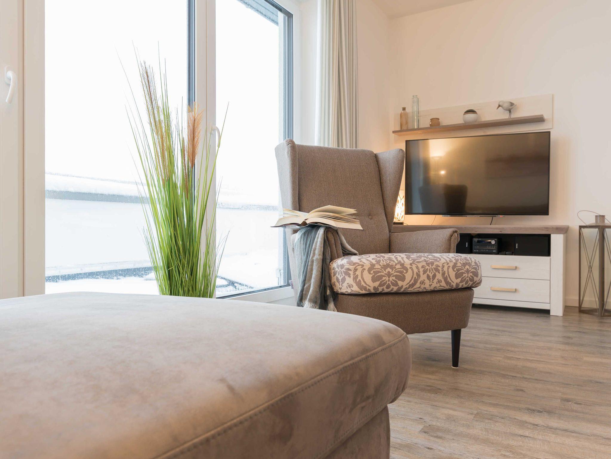 Im hellen und geschmackvoll eingerichteten Wohnzimmer laden eine gemütliche Couch mit passendem Sessel sowie ein großer Esstisch zum Verweilen ein. Die bodentiefen Terrassenelemente sorgen für lichtdurchfluteten Wohngenuss. Weiterhin gehören Flatscreen-TV´s im Wohn- und im Kinderzimmer, ein DVD-Player sowie eine Stereo-Anlage zur modernen Ausstattung dieser Ferienwohnung. Die Dachterrasse in West- und Nordausrichtung ist mit geschmackvollen Gartenmöbeln versehen. Sie umläuft das Haus an zwei Seiten und ist über Wohn- und Schlafzimmer erreichbar. Genießen Sie hier einen entspannten Urlaub beim Sonnenbad, bei gemeinsamen Mahlzeiten oder einfach beim Relaxen.