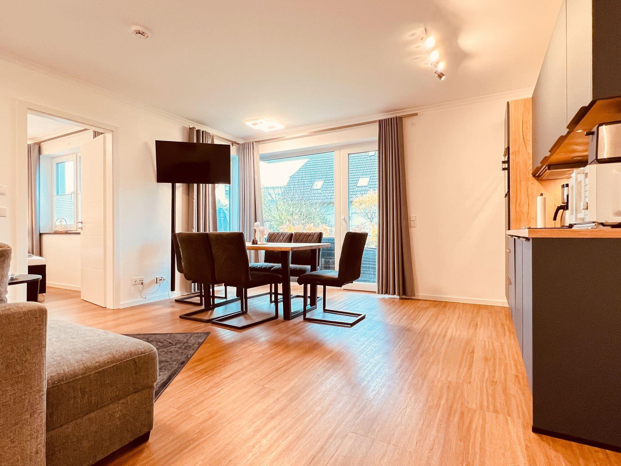 Über den Eingangsbereich gelangen Sie in den offenen Wohn- und Essbereich. Die moderne Einbauküche ist mit allen wichtigen Dingen ausgestattet: Geschirrspüler, Backofen, Mikrowelle, Kühlschrank, Toaster, Wasserkocher und Kaffeemaschine. Eine Geschirr-, Koch- und Zubehörausstattung ist natürlich ebenfalls vorhanden. Der Essbereich umfasst 6 bequeme Sitzplätze und lädt neben dem Essen zum längeren Verweilen ein. Das lichtdurchflutete Wohnzimmer mit bodentiefen Fenstern bietet ausreichend Platz und verfügt über eine bequeme Couch, auf welcher es sich wunderbar entspannen lässt. Ein ruhiger Platz zum Lesen sowie ein TV runden die Entschleunigung im Urlaub ab.