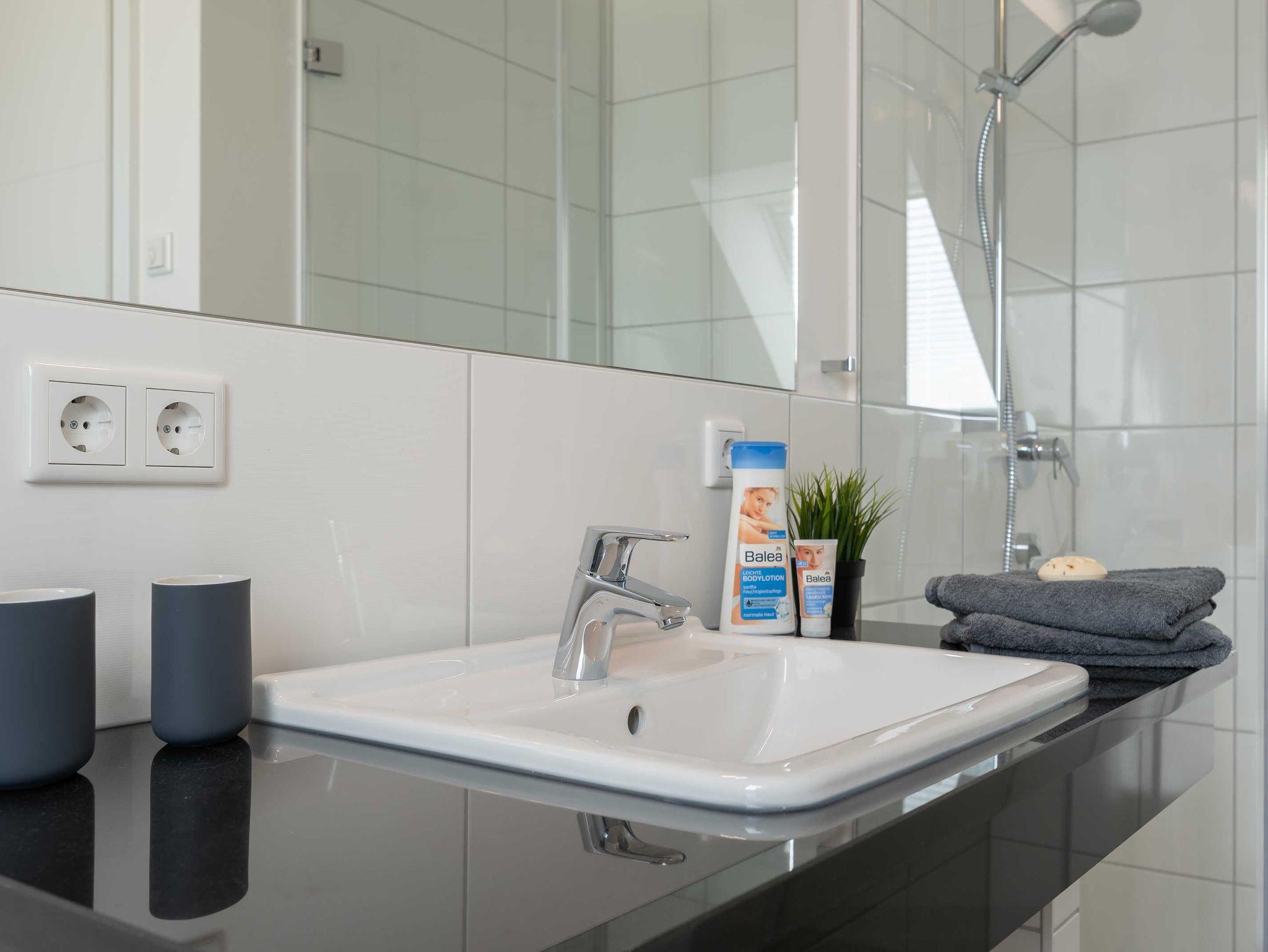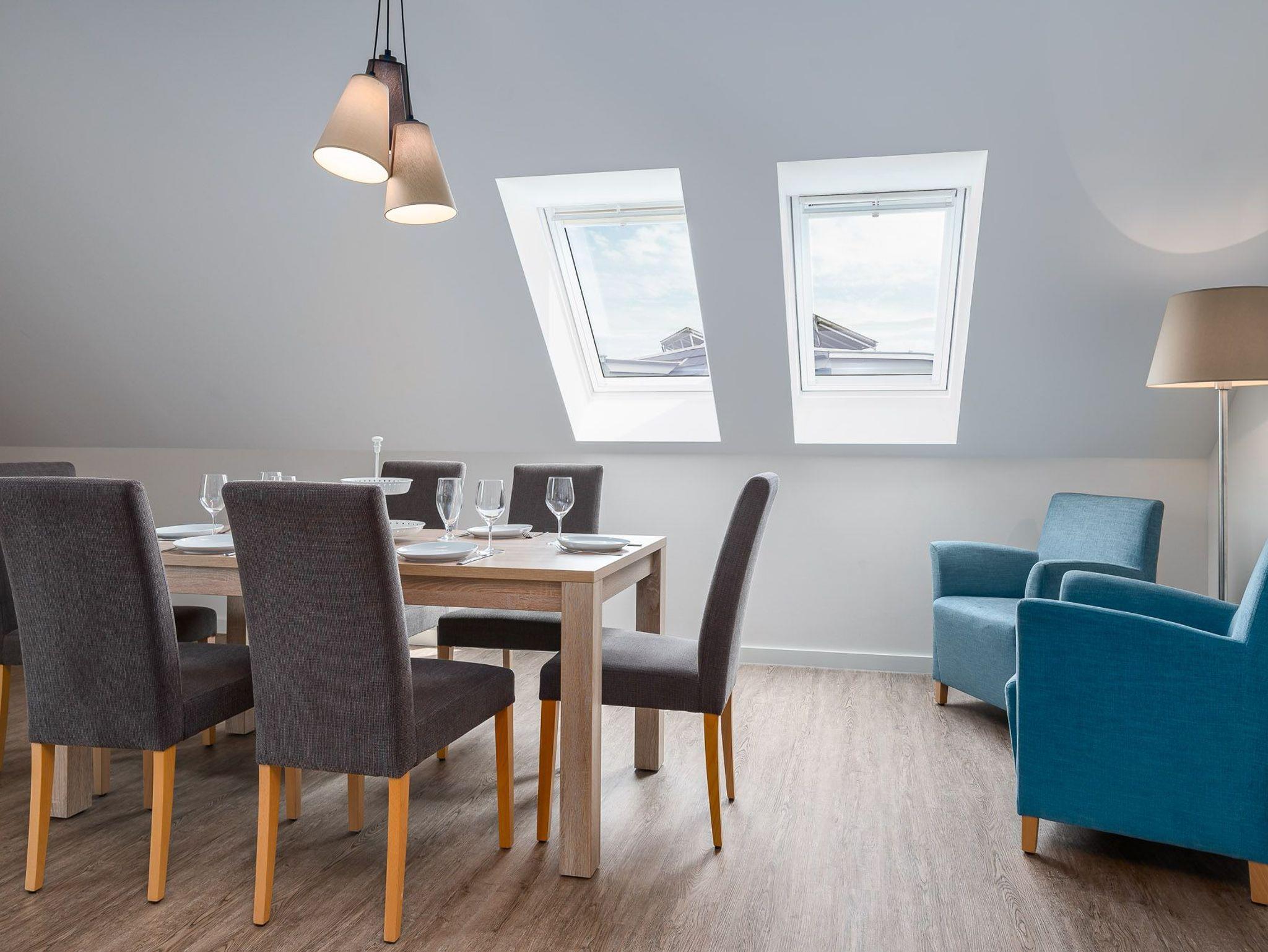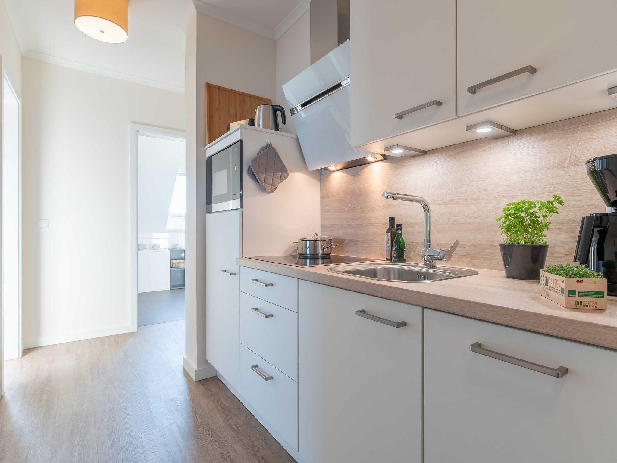 Die liebevoll und maritim eingerichtete 3-Zimmer-Wohnung im Penthouse-Stil in der Villa Strandhafer bietet mit 85 m² und zwei Balkonen (Nord- und Ost-Ausrichtung) viel Platz zur Entspannung und Erholung für bis zu sechs Personen. Der großzügige Wohn- und Essbereich lädt nicht zuletzt durch eine gemütliche Couch mit TV und einer kleinen Leseecke zum Wohlfühlen ein. Im Wohnbereich befindet sich eine Schlafcouch für zwei Personen. Der direkt vom Wohnzimmer aus betretbare Dachbalkon bietet einen schönen Blick zur Ostsee und macht gerade in lauen Sommernächten Lust auf einen Spieleabend. In den Herbst- und Wintermonaten sorgt die Fußbodenheizung in der kompletten Wohnung für Wärme und Gemütlichkeit. Des Weiteren verfügt die Wohnung über ein großes Schlafzimmer mit Doppelbett, zwei Kleiderschränken und TV. Als kleines Highlight betreten Sie nur von diesem Zimmer aus einem großzügigen Balkon der zu romantischen Abenden zu zweit einlädt. Im zweiten Schlafzimmer befinden sich zwei Einzelbetten (90 x 200 cm) sowie ein Kleiderschrank. Im geräumigen modernen Badezimmer finden Sie eine ebenerdige Dusche und ein Waschbecken mit großem Spiegel. Die sich in der Wohnung befindliche „smarte“ Einbauküche lässt mit Backofen, Geschirrspüler, Ceran-Kochfeld mit Abzugshaube sowie einem Kühlschrank mit Gefrierfach keine Wünsche offen. Wasserkocher, Kaffeemaschine, weitere Küchengeräte und Geschirr sind selbstverständlich enthalten. Ein Föhn, Staubsauger und weitere Haushaltsutensilien gehören zur Ausstattung der Wohnung. Eine Fußbodenheizung sorgt in allen Räumen für wohlige Wärme.