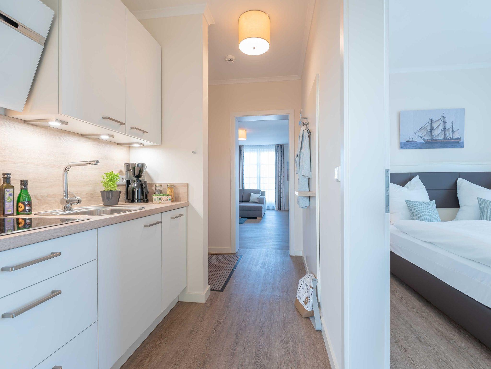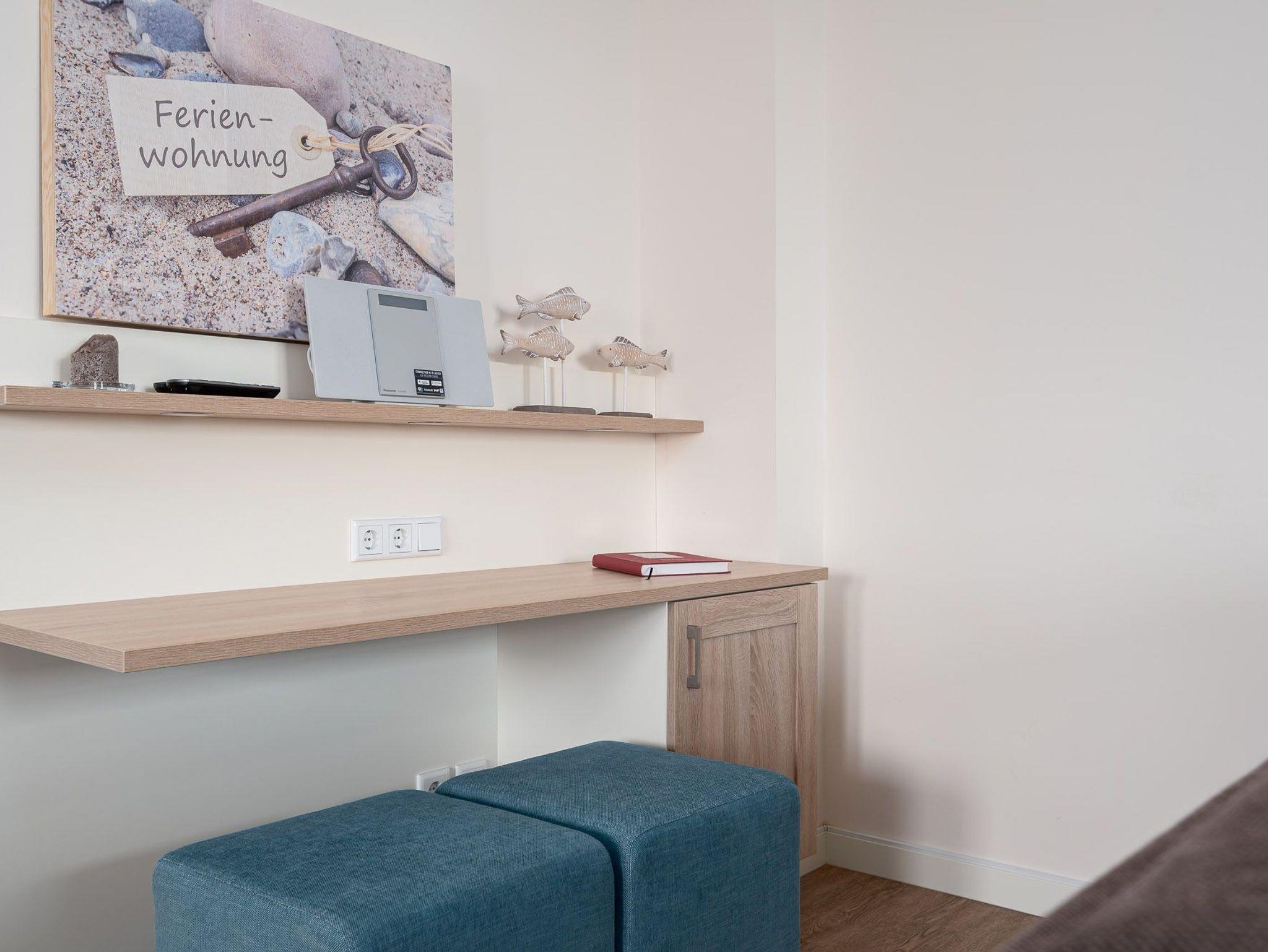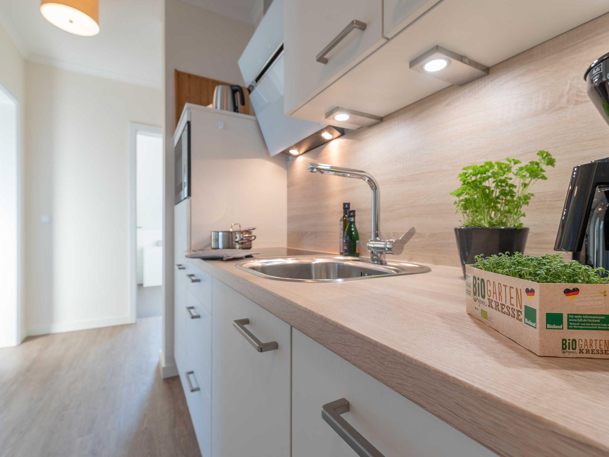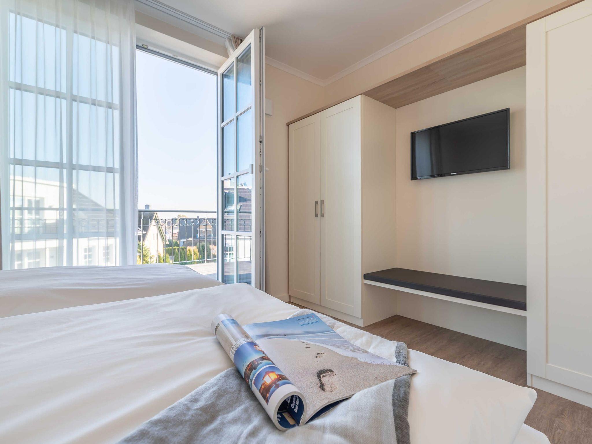 Die liebevoll und maritim eingerichtete 3-Zimmer-Wohnung im Penthouse-Stil in der Villa Strandhafer bietet mit 85 m² und zwei Balkonen (Nord- und Ost-Ausrichtung) viel Platz zur Entspannung und Erholung für bis zu sechs Personen. Der großzügige Wohn- und Essbereich lädt nicht zuletzt durch eine gemütliche Couch mit TV und einer kleinen Leseecke zum Wohlfühlen ein. Im Wohnbereich befindet sich eine Schlafcouch für zwei Personen. Der direkt vom Wohnzimmer aus betretbare Dachbalkon bietet einen schönen Blick zur Ostsee und macht gerade in lauen Sommernächten Lust auf einen Spieleabend. In den Herbst- und Wintermonaten sorgt die Fußbodenheizung in der kompletten Wohnung für Wärme und Gemütlichkeit. Des Weiteren verfügt die Wohnung über ein großes Schlafzimmer mit Doppelbett, zwei Kleiderschränken und TV. Als kleines Highlight betreten Sie nur von diesem Zimmer aus einem großzügigen Balkon der zu romantischen Abenden zu zweit einlädt. Im zweiten Schlafzimmer befinden sich zwei Einzelbetten (90 x 200 cm) sowie ein Kleiderschrank. Im geräumigen modernen Badezimmer finden Sie eine ebenerdige Dusche und ein Waschbecken mit großem Spiegel. Die sich in der Wohnung befindliche „smarte“ Einbauküche lässt mit Backofen, Geschirrspüler, Ceran-Kochfeld mit Abzugshaube sowie einem Kühlschrank mit Gefrierfach keine Wünsche offen. Wasserkocher, Kaffeemaschine, weitere Küchengeräte und Geschirr sind selbstverständlich enthalten. Ein Föhn, Staubsauger und weitere Haushaltsutensilien gehören zur Ausstattung der Wohnung. Eine Fußbodenheizung sorgt in allen Räumen für wohlige Wärme.