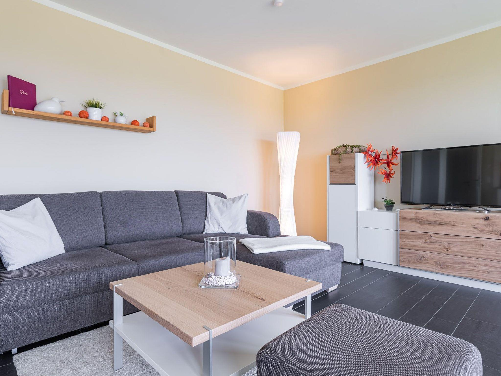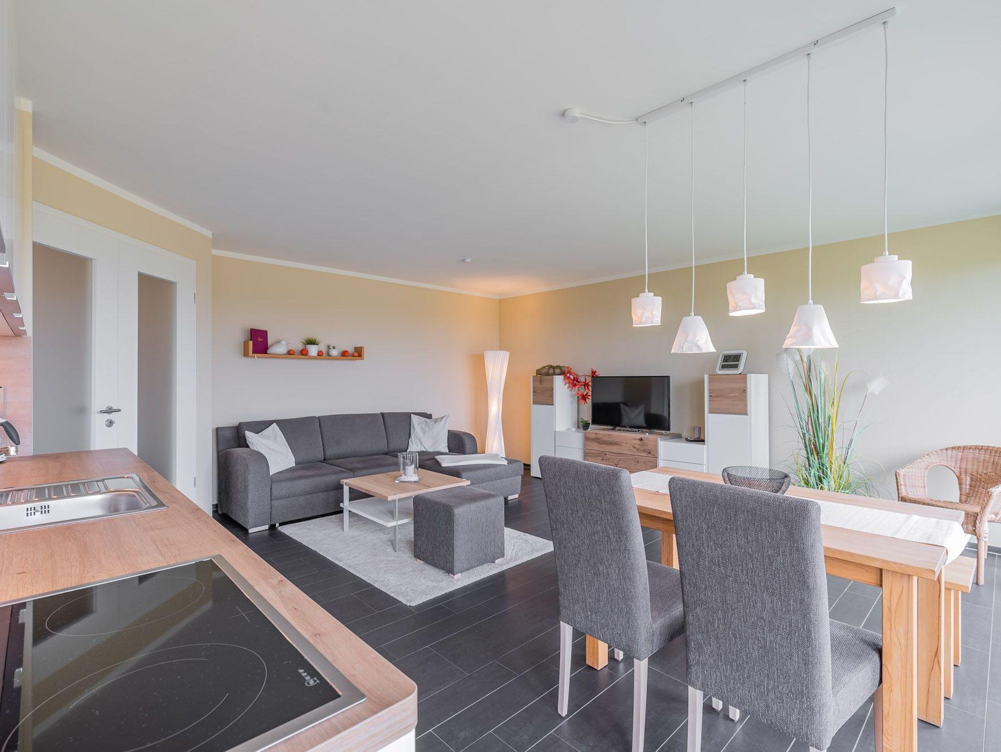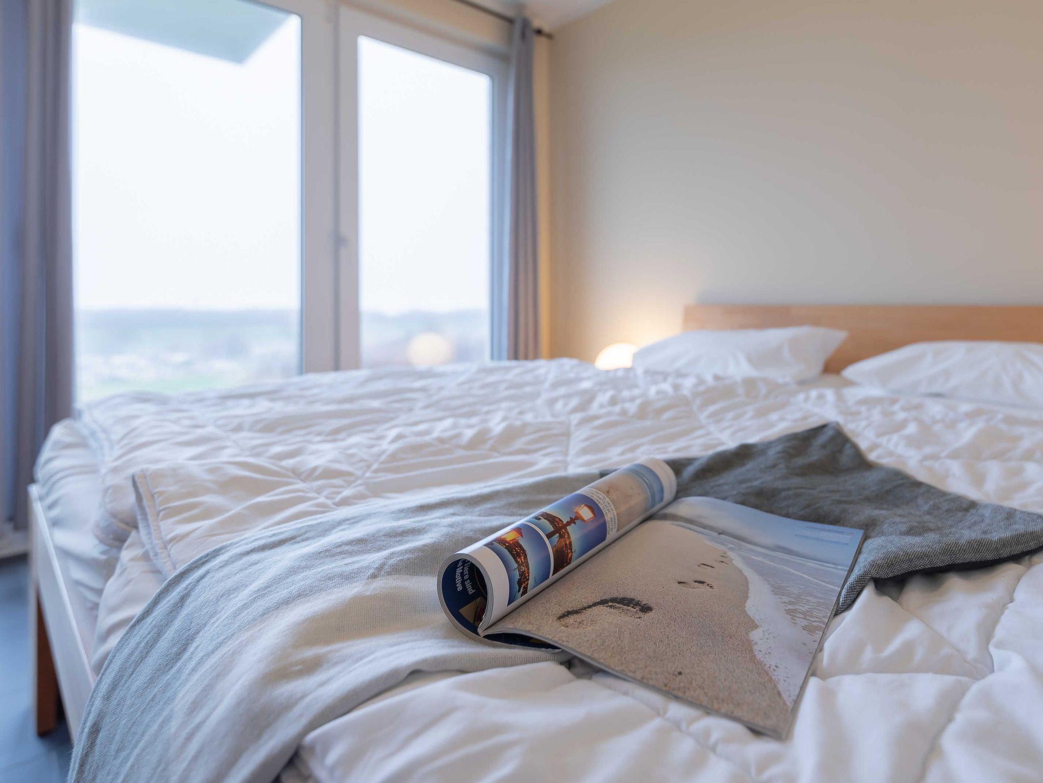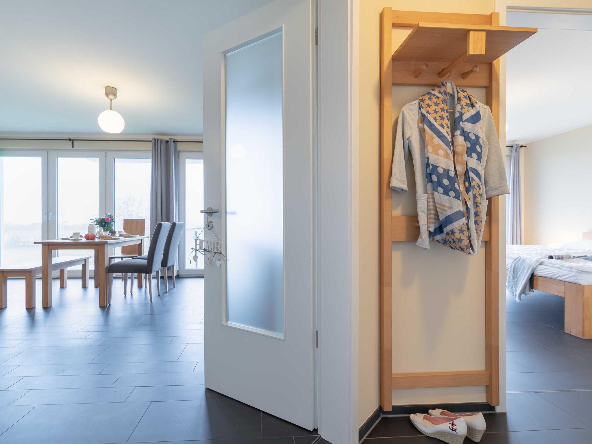 Im Flur der Ferienwohnung befindet sich genügend Platz für die Ablage von Strandutensilien. Der gemütliche Couchbereich (ausziehbar 1,6 x 2,0 m) mit Fernseher im offenen Wohn- und Kochbereich lädt zu erholsamen Abenden und zum Träumen mit Blick auf den Deich ein. Die offene Küche mit großzügigem Essbereich, ist komfortabel ausgestattet für kleine Kochabende. Geschirrspüler und verschiedenes Koch- und Esszubehör sind vorhanden. Der kleine Balkon in Nordausrichtung ist perfekt für das Frühstücken im Sommer geeignet. Das Schlafzimmer besitzt ein großes Bett (2,0 x 1,8 m / getrennte Matratzen) und einen geräumigen Kleiderschrank. In dem modernen Badezimmer befinden sich eine ebene Dusche sowie ein großer Spiegel und ein Haartrockner für die perfekte Föhnwelle.