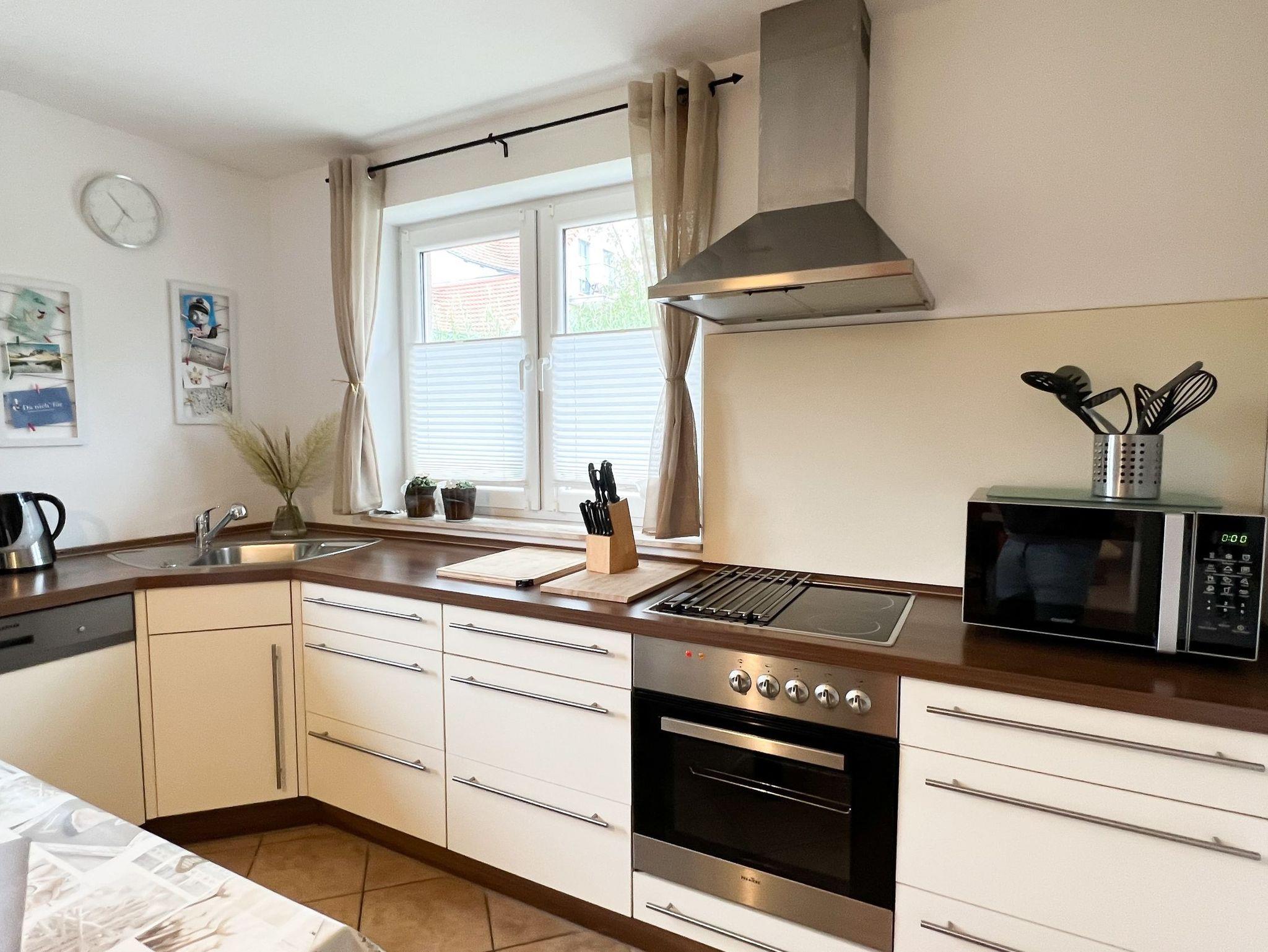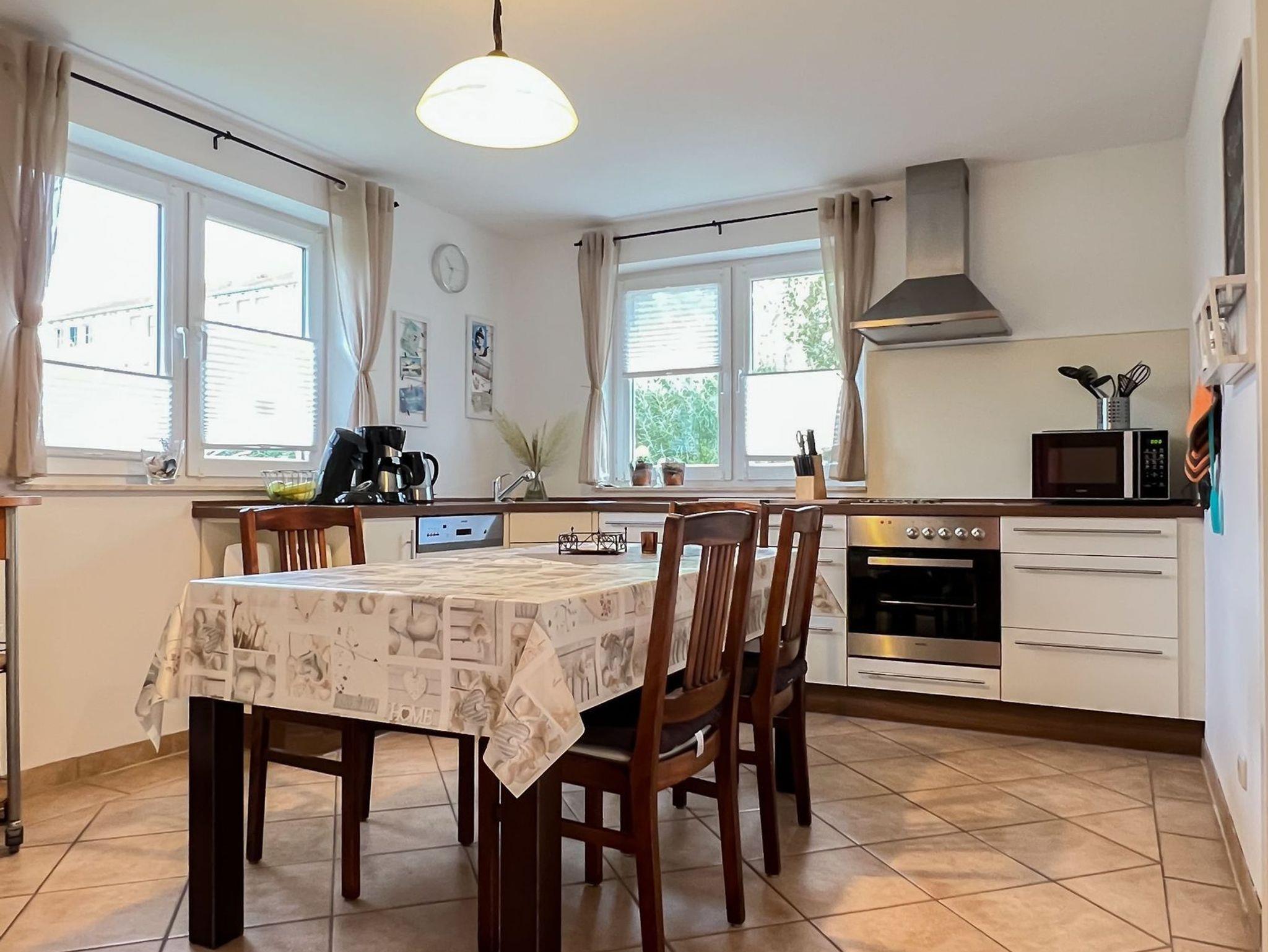 Die hochwertige offene Küche grenzt unmittelbar an den großzügigen Wohnbereich. Dank bodentiefer Fenster und einer angrenzenden Terrasse strömt das Wohnzimmer in hellem, freundlichem Licht. Eine Fußbodenheizung erstreckt sich über die gesamte Wohnung und rundet das behagliche Ambiente ab. Von der Küche aus gelangen Sie in den Hauswirtschaftsraum mit Waschmaschine, der sich ebenfalls ideal zur Aufbewahrung Ihrer Einkäufe und Urlaubsvorräte eignet. Das erste Schlafzimmer ist mit einem Doppelbett ausgestattet, während sich im anderen Zimmer zwei Einzelbetten befinden. Die Böden sind mit Laminat ausgelegt, während der übrige Teil der Wohnung gefliest ist.