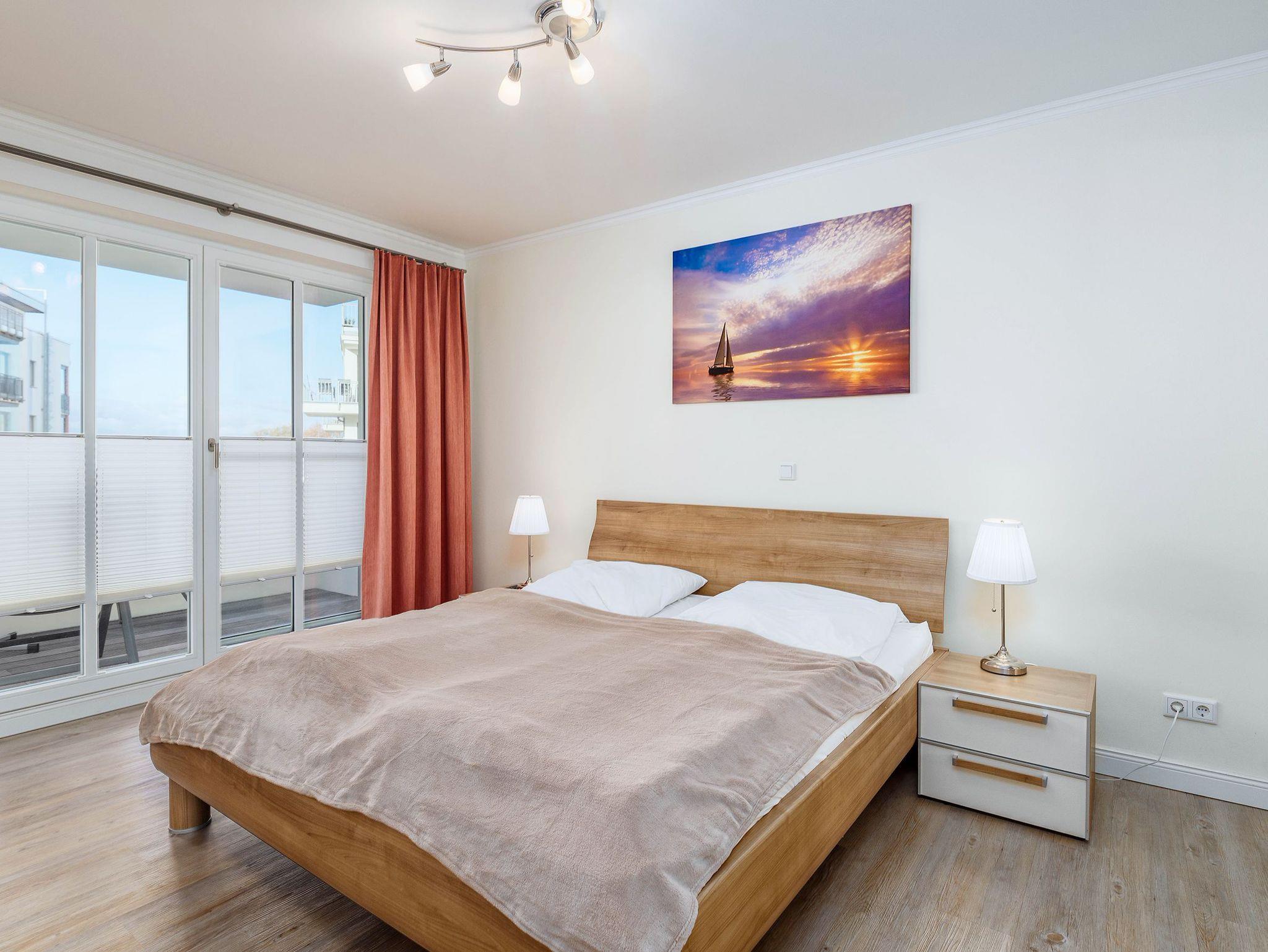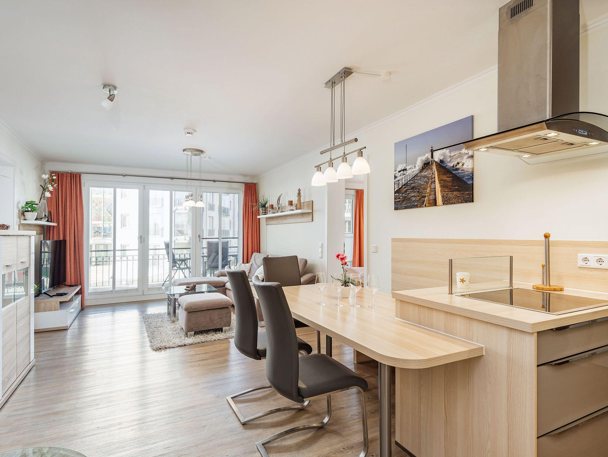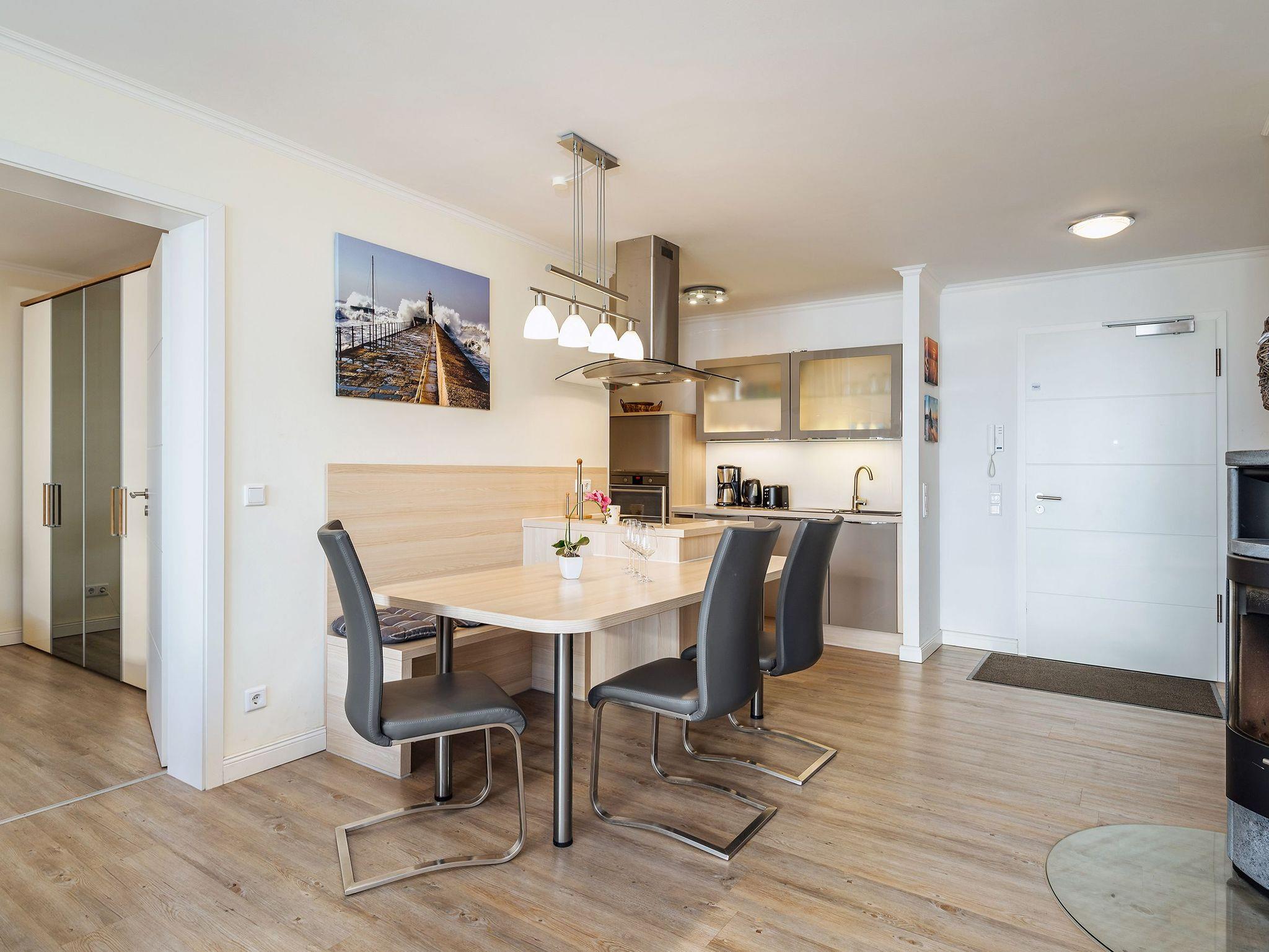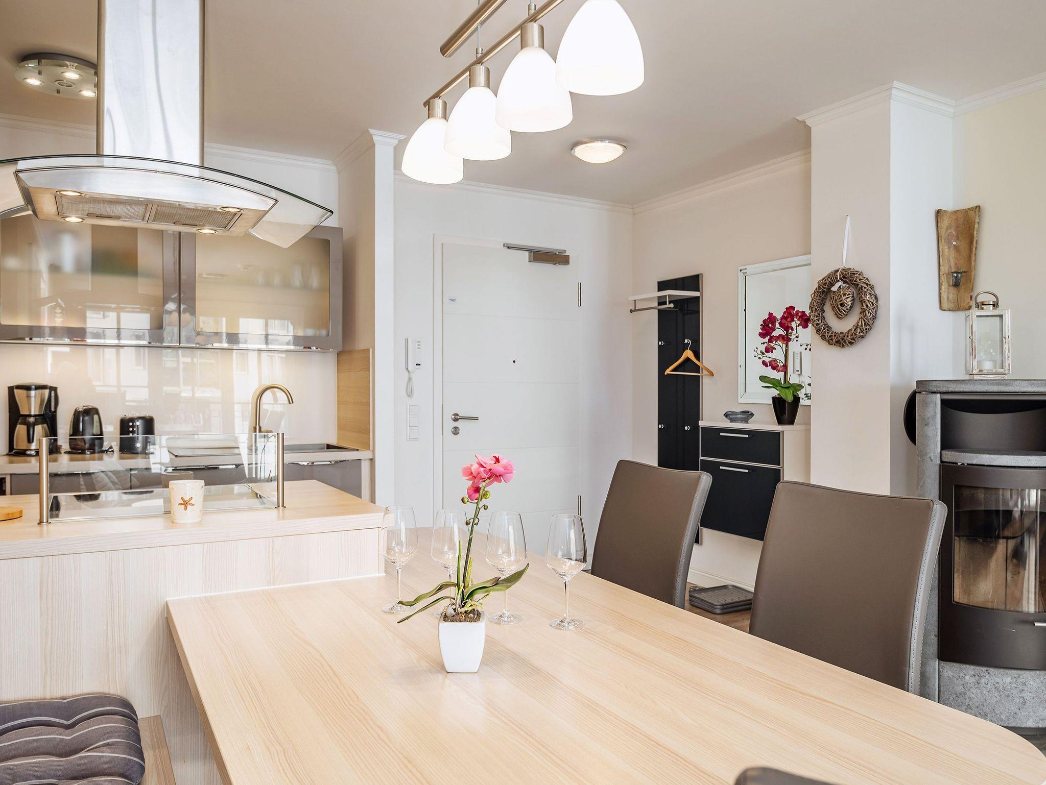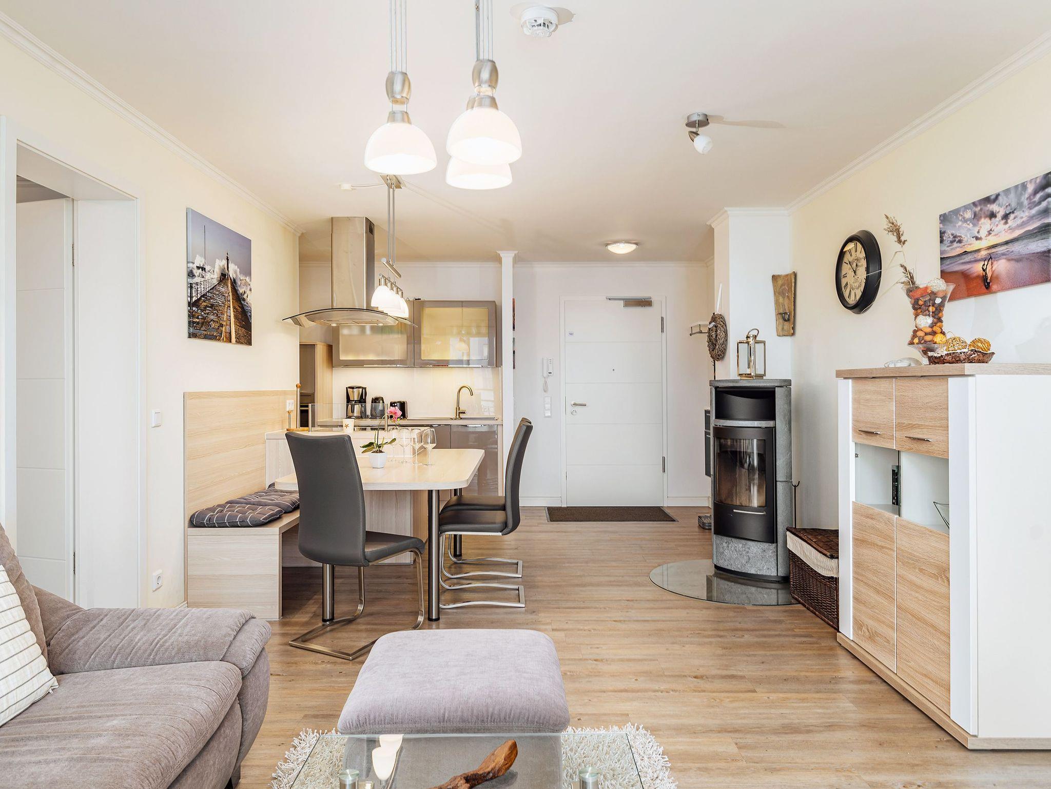Der Wohnbereich ist mit einer Schlafcouch (140 x 200 cm), einem Flachbild-TV, einem Bluray-Player, einem CD-Radio sowie einer kleinen Bücher- und Spielesammlung ausgestattet. Genießen Sie aus den großen Fenstern einen herrlichen Blick auf den kleinen Ort oder direkt vom großen Balkon in Nord-West-Ausrichtung den Blick in Richtung Ostsee. Der Essbereich besteht aus einem großen Holztisch, drei Stühlen und einer Sitzbank. Dieser geht fließend über zur offenen Küche. In dieser stehen ein Backofen, ein separates 4-Platten-Cerankochfeld, eine Kühl-/Gefrierkombination, ein Geschirrspüler, eine Mikrowelle, eine Kaffeemaschine, ein Wasserkocher und ein Toaster für Sie bereit. Der Bodenbelag in der Ferienwohnung ist ein Designbelag. Zudem sind alle Räume der Ferienwohnung mit einer Fußbodenheizung versehen. Der Kaminofen in der Wohnung dient dekorativen Zwecken und ist nicht nutzbar.