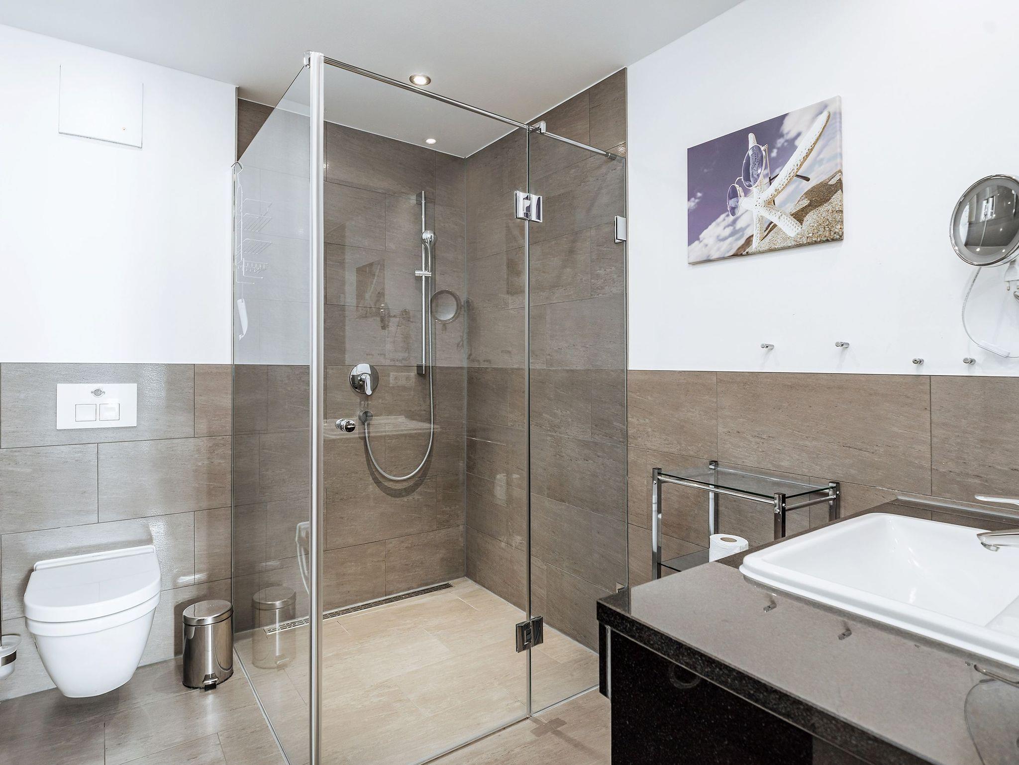 Die gefliesten Bädern sind mit ebenerdiger Dusche, modernem Waschtisch, beleuchtetem Kosmetikspiegel, Handtuchtrockner, Föhn und Radio ausgestattet.