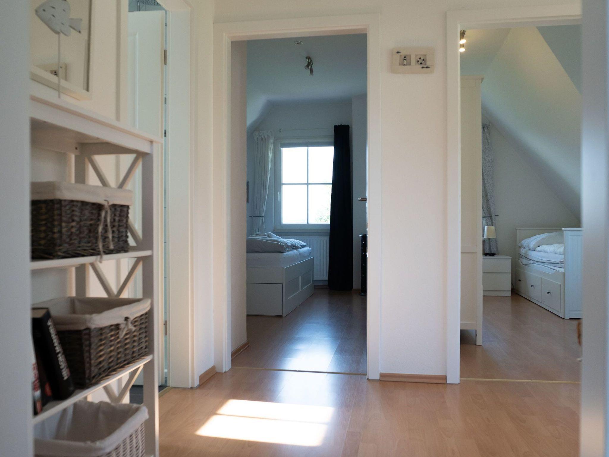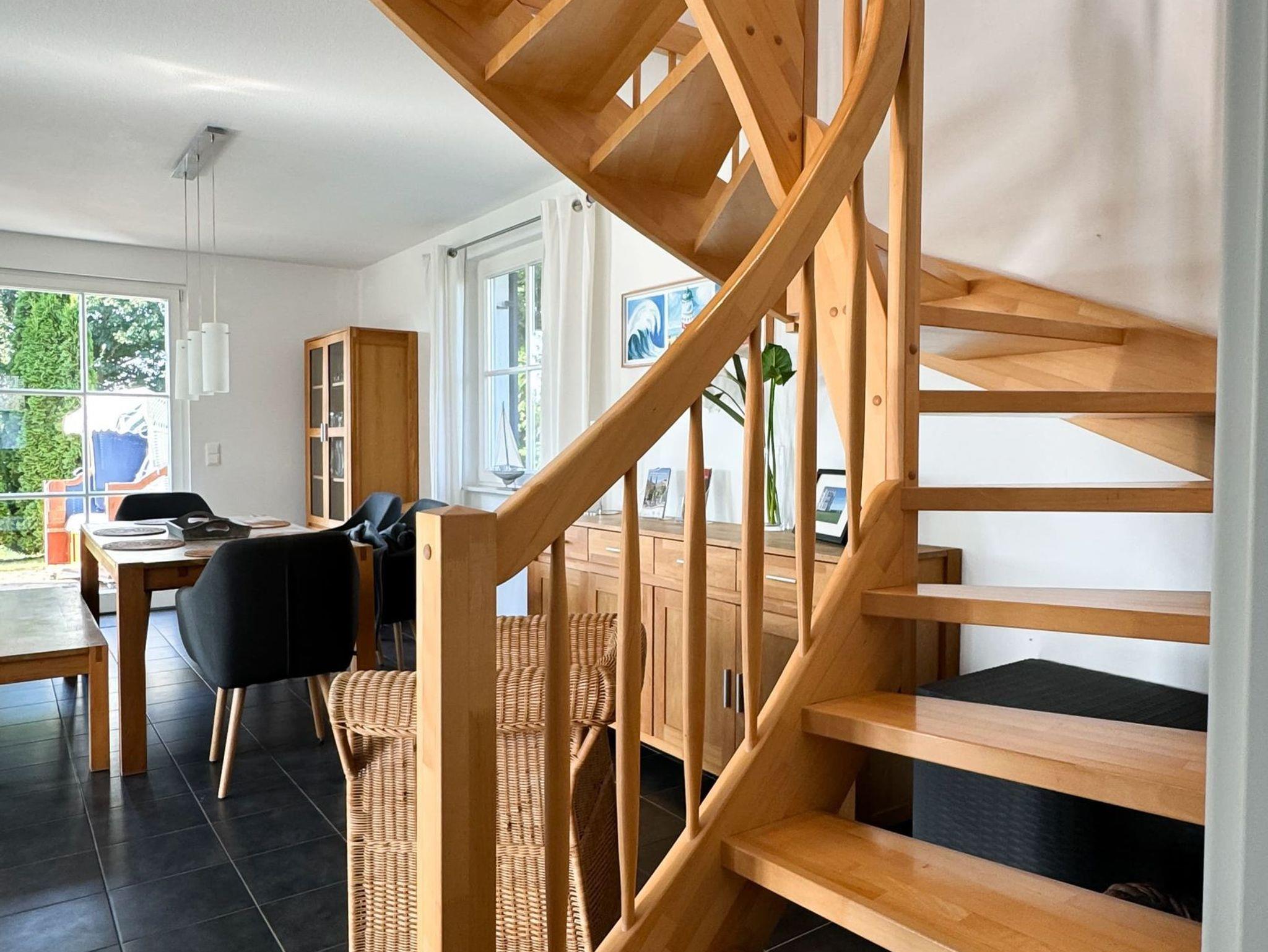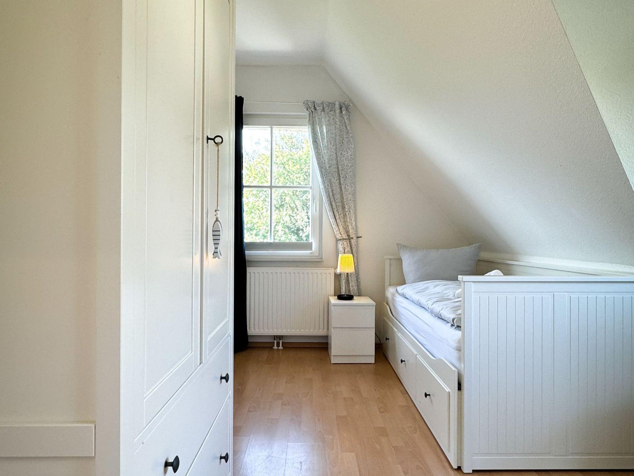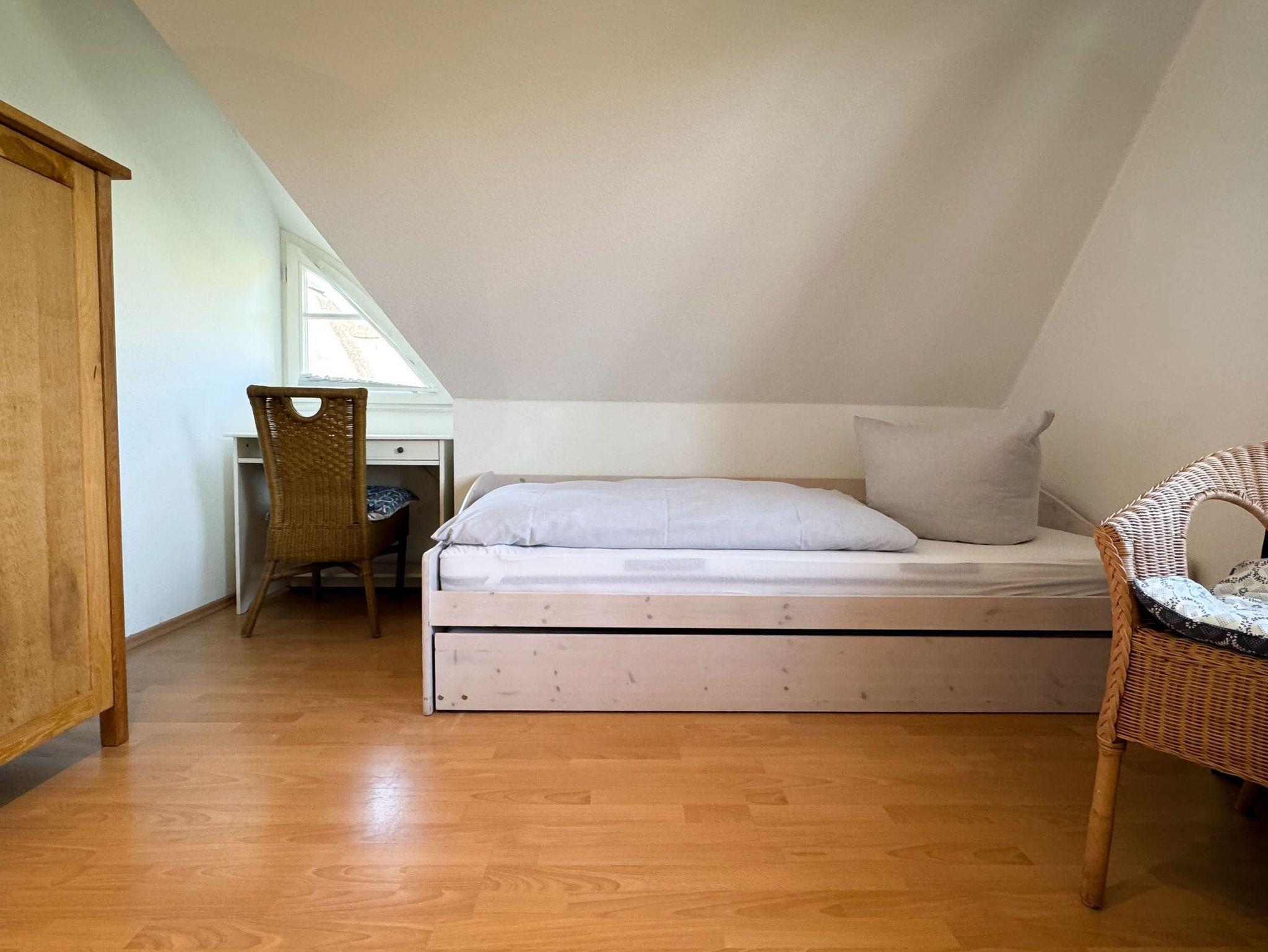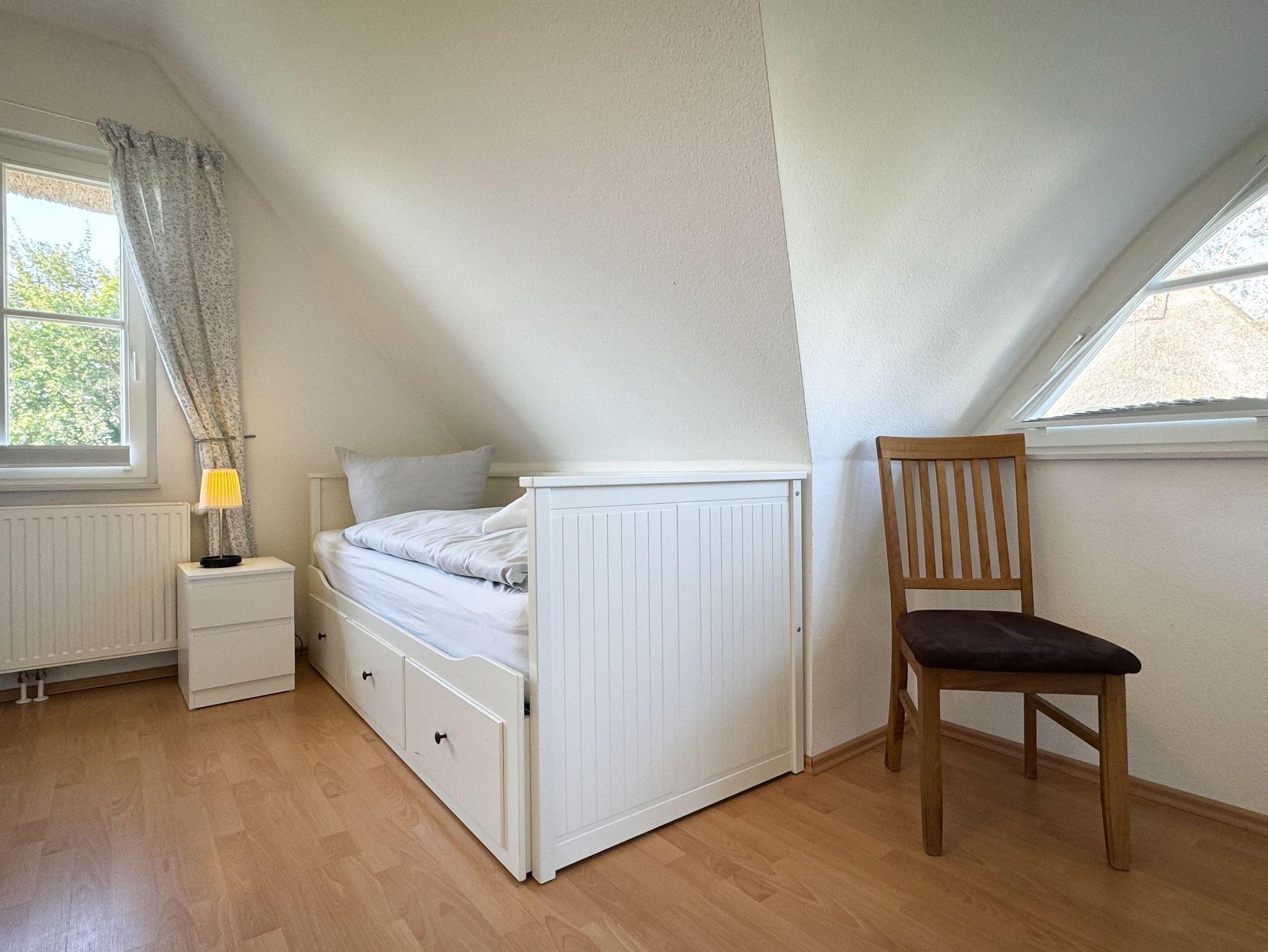 In das Obergeschoss des Hauses gelangen Sie über eine Treppe vom Wohnbereich aus. Dort befinden sich die gemütlichen Schlafzimmer. Das erste Zimmer ist mit zwei Einzelbetten, ein weiteres Schlafzimmer mit einem Doppelbett ausgestattet. Im dritten Schlafzimmer befindet sich neben dem Einzelbett ein Auszieh-Rollbett für zwei weitere Personen. Ein weiteres Duschbad befindet sich in der oberen Etage. Für unsere kleinen Gäste stehen ein Kinderreisebett und ein Kinderhochstuhl bereit.
