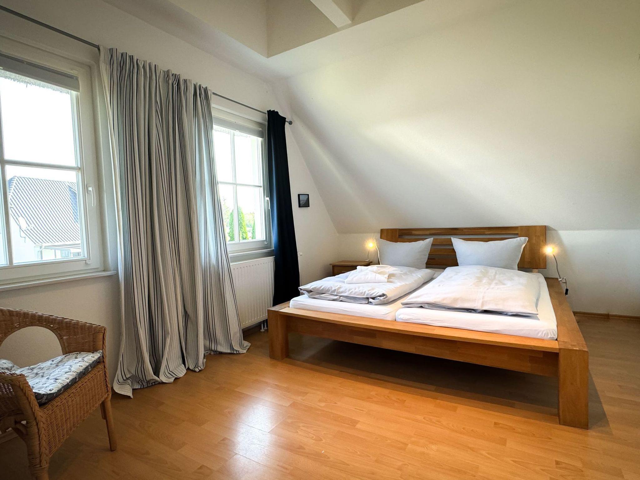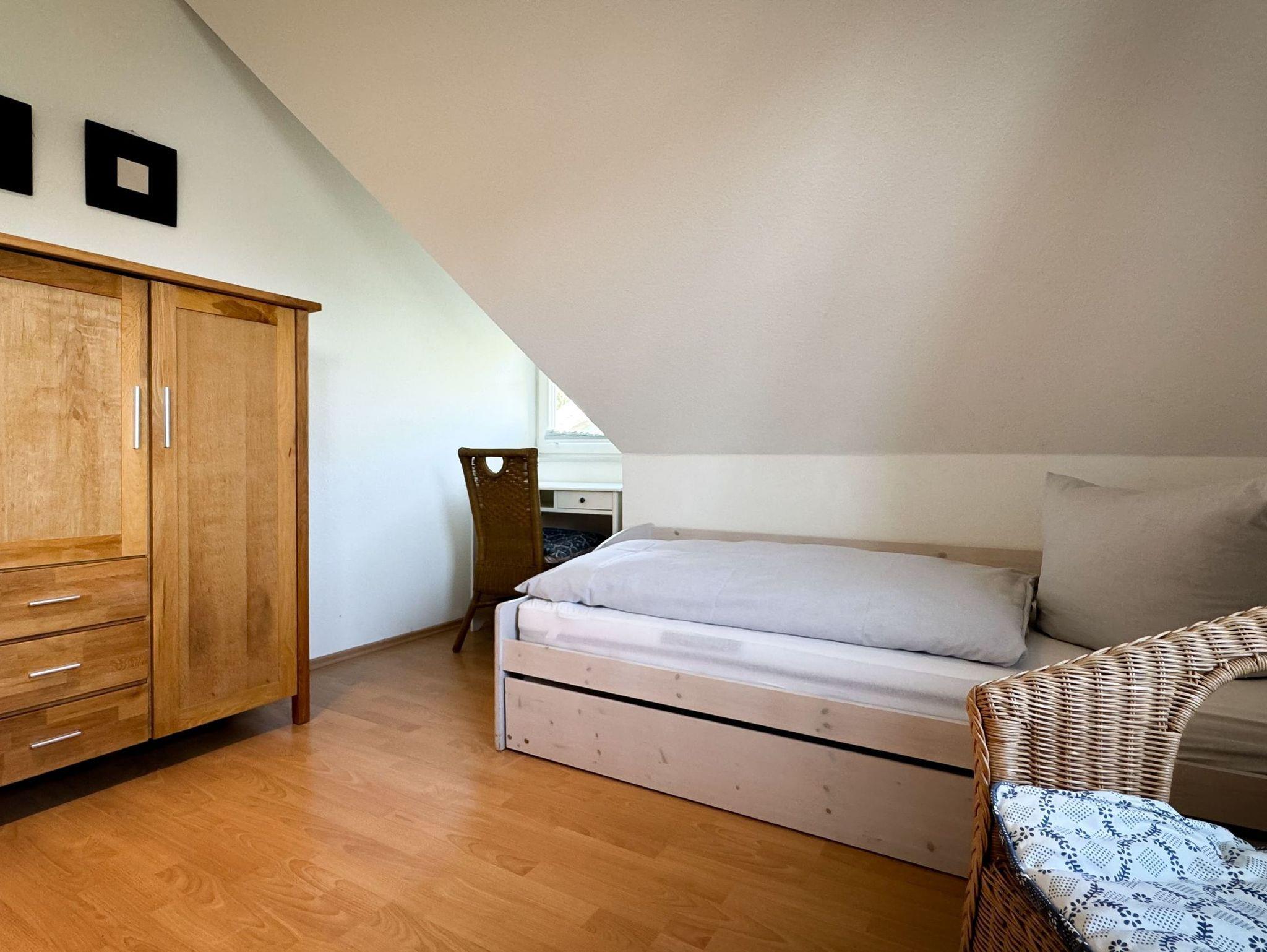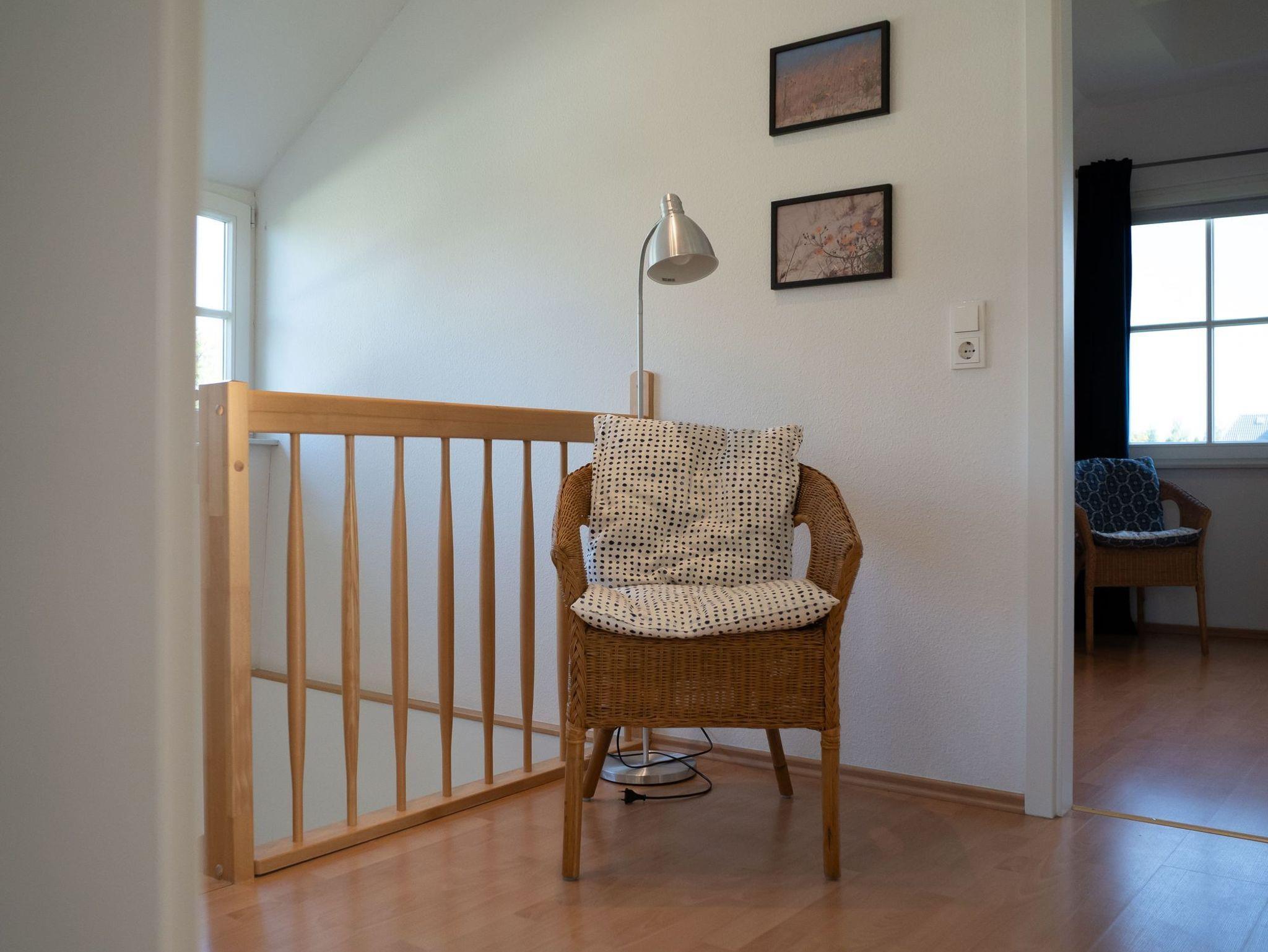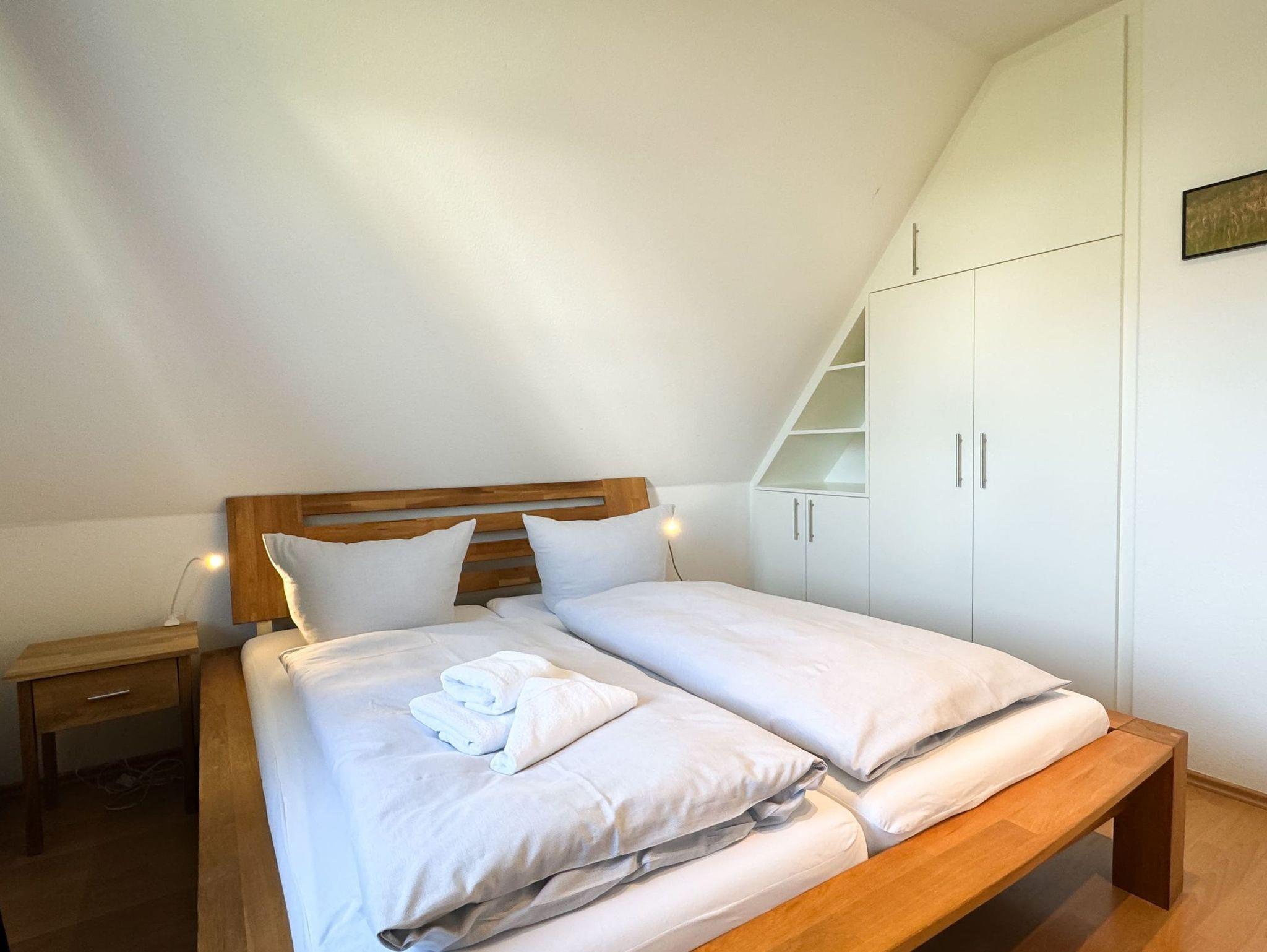 In das Obergeschoss des Hauses gelangen Sie über eine Treppe vom Wohnbereich aus. Dort befinden sich die gemütlichen Schlafzimmer. Das erste Zimmer ist mit zwei Einzelbetten, ein weiteres Schlafzimmer mit einem Doppelbett ausgestattet. Im dritten Schlafzimmer befindet sich neben dem Einzelbett ein Auszieh-Rollbett für zwei weitere Personen. Ein weiteres Duschbad befindet sich in der oberen Etage. Für unsere kleinen Gäste stehen ein Kinderreisebett und ein Kinderhochstuhl bereit.