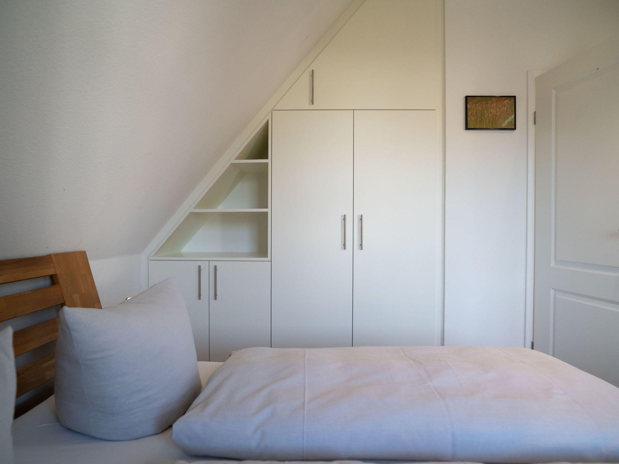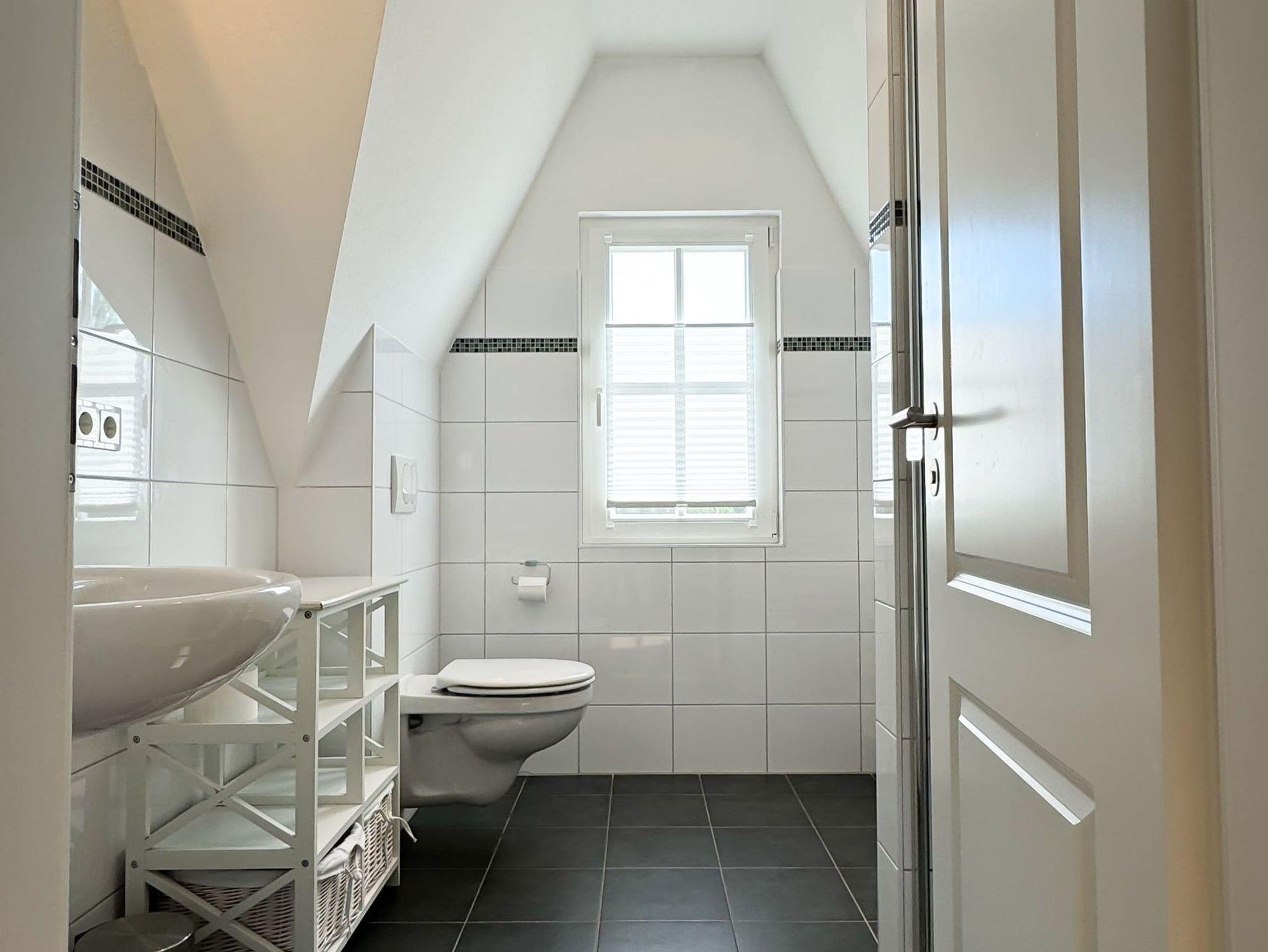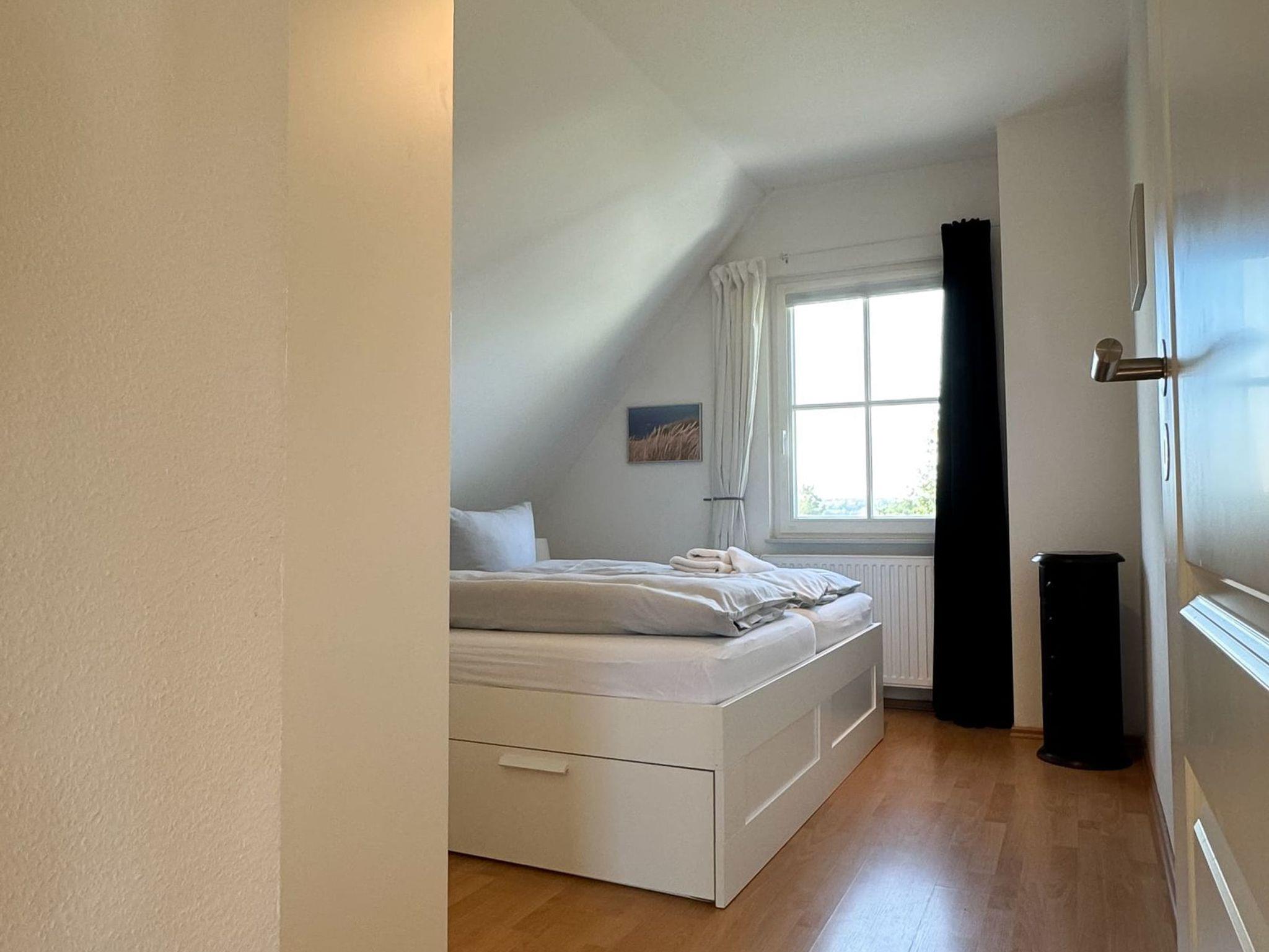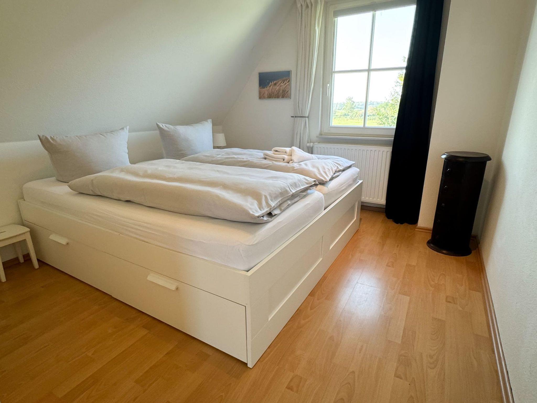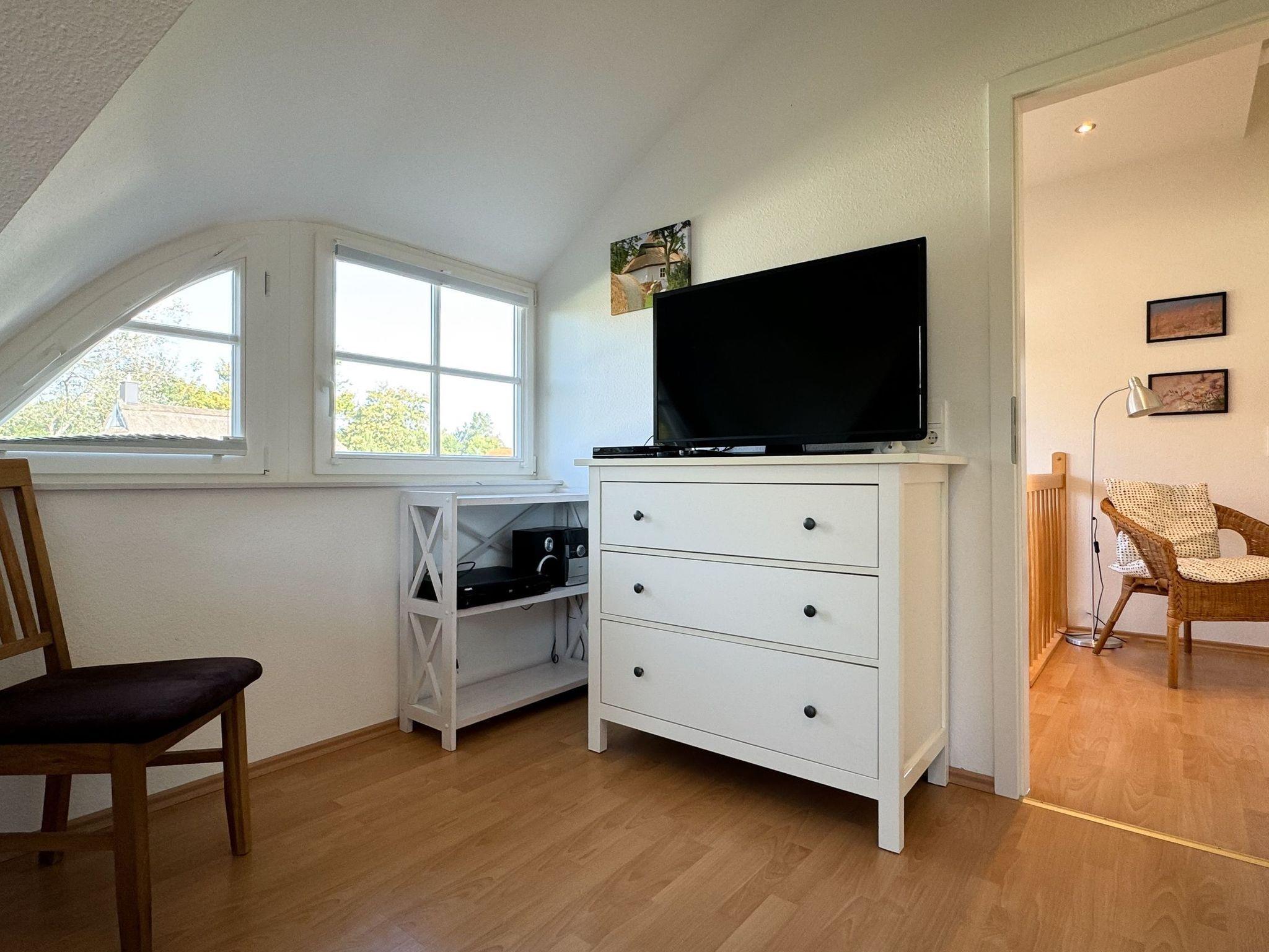 In das Obergeschoss des Hauses gelangen Sie über eine Treppe vom Wohnbereich aus. Dort befinden sich die gemütlichen Schlafzimmer. Das erste Zimmer ist mit zwei Einzelbetten, ein weiteres Schlafzimmer mit einem Doppelbett ausgestattet. Im dritten Schlafzimmer befindet sich neben dem Einzelbett ein Auszieh-Rollbett für zwei weitere Personen. Ein weiteres Duschbad befindet sich in der oberen Etage. Für unsere kleinen Gäste stehen ein Kinderreisebett und ein Kinderhochstuhl bereit.