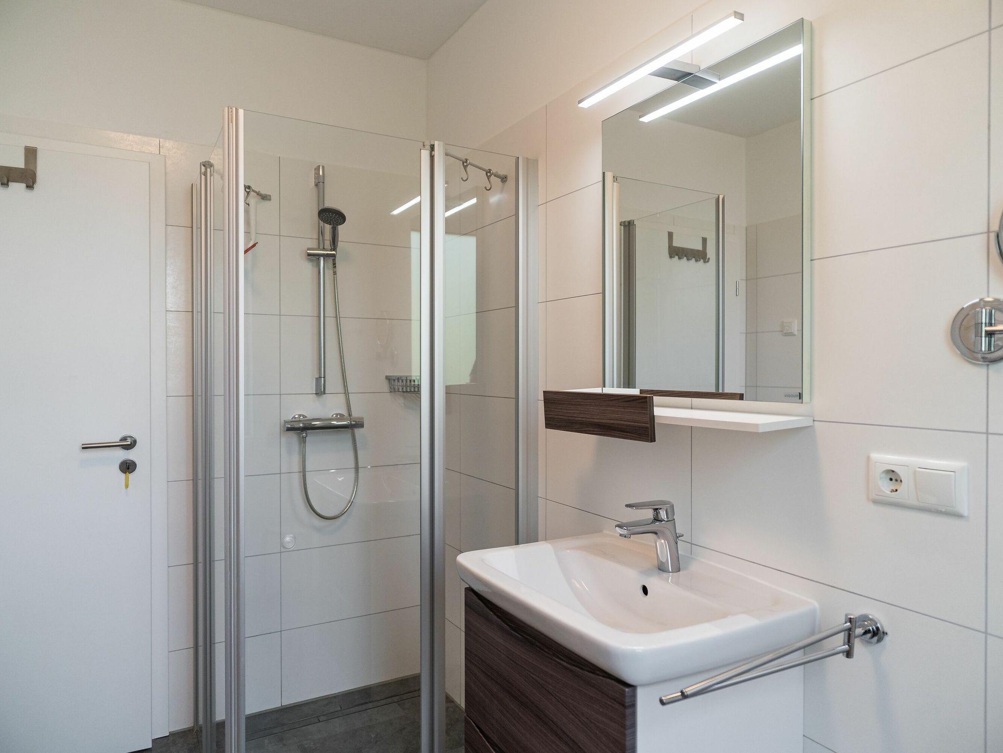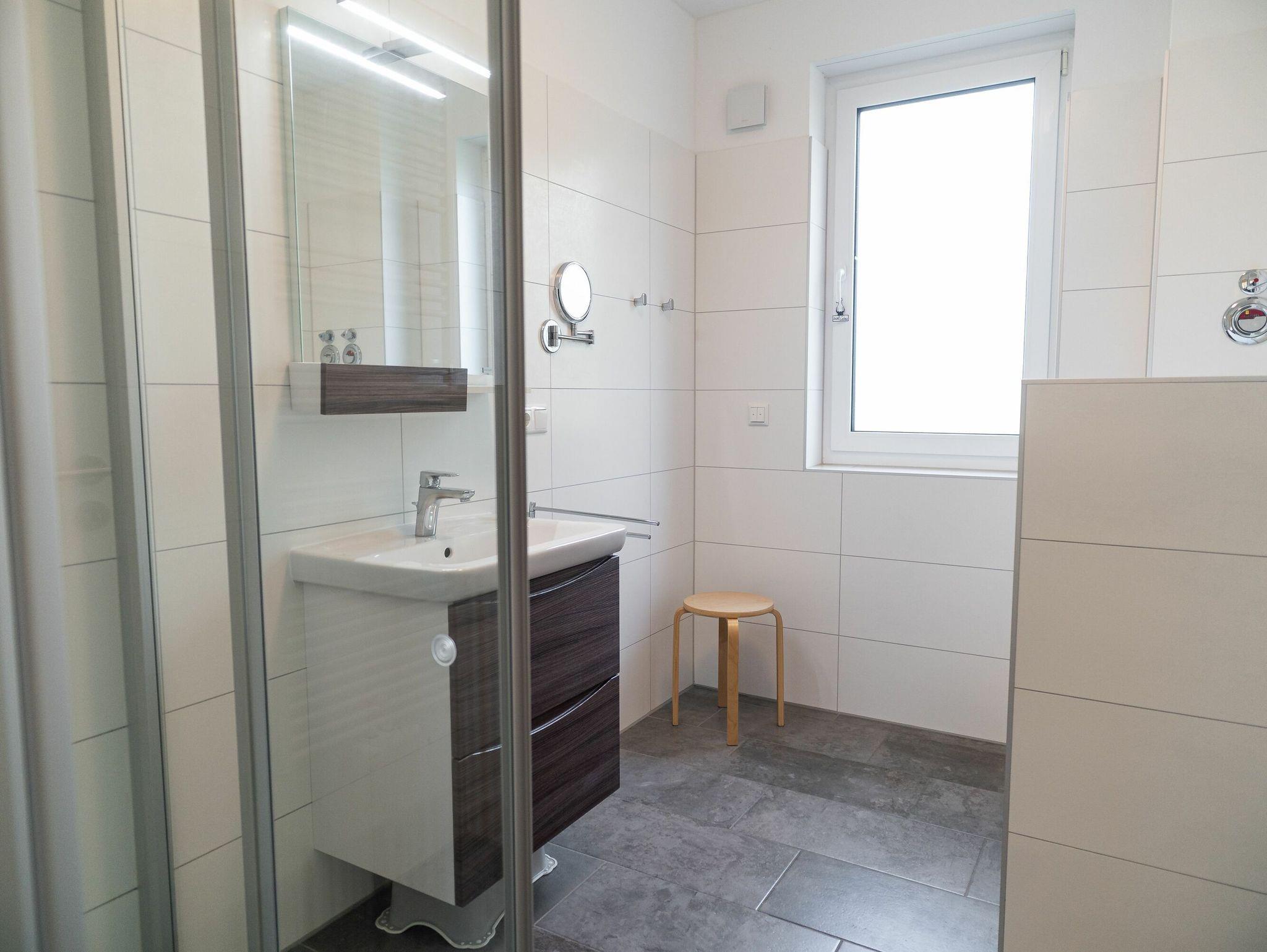 Das helle Badezimmer mit Fenster und bodengleicher Dusche verfügt über einen wandhängenden Badezimmerschrank, einen Waschtisch mit großem Spiegel, einen Kosmetikspiegel, einen Haartrockner und einen beheizbaren Handtuchhalter.