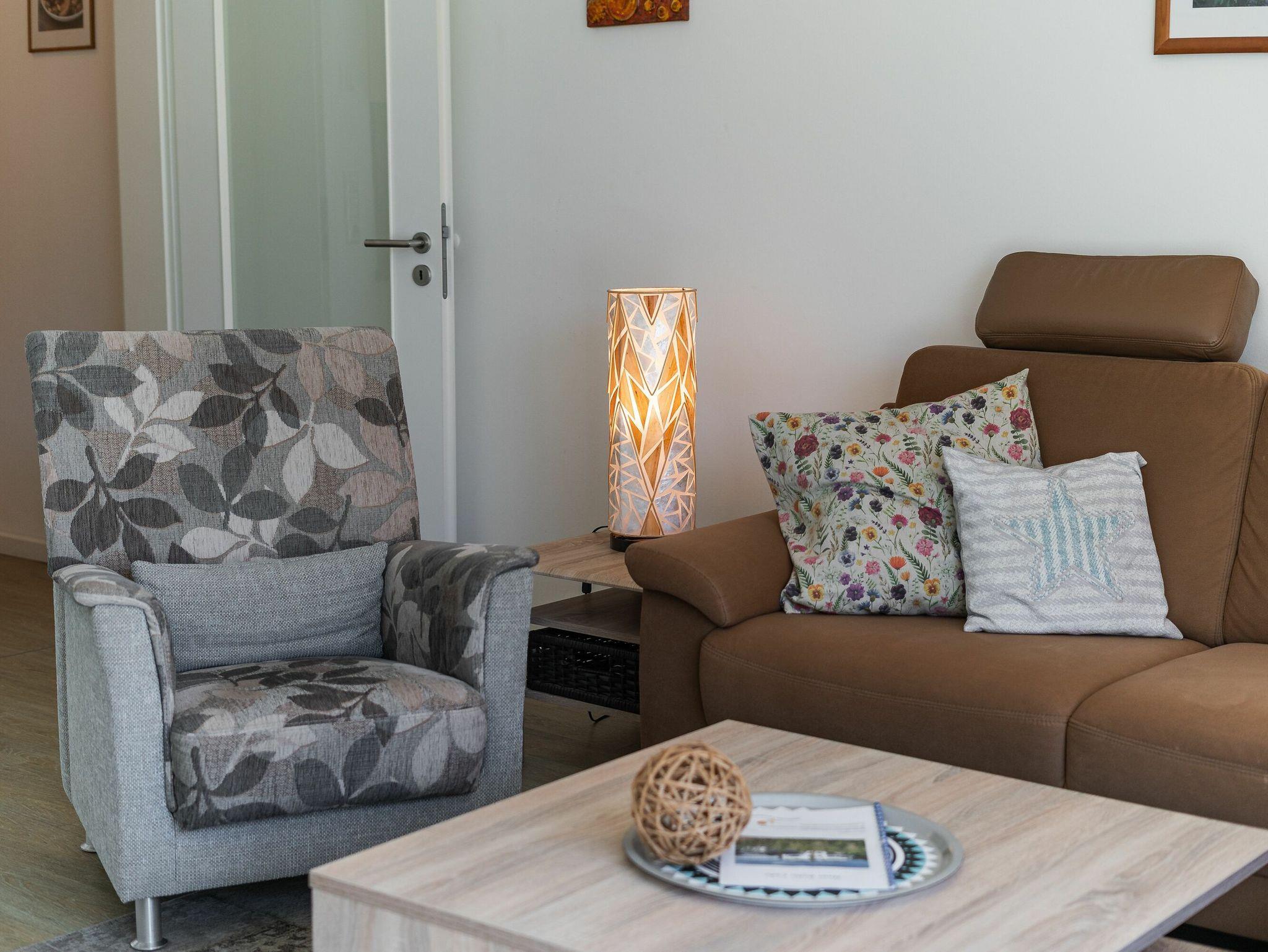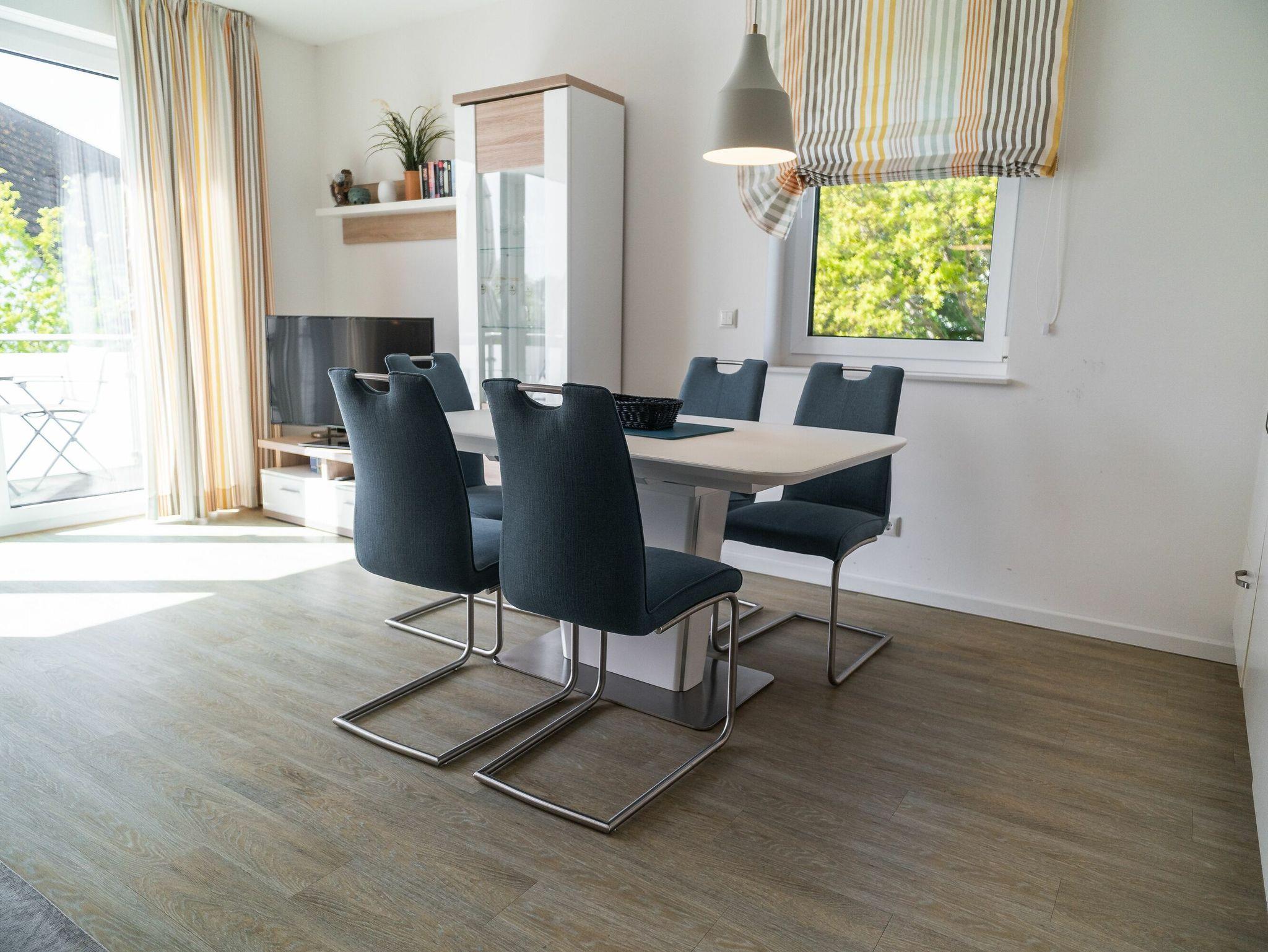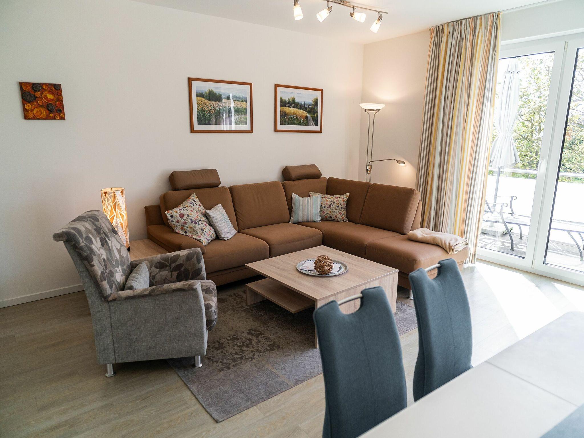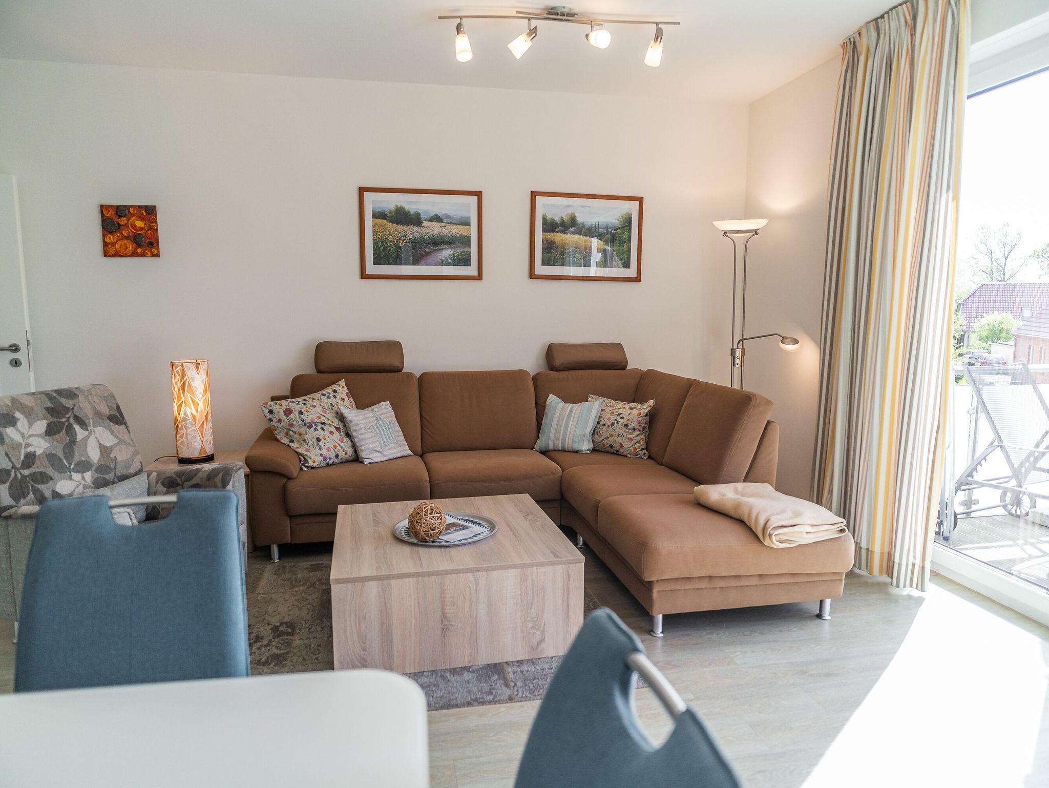 Im hellen und geschmackvoll eingerichteten Wohnzimmer laden eine gemütliche Eckcouch mit passendem Sessel sowie ein großer Esstisch, der für vier Personen bequem Platz bietet, zum Verweilen ein. Bücher und Gesellschaftsspiele befinden sich ebenfalls in der Wohnung. Weiterhin gehören ein LED-TV, ein DVD-Player sowie eine kleine Stereo-Anlage zur technischen Austattung. Vom Wohnzimmer aus gelangen Sie auf den Balkon. Genießen Sie hier ein gemütliches Frühstück in angenehmer Morgensonne, Balkonmöbeln und Sonnenschirm sind vorhanden.