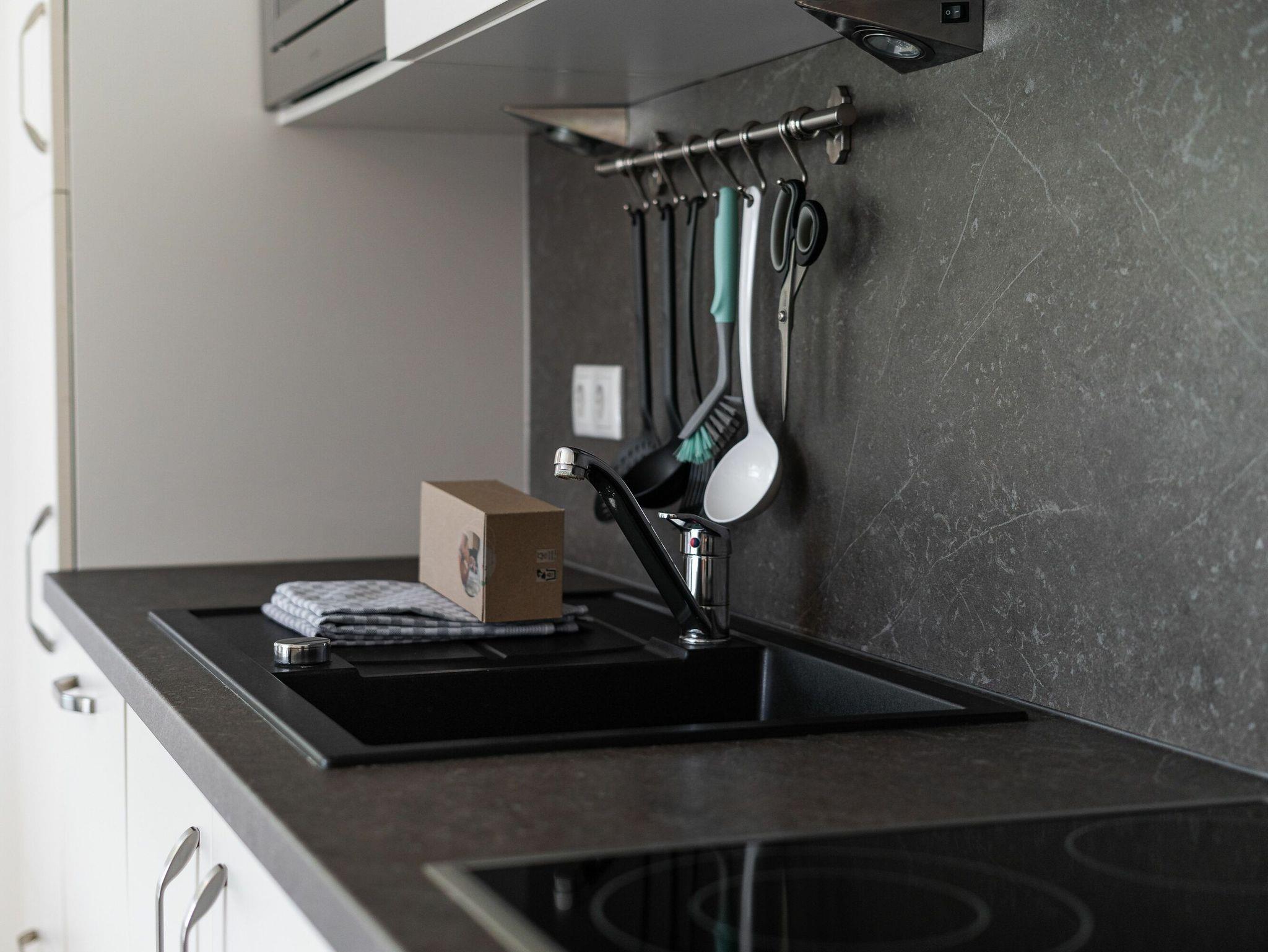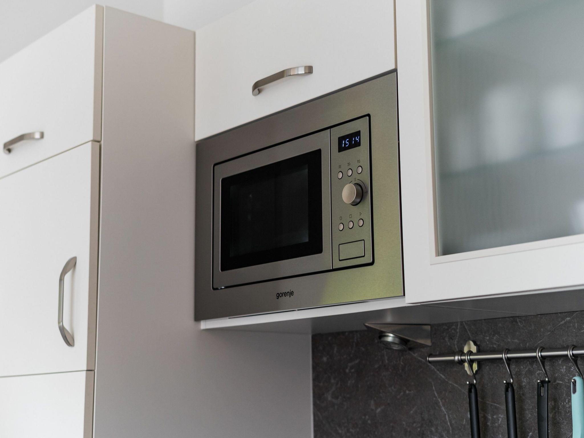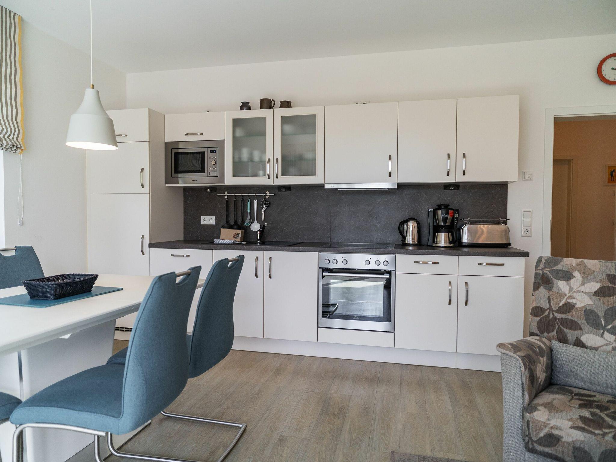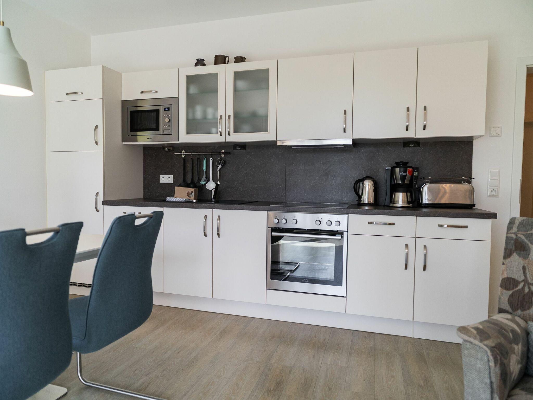Die Einbauküche ist vol ausgestattet mit Geschirrspüler, Kühlschrank, Tiefkühler, Backofen, Cerankochfeld, Toaster, Kaffeemaschine, Wasserkocher und Mikrowelle. Geschirr und Gläser sind in ausreichender Anzahl vorhanden.