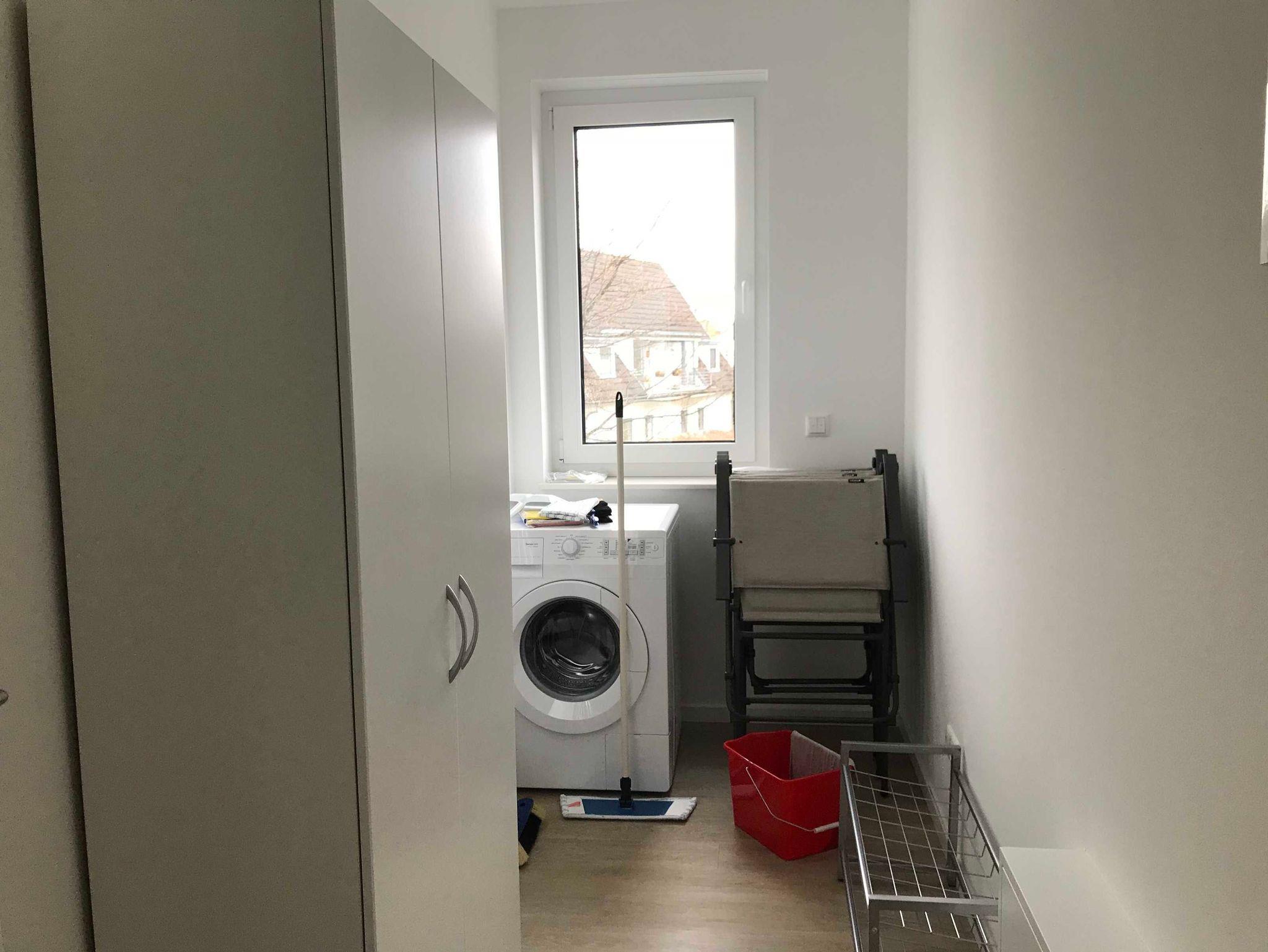 Im eigenen Wirtschaftraum in der Wohnung befindet sich eine Waschmaschine und der Wäschetrockenständer mit Bügelbrett und Bügeleisen.