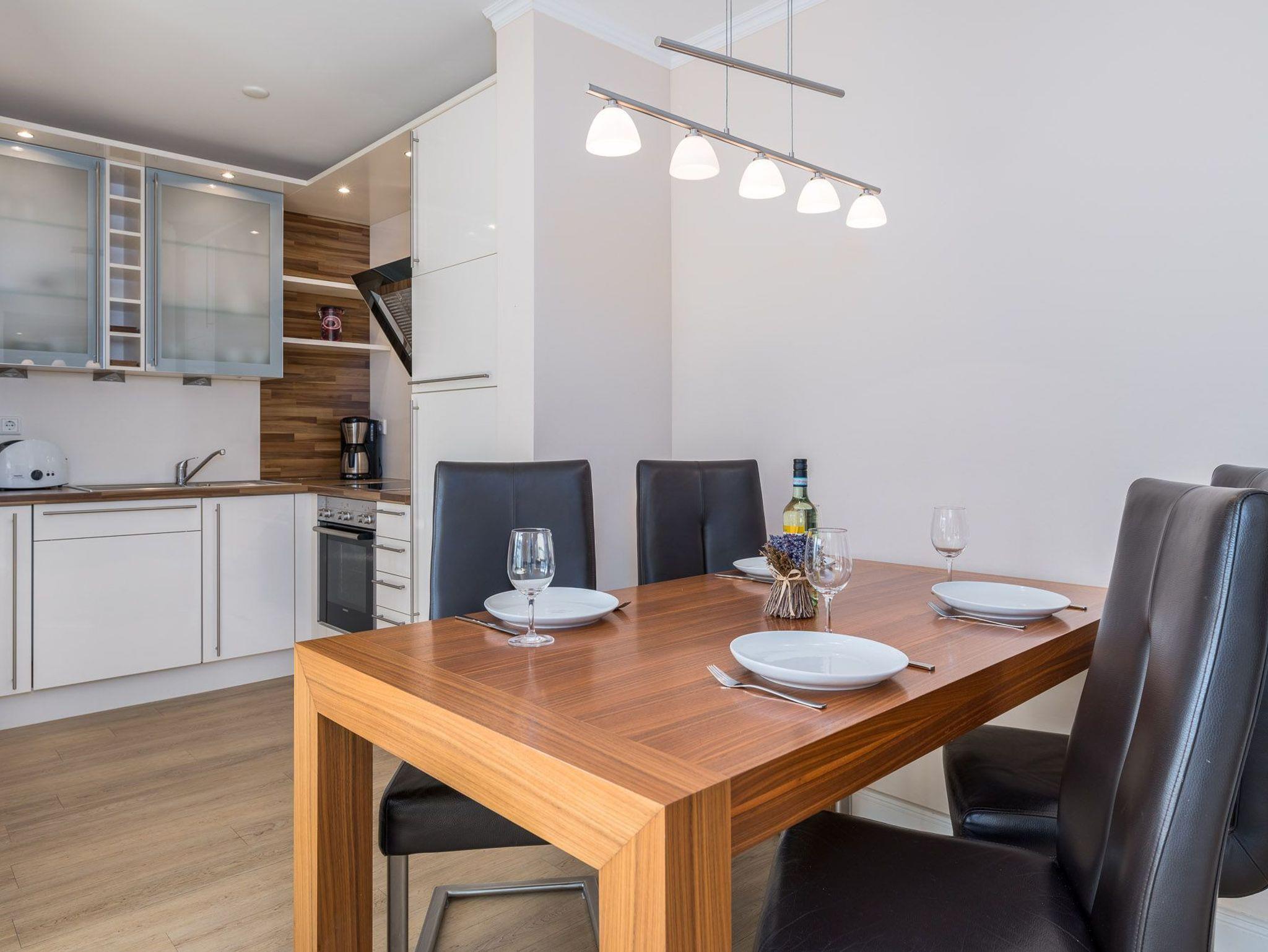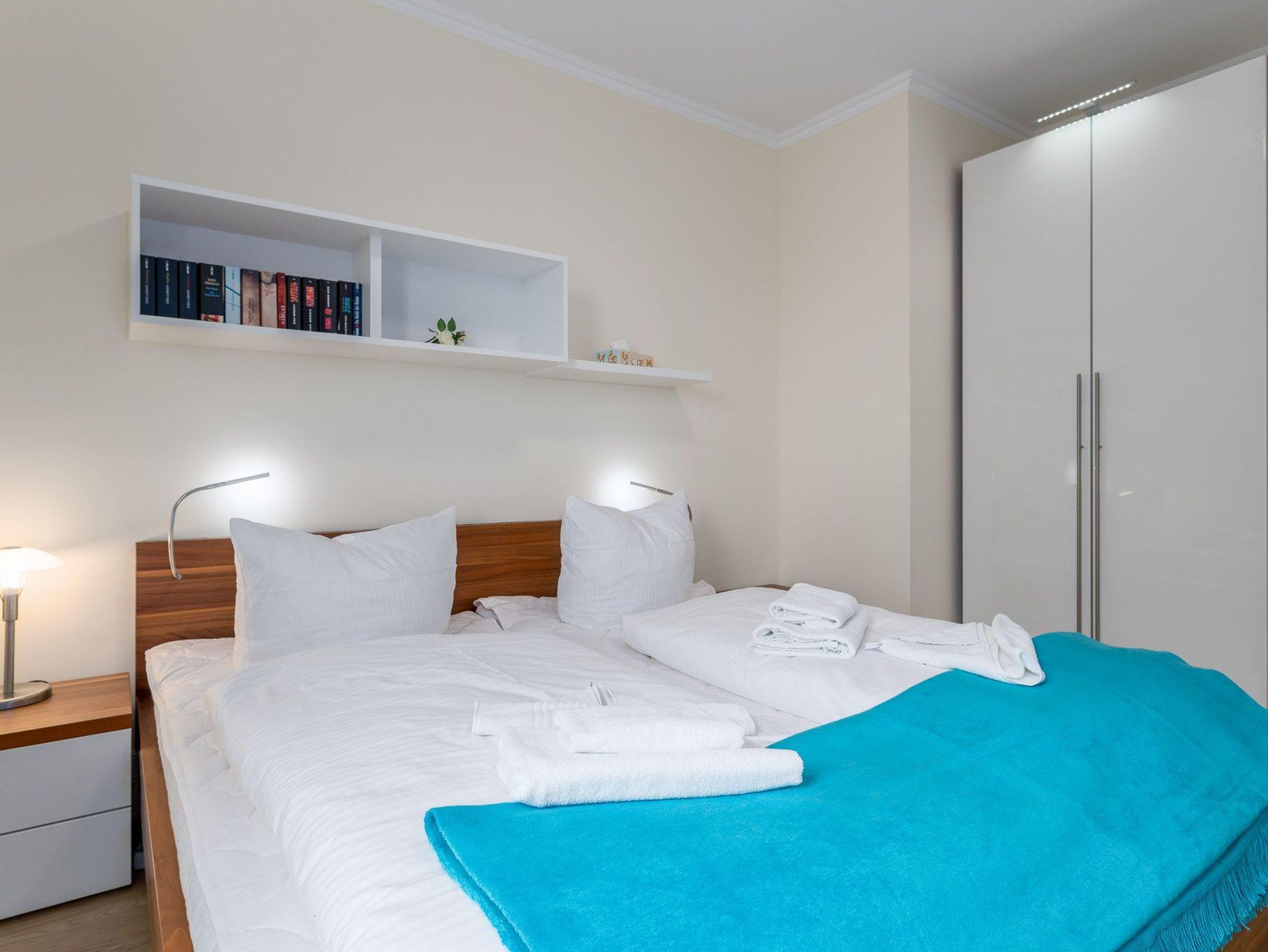 Die 2011 erbaute Unterkunft liegt nur 50 m vom Ostseestrand entfernt. Der helle, lichtdurchflutete Wohnraum empfängt Sie mit stilvollem Gas- Kamin, TV- Gerät, DVD-Spieler und gemütlicher Leder-Sitzecke. Im dortigen Essbereich, der mit einem Massivholz-Esstisch und bequemen Stühlen eingerichtet wurde, können gesellige Mahlzeiten und auch Spieleabende der ganzen Familie stattfinden. Die offene Einbauküche ist ausgestattet mit Siemens-Einbaugeräten (Geschirrspüler, Mikrowelle, Cerankochfeld, Backofen), Dunstabzugshaube, Kühlschrank mit Gefrierfach, Kaffeemaschine, Wasserkocher und Toaster. In den beiden wunderschönen Schlafzimmern sorgen je ein Doppelbett (hochwertige Kaltschaum-Matratzen auf Lattenrost) für den erholsamen Urlaubsschlaf. Für den nötigen Stauraum Ihrer Urlaubskleidung sind mehrere raumhohe Kleiderschränke eingebaut worden. Zusätzlich steht ein separater Abstellraum in der Wohnung bereit. Eines der Schlafzimmer verfügt zudem über ein weiteres TV-Gerät. Das elegante Duschbad besticht mit einer ebenerdigen Dusche, inklusive Glasabtrennung und Handtuchtrockner. Angrenzend befinden sich ein weiteres Gäste-WC. Zu einem sonnigen Frühstück lockt der charmante Eck-Balkon mit Meerblick in Nord-Ost-Ausrichtung. Eine Fußbodenheizung in allen Räumen ist für angenehme Wärme zuständig. Zur Wohnung gehören zudem ein kostenfreier Tiefgaragenstellplatz und eine Abstellmöglichkeit für Fahrräder. Bitte beachten Sie die Durchfahrtshöhe von max. 1,90 m der Tiefgarage. Mit dem Personenaufzug gelangen Sie von der Tiefgarage aus direkt zu Ihrer Wohnung. Im Erdgeschoss der Wohnung befindet sich ein gekennzeichneter Abstellbereich für Kinderwagen. Hier noch einige Hinweise: Es handelt sich um eine Nichtraucherwohnung. Haustiere sind nicht erlaubt. Das kostenfreie WLAN in der Unterkunft ist ausschließlich für die Verwendung von Social Media und den Austausch von Bildern mit Familie und Freunden gedacht. Die Nutzung zum Streamen von Filmen ist nicht vorgesehen. Wäschesets, Kinderreisebett und Kinderhochstuhl können kostenpflichtig zugebucht werden. Eine Waschmaschine und ein Trockner stehen im separaten Hauswirtschaftsraum im Untergeschoss der Villa zu Ihrer Verfügung (gegen Gebühr / 1,00 Euro Münzen). Sichern Sie sich einen der begehrten Strandkörbe nur ein paar Meter entfernt von den rauschenden Wellen der Ostsee (Anfang Mai - Ende August) und buchen Sie jetzt zu besonderen Konditionen (12,00 Euro pro Tag oder 75,00 Euro pro Woche.)