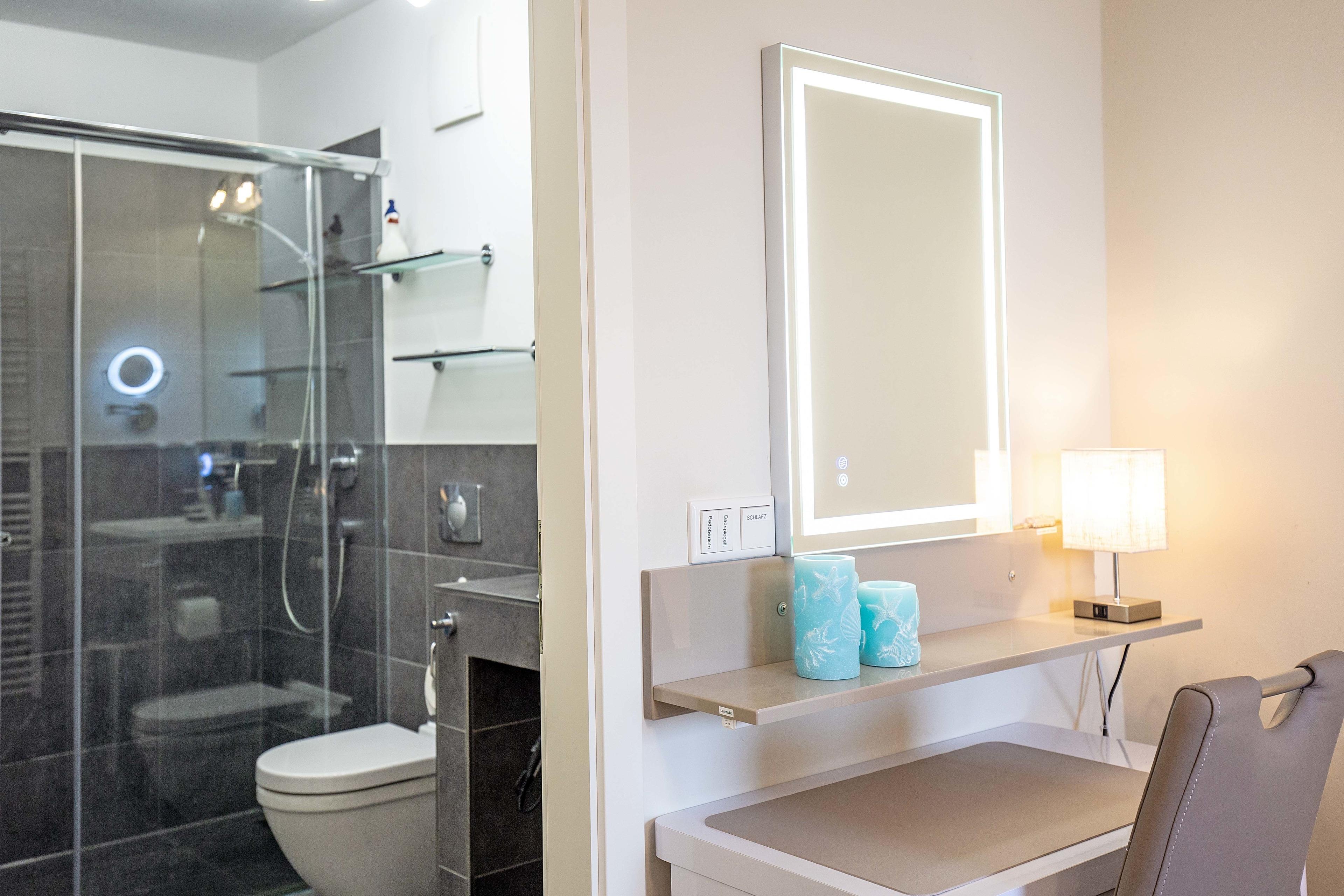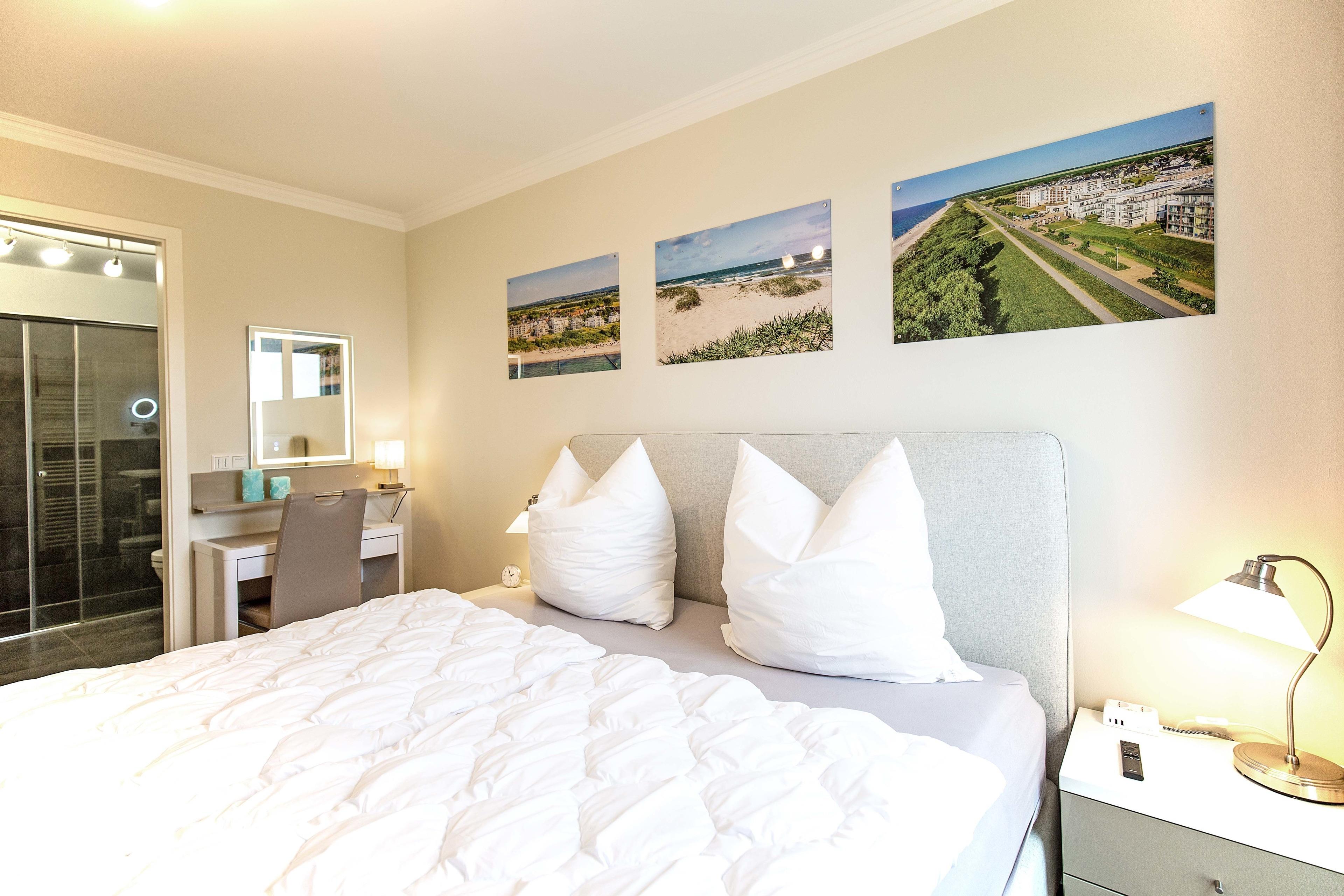 Zwei Schlafzimmer mit modernen Boxspringbetten und zwei komfortable Bäder.