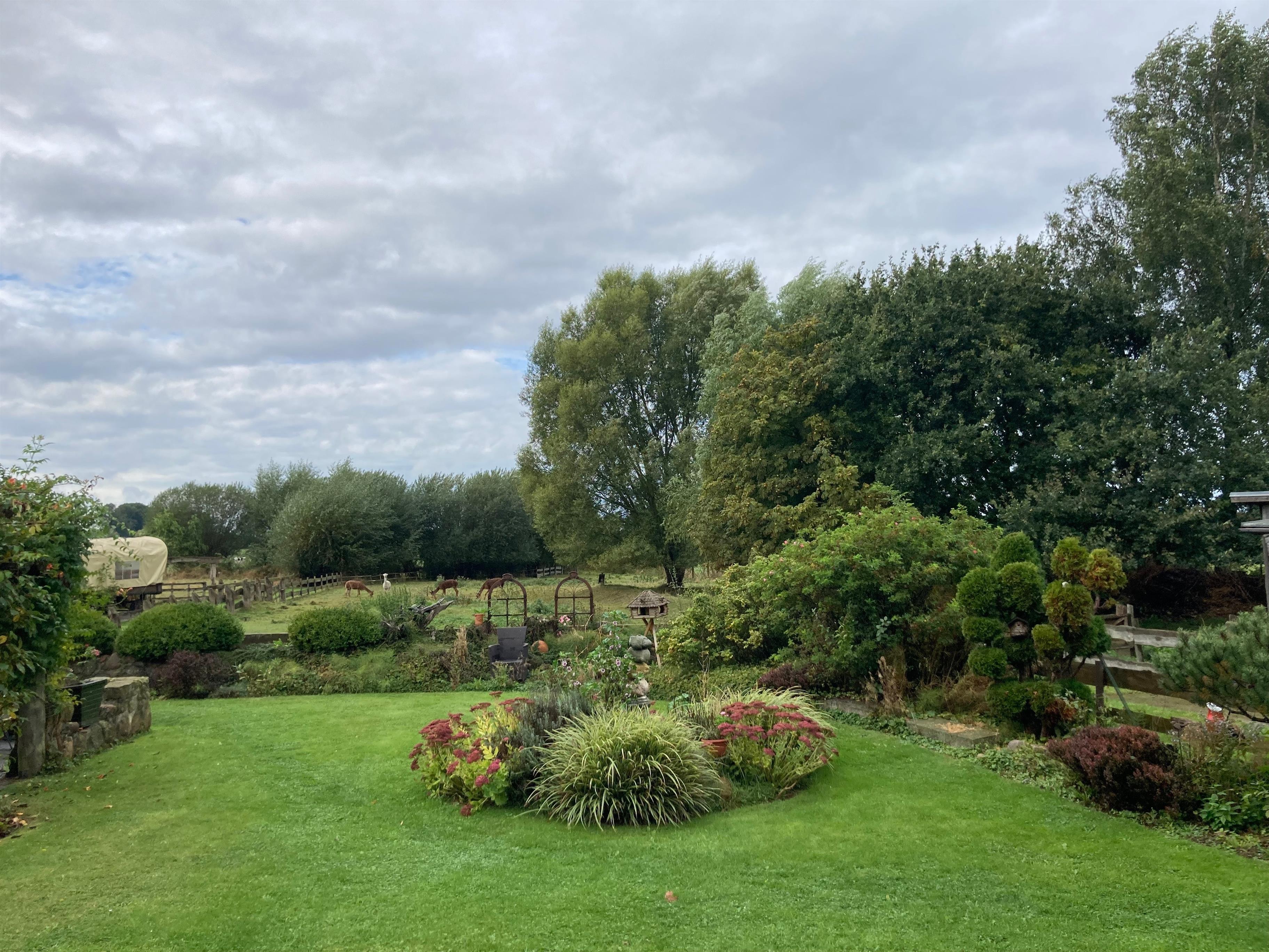 Offizierzimmer 1 hat einen tollen Ausblick auf den Garten mit direktem Zugang über eine Terasse. Neben Sitzmöglichkeiten haben Sie einen Blick auf die Alpakakoppel. Genießen Sie die Abendstimmung auf Hus un Köken.