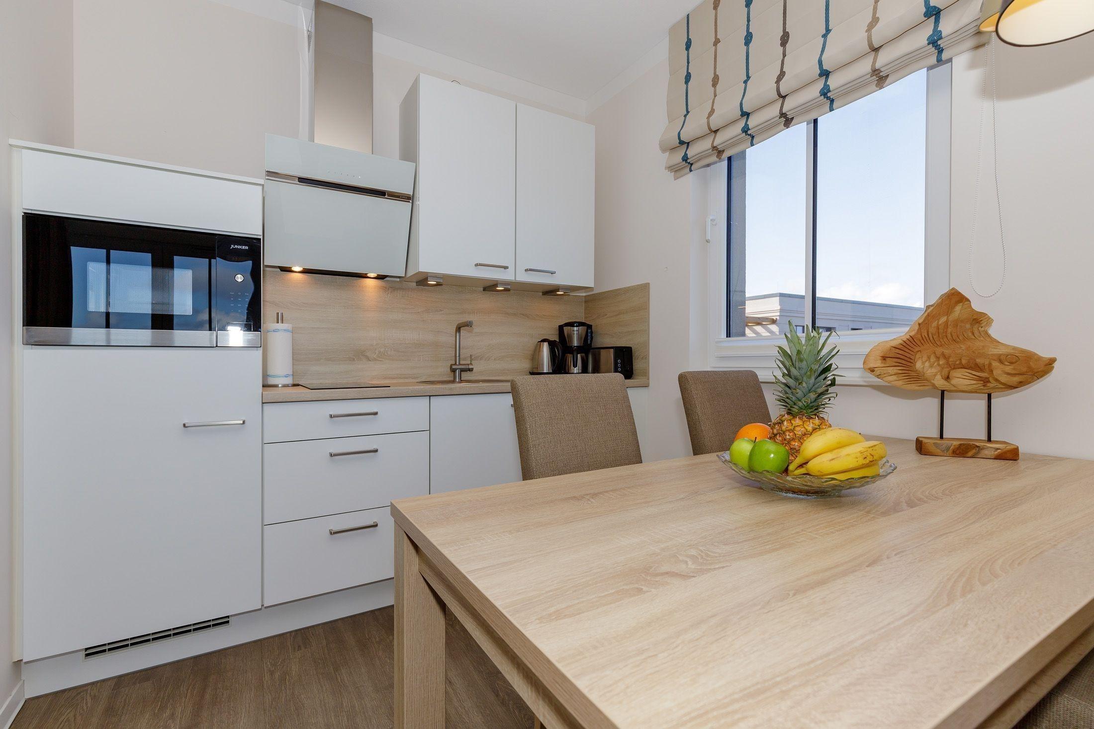 Die offene Küche mit integriertem Essbereich besitzt einen Geschirrspüler, Gefrierfach, Toaster, Kaffeemaschine, Mikrowelle, 2-Platten-Ceranfeld und Wasserkocher.