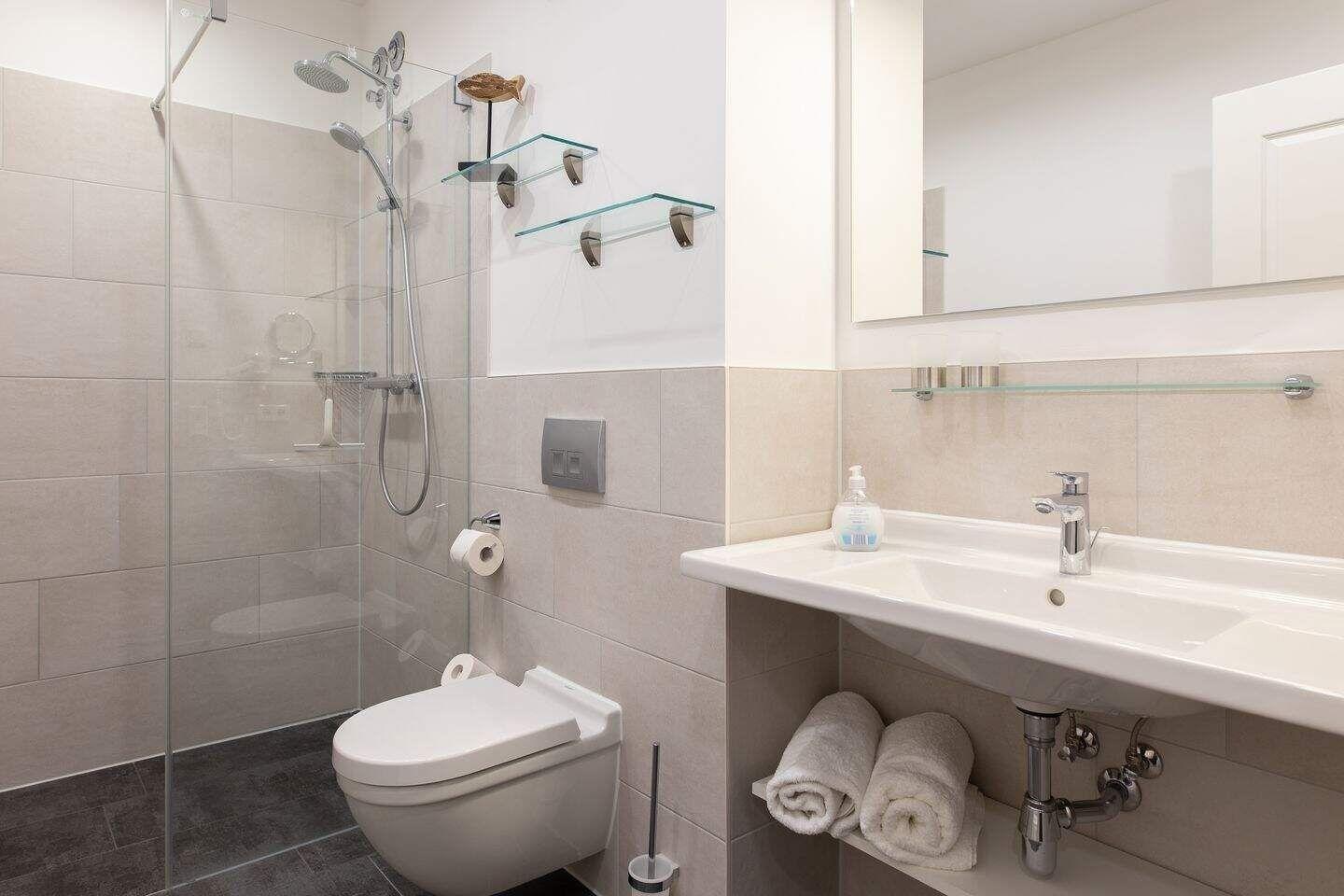 Die offene Regendusche ist das Highlight des Badezimmers und ausgestattet mit einem Handtuchwärmer, einem Waschtisch mit Kosmetikspiegel und einem Haartrockner.