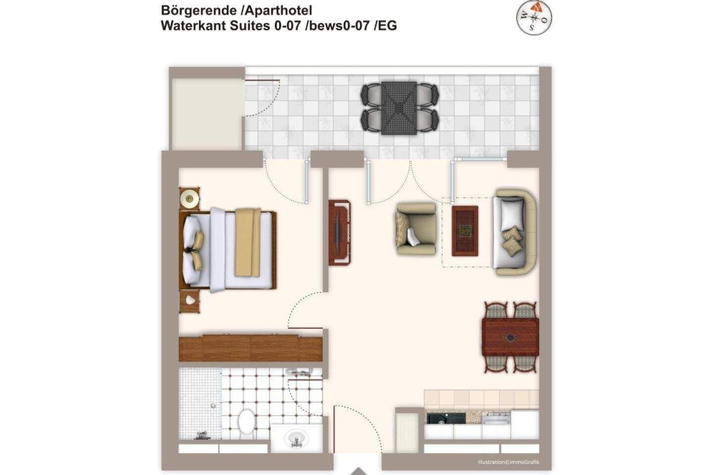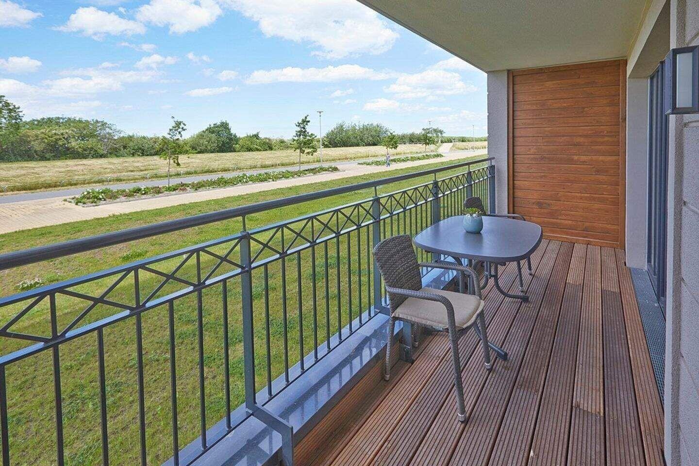 Der überdachte Balkon ist sowohl vom Wohnzimmer als auch vom Schlafzimmer aus begehbar. Natürlich stehen Ihnen hier auch Terrassenmöbel zur Verfügung, sodass Sie beispielweise Ihr Frühstück oder Ihr Abendessen ganz privat im Sonnenschein zu sich nehmen können. Die Waterkant Suites liegen direkt an der Promenade in Börgerende und somit direkt am Meer.