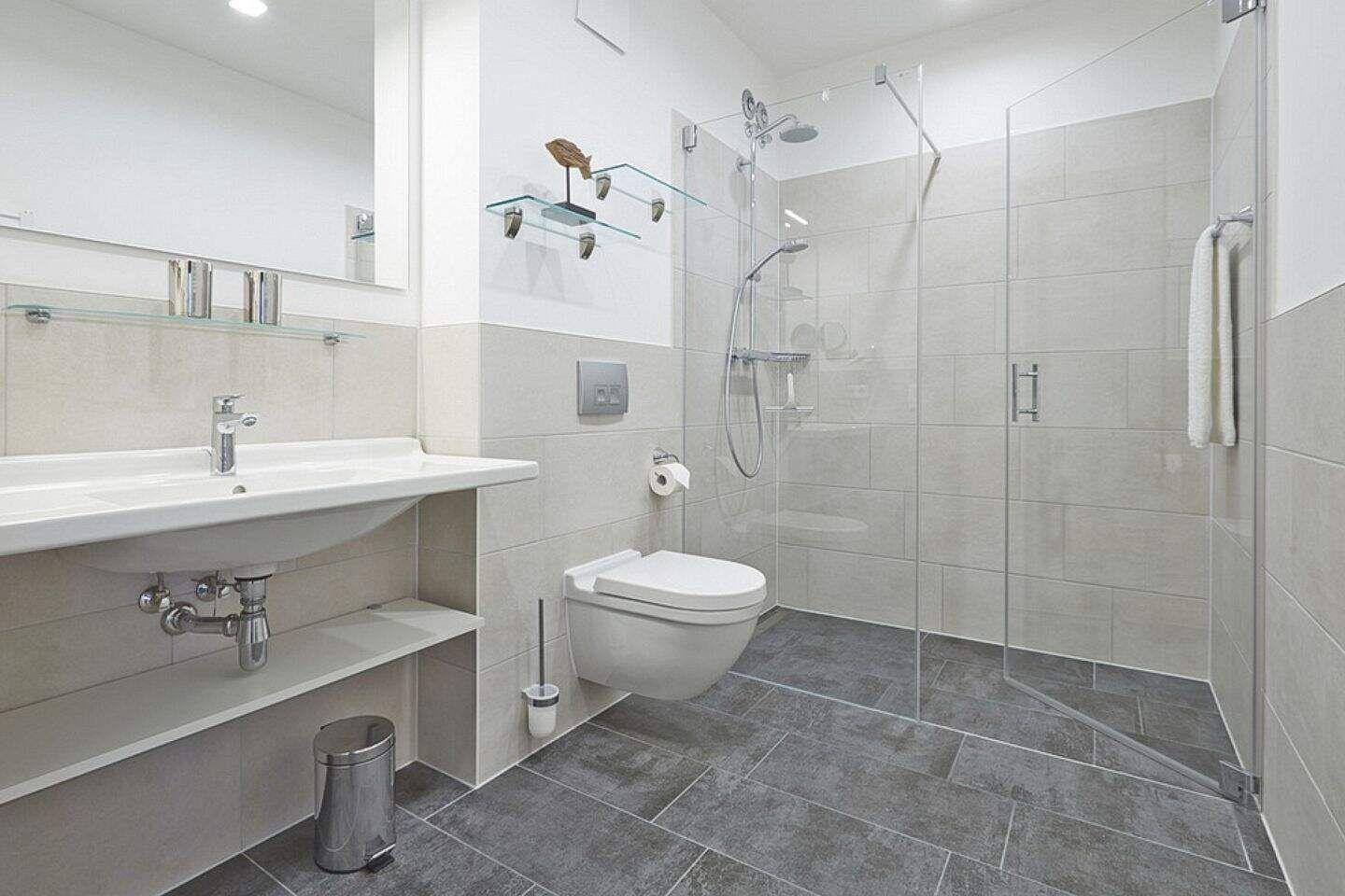 Die offene Regendusche ist das Highlight der Wohnung. Das Badezimmer ist ausgestattet mit einem Handtuchwärmer, einem Waschtisch mit Kosmetikspiegel und einem Haartrockner.