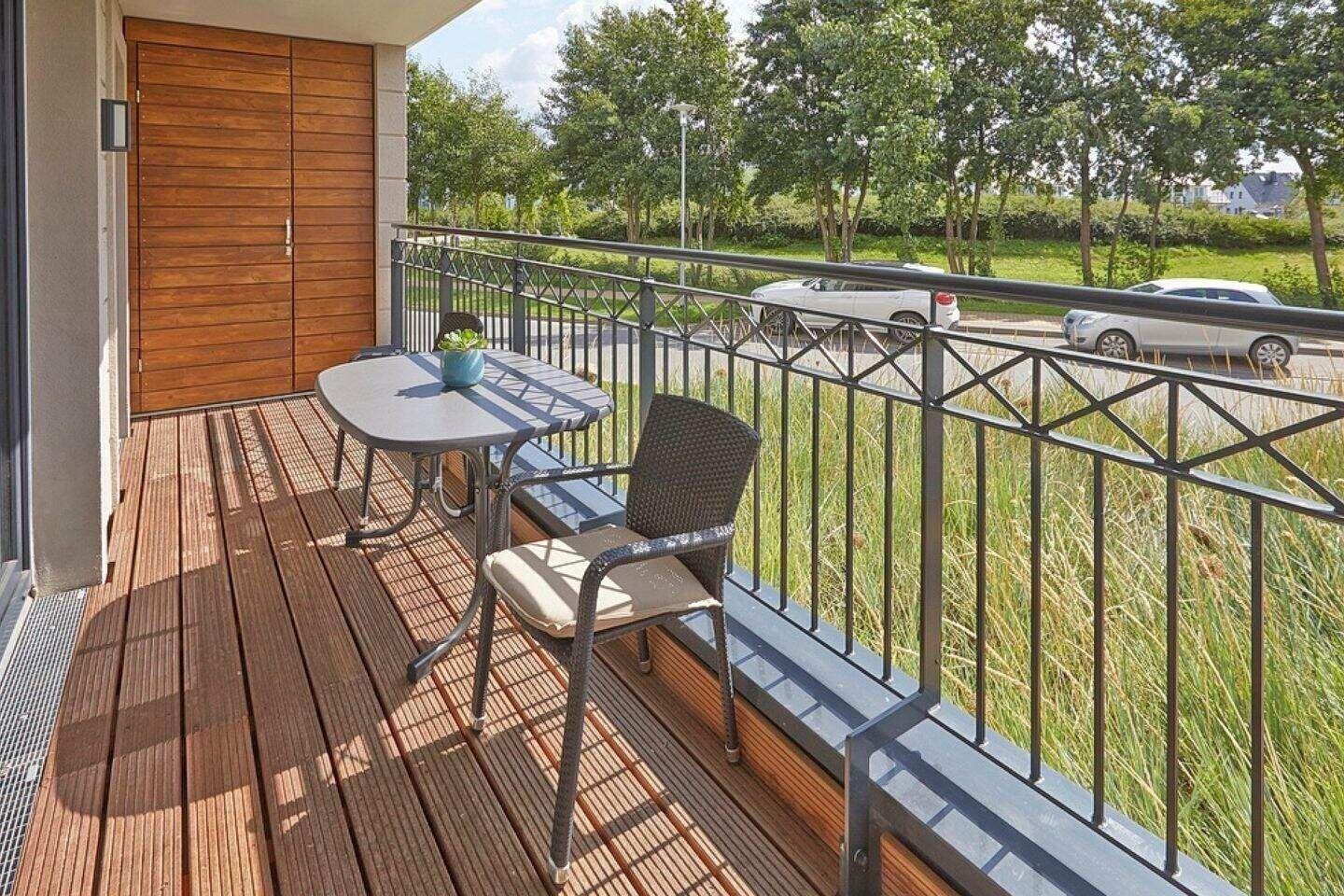 Der überdachte Balkon ist sowohl vom Wohnzimmer als auch vom Schlafzimmer aus begehbar. Natürlich stehen Ihnen hier auch Terrassenmöbel zur Verfügung, sodass Sie beispielsweise Ihr Frühstück oder Ihr Abendessen ganz privat im Sonnenschein zu sich nehmen können. Die Waterkant Suites liegen an der Promenade in Börgerende und somit direkt am Meer.