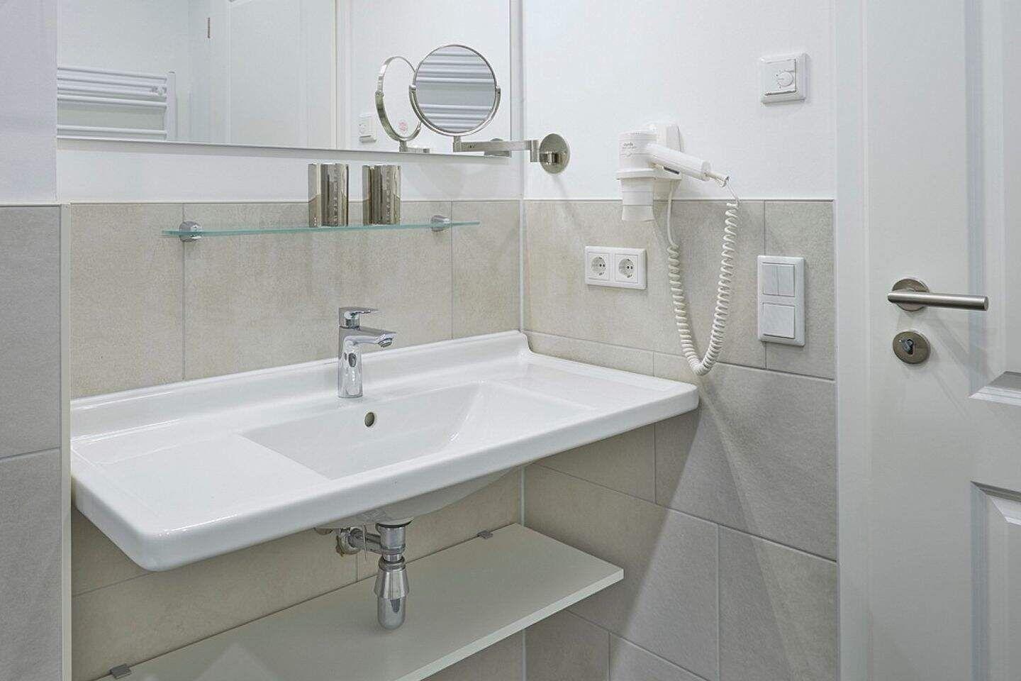 Die offene Regendusche ist das Highlight des Badezimmers. Es ist weiterhin ausgestattet mit einem Handtuchwärmer, einem Waschtisch mit Kosmetikspiegel und einem Haartrockner.