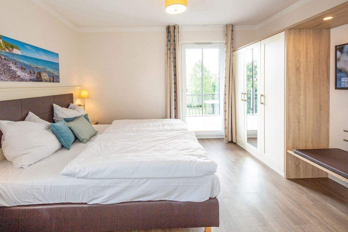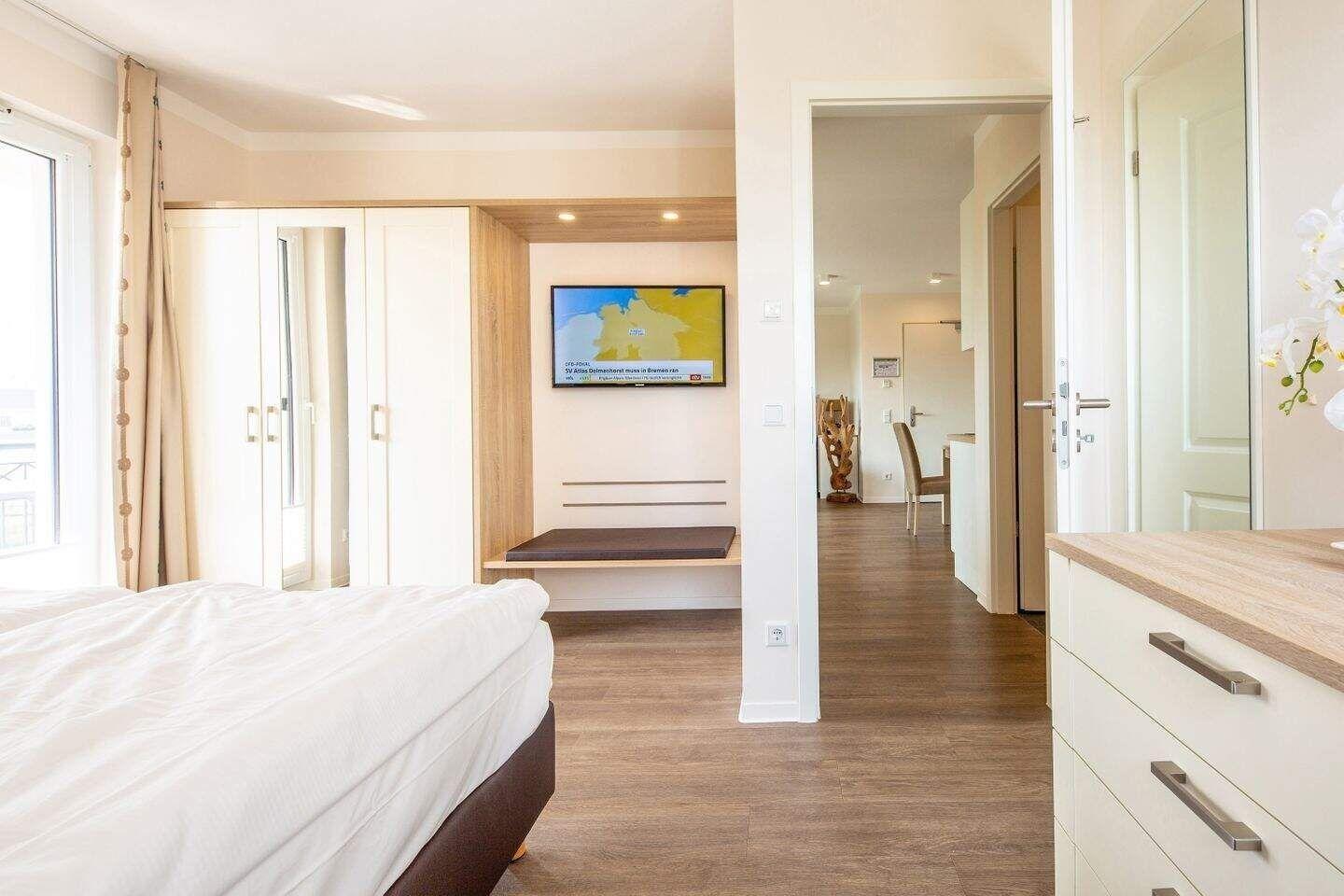Das separate Schlafzimmer ist mit einem weiteren Flatscreen-TV, einer zusätzlichen Kommode, einem Schranksafe, sowie einem modernen Boxspringbett (1,80m x 2,10m) ausgestattet. Ein Kinderbett kann gegen Entgelt aufgestellt werden.