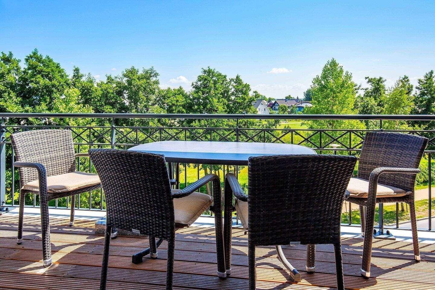 Genießen Sie den von beiden Zimmern begehbaren sonnigen großen Süd-Balkon mit seitlichem Blick auf die Ostsee und auf die neben dem Hotel gelegene gepflegte Parkanlage.