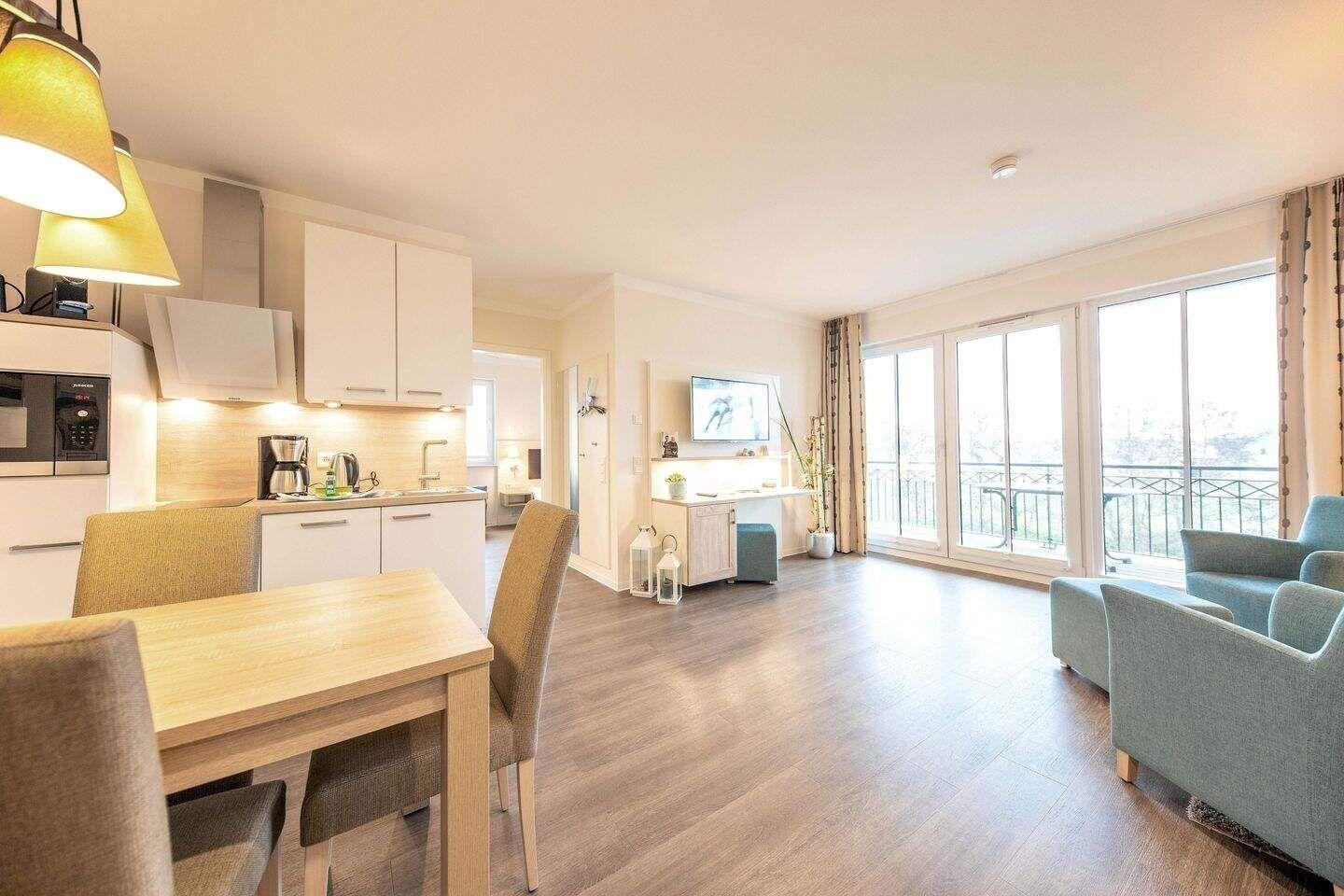 Mit 58 m² gehört die Suite 2-50 zu den größten Zweiraumapartments im Waterkant Aparthotel und ist für bis zu 4 Personen geeignet. Das Apartment befindet sich im zweiten Obergeschoss vom vorgelagerten Ostgebäude und ist bequem mit dem Fahrstuhl erreichbar. Dieser Gebäudebereich hat einen zusätzlichen separaten Eingang.